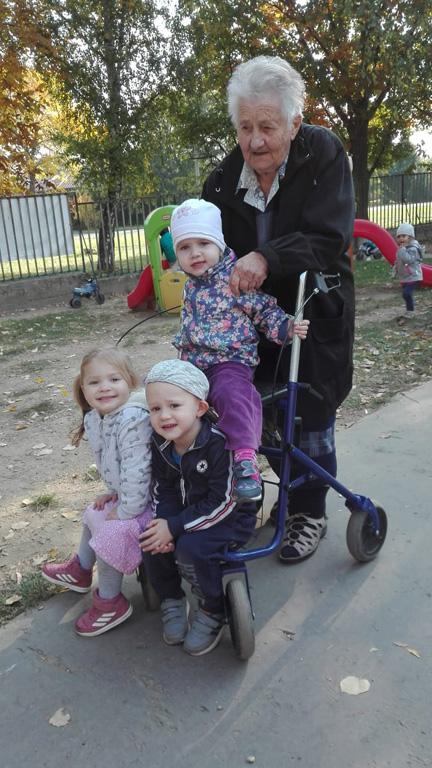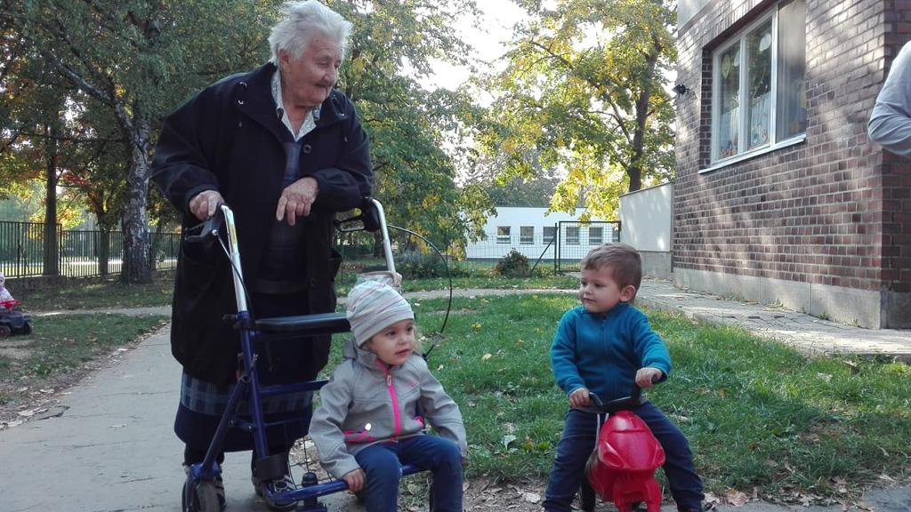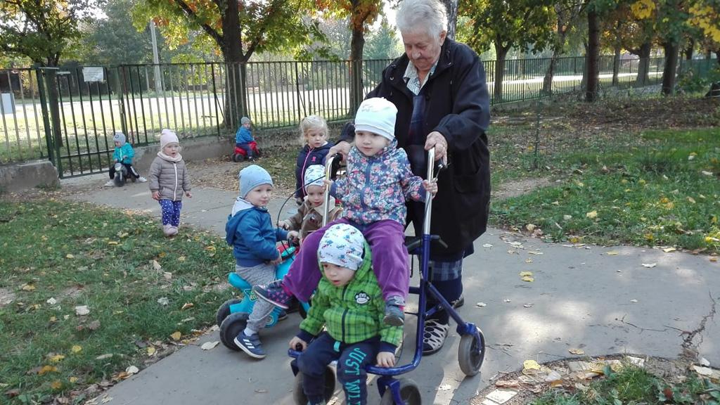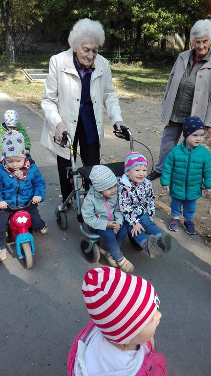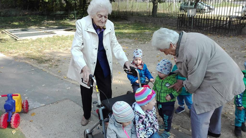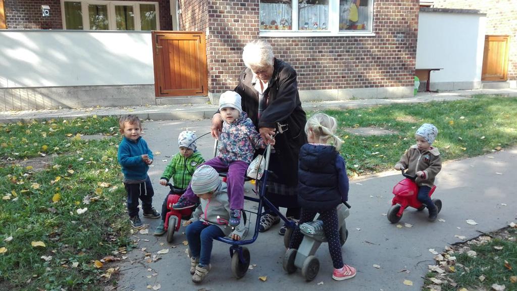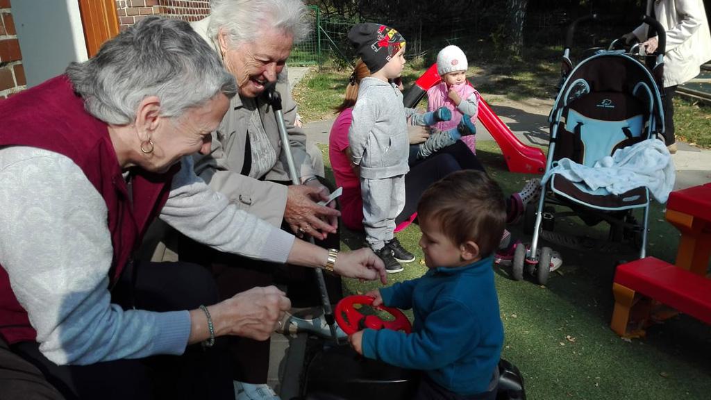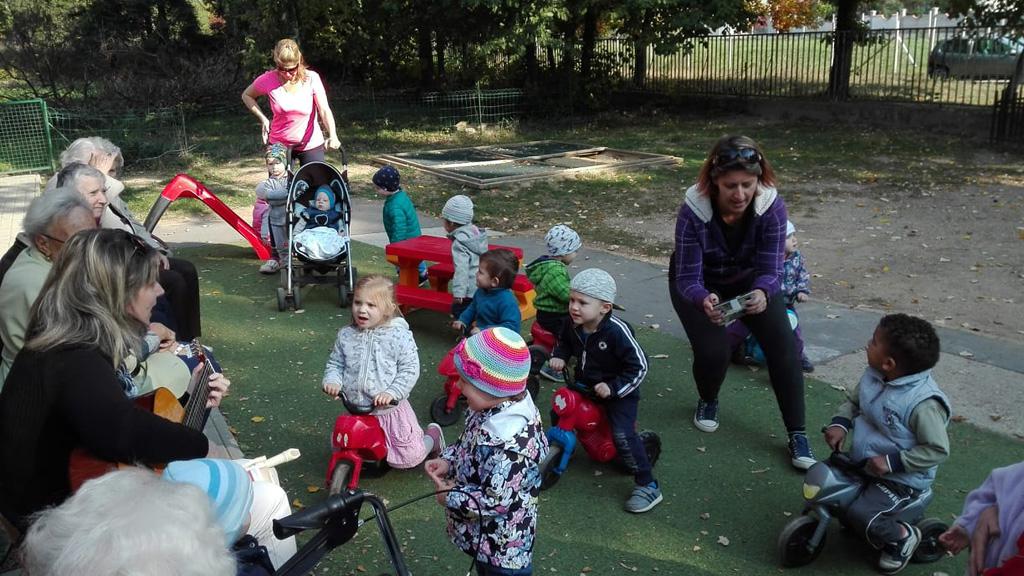 Torma-Hasza Mónika lelkésznő vezetésével közös áhítaton vehettünk részt a napsütéses őszi délelőttön, s a sok szép éneket követően a játék sem maradhatott el. A gyerekek nagy érdeklődéssel próbálták ki az idősek rolátorait. Önfeledten játszott együtt kicsi és nagy.