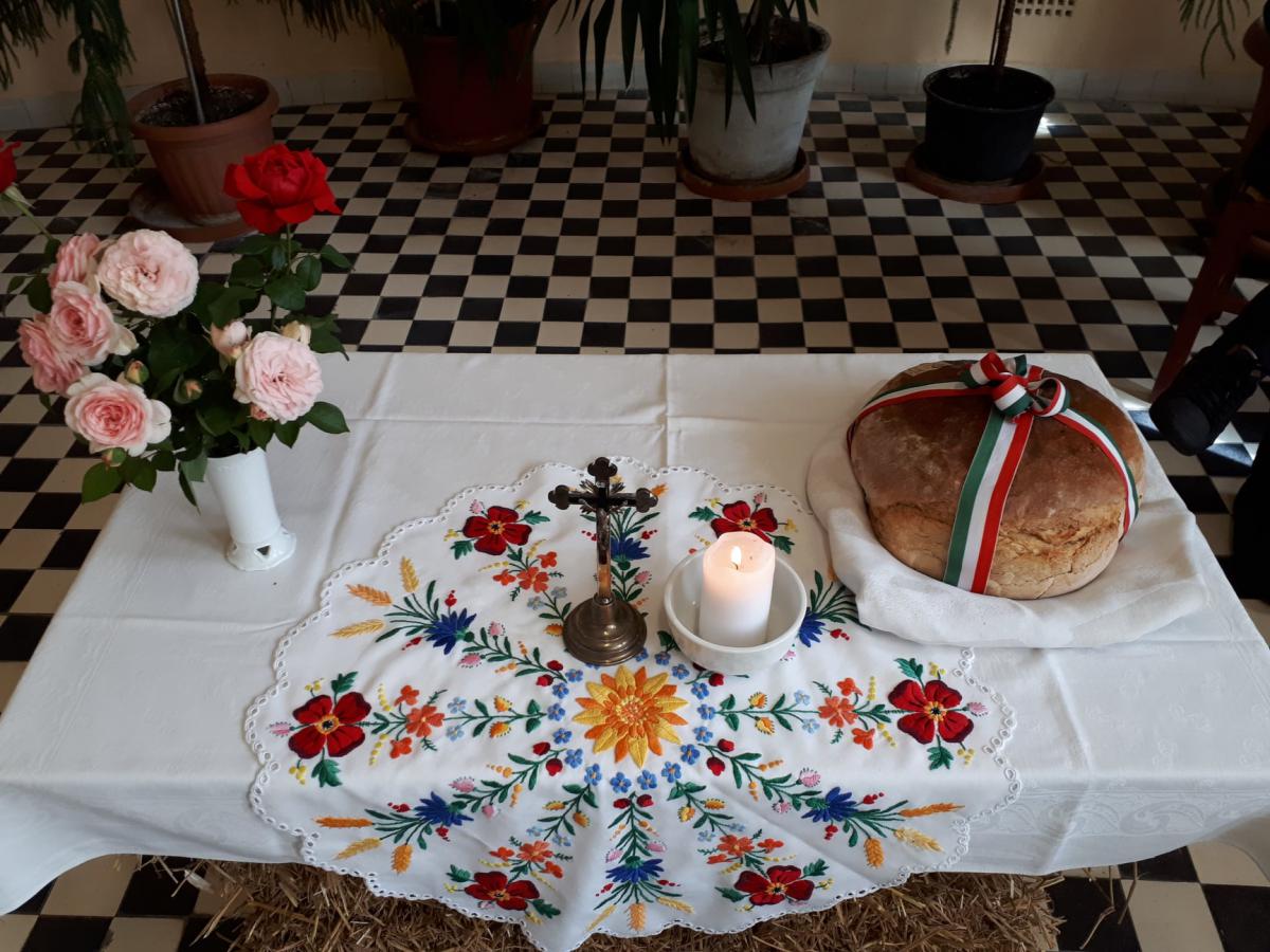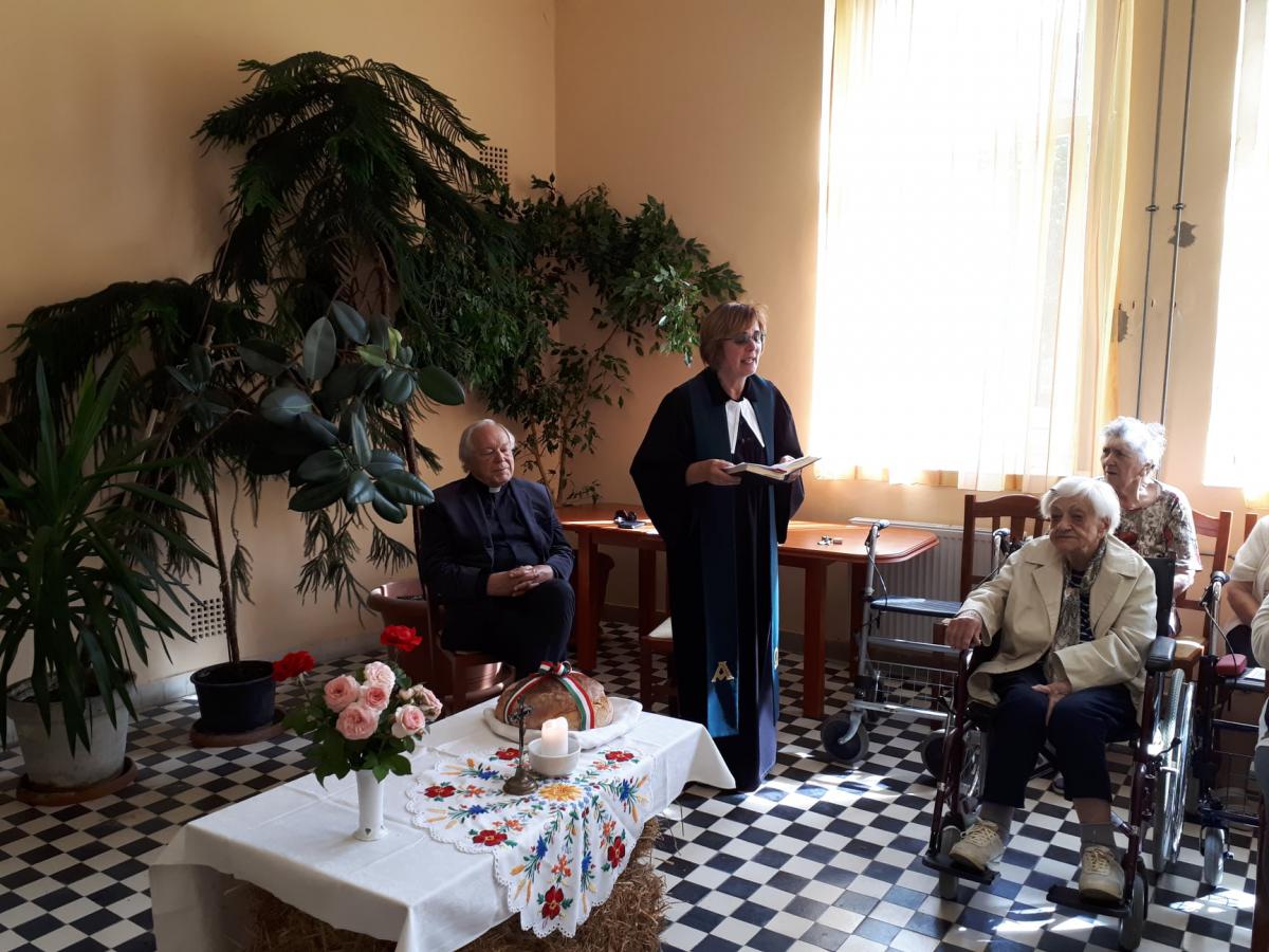 Az istentiszteleten az idős és a fogyatékkal élő lakók is részt vettek. Az ünnepi liturgiát Menyesné Uram Zsuzsanna diakóniai lelkész és Horváth József atya, a szombathelyi Szent Kereszt lelkészség lelkipásztora, pápai prelátus vezették. Az igehirdetés szolgálatát József atya látta el, majd az istentiszteletet követően a lelkésznővel együtt, közösen áldották meg az idén learatott gabonából készített, oltárra helyezett új kenyeret. A megáldott kenyérből a hívek is vihettek a maguk és hozzátartozóik számára, s jutott belőle a Túróczy Szeretetotthon lakóinak is.
