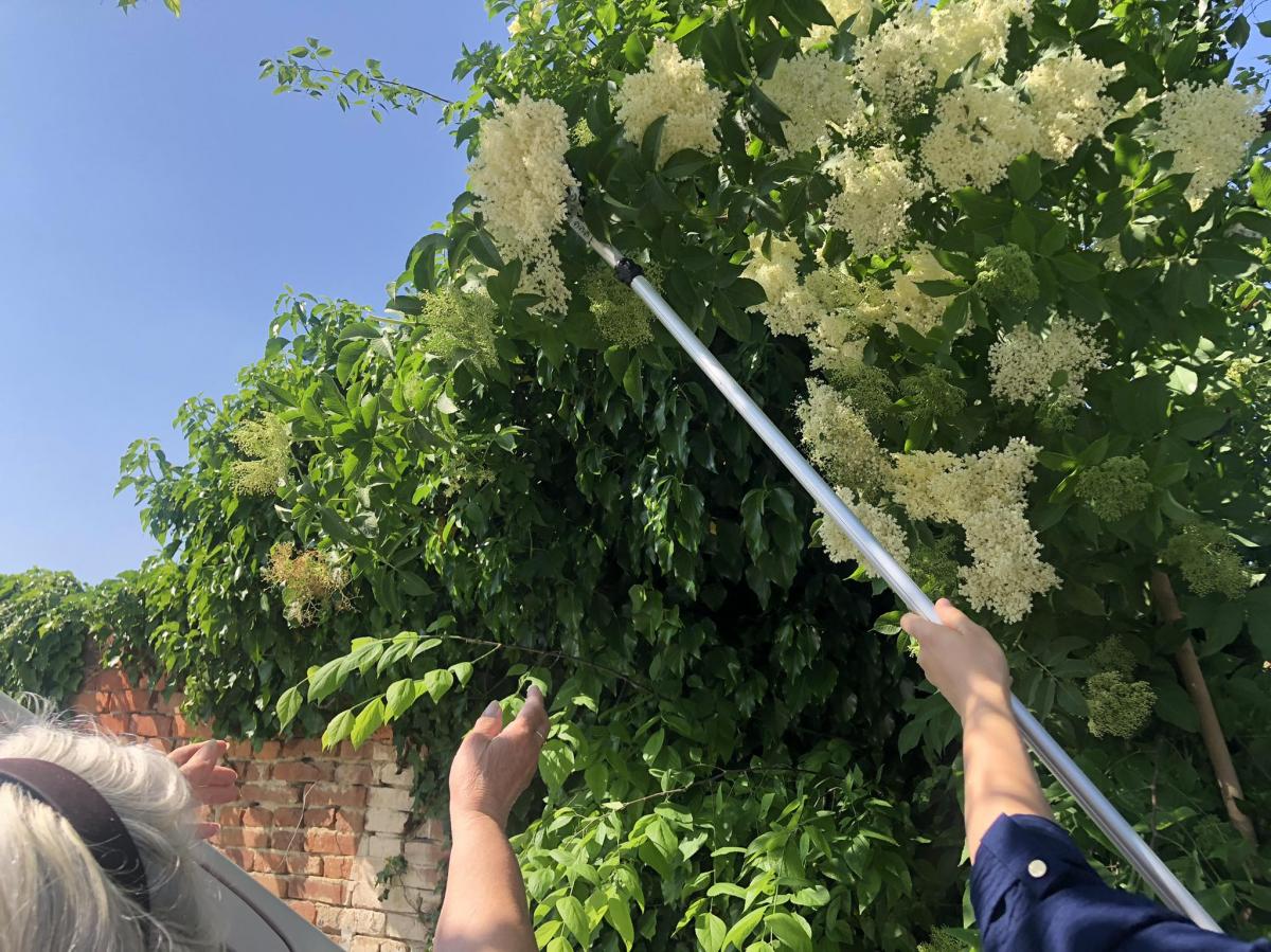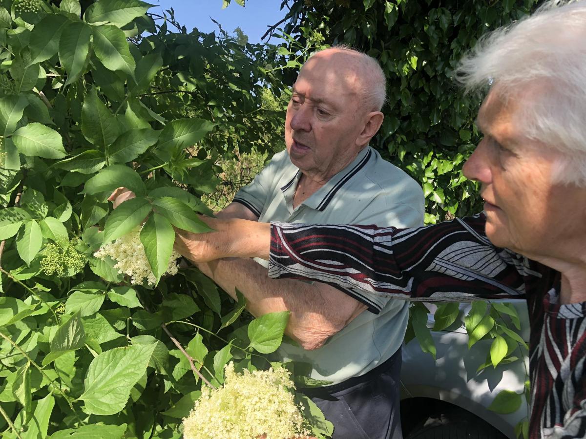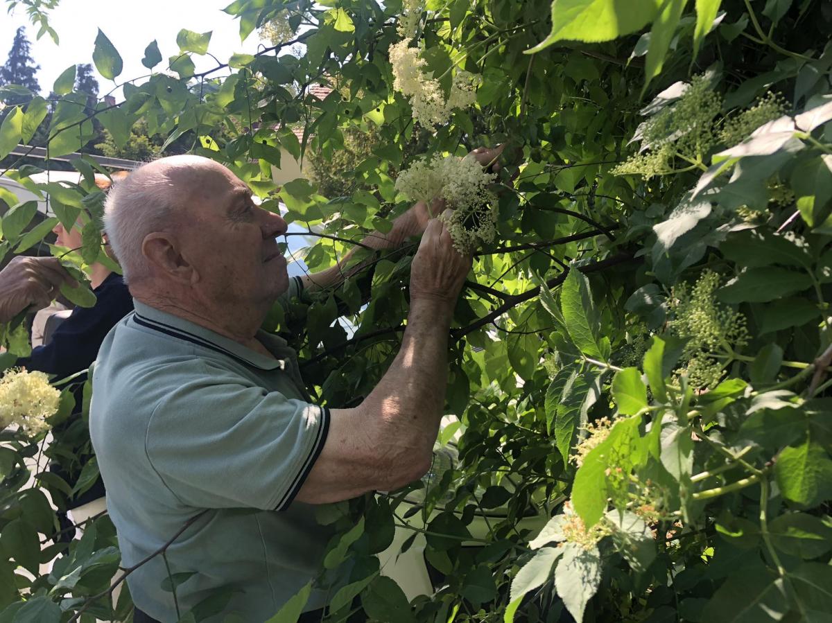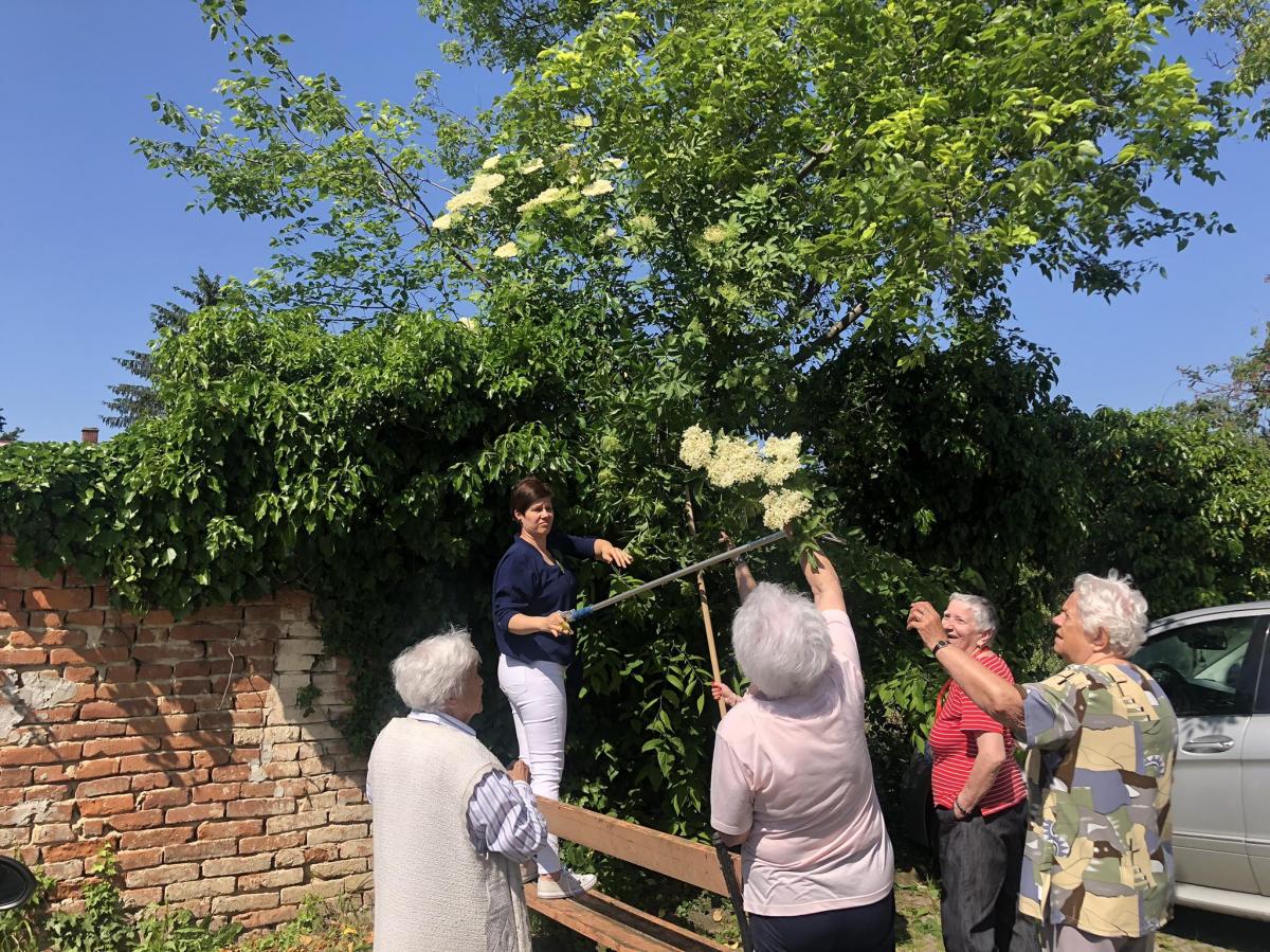 A ma reggeli áhítat után pedig az udvaron található néhány bodzabokrot is leszüreteltük. A könnyen elérhető virágokat villámgyorsan leszedték a szépkorúak, a magasabban lévőket pedig teleszkópos metszőolló segítségével sikerült elérni. A bodzaszedés igazi csapatmunka volt, a munka jutalma a virágokból készült szörp lesz. Meleg nyári napokon kiváló hűsítő készül majd belőle a Túróczy Zoltán Szeretetotthon, és a Johanneum lakói számára.