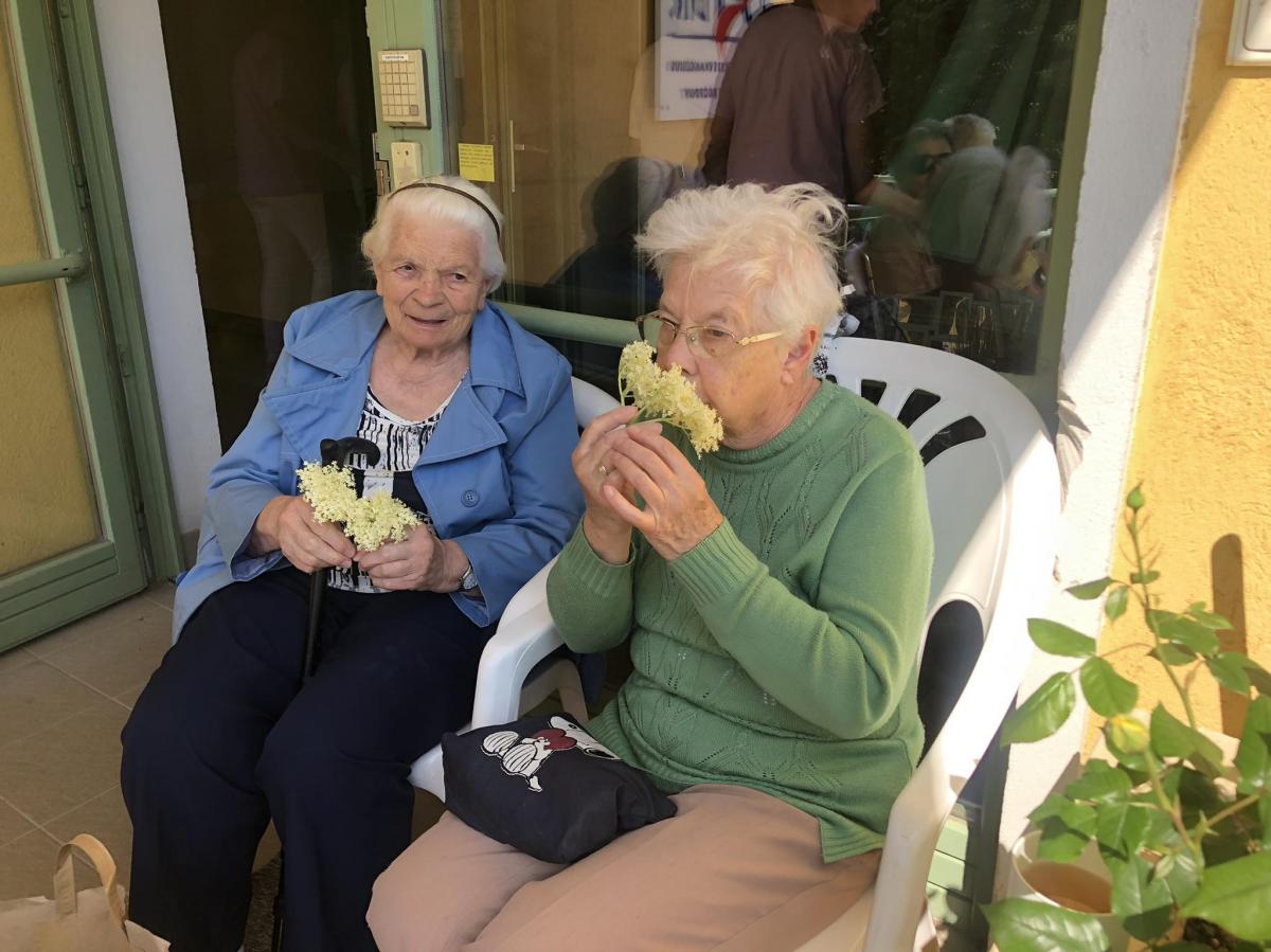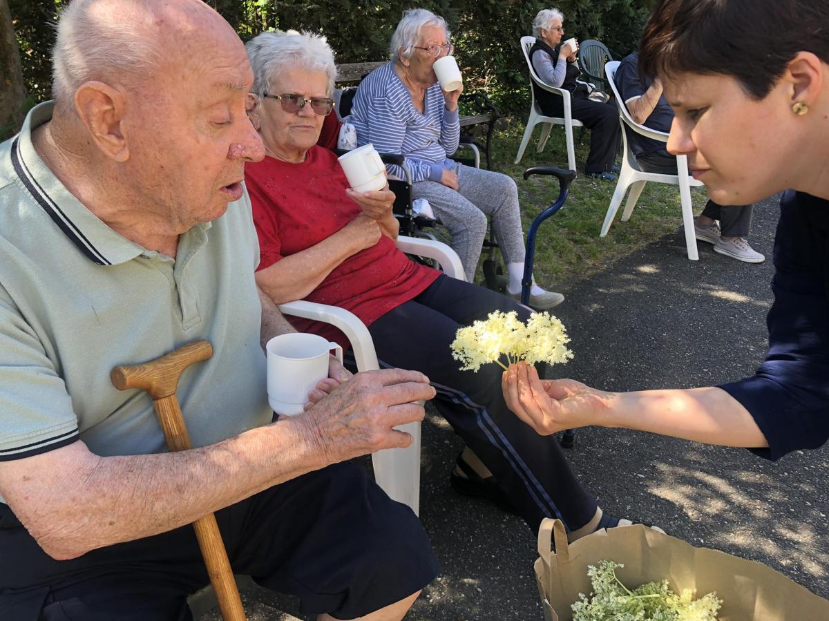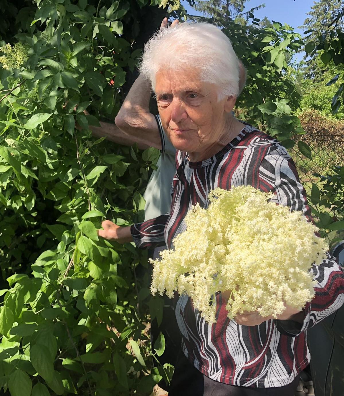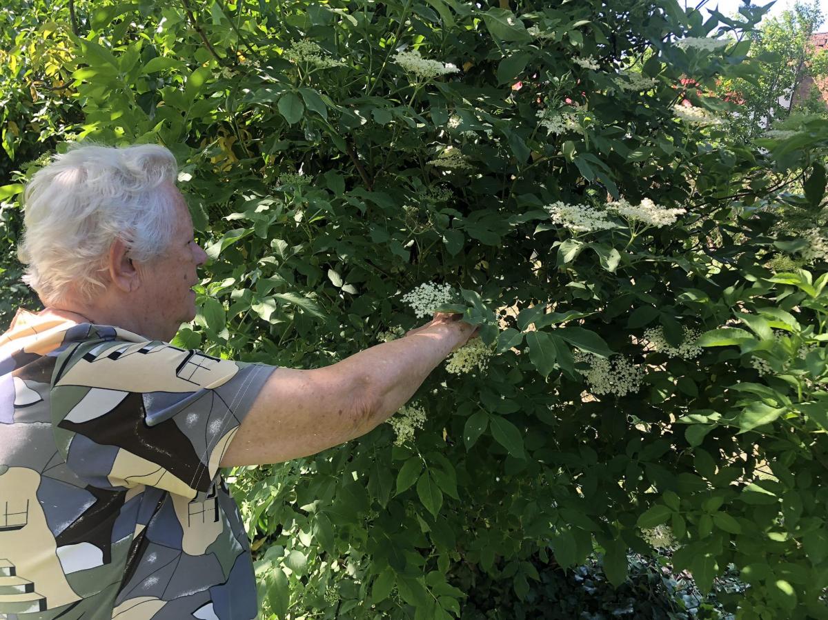 A ma reggeli áhítat után pedig az udvaron található néhány bodzabokrot is leszüreteltük. A könnyen elérhető virágokat villámgyorsan leszedték a szépkorúak, a magasabban lévőket pedig teleszkópos metszőolló segítségével sikerült elérni. A bodzaszedés igazi csapatmunka volt, a munka jutalma a virágokból készült szörp lesz. Meleg nyári napokon kiváló hűsítő készül majd belőle a Túróczy Zoltán Szeretetotthon, és a Johanneum lakói számára.