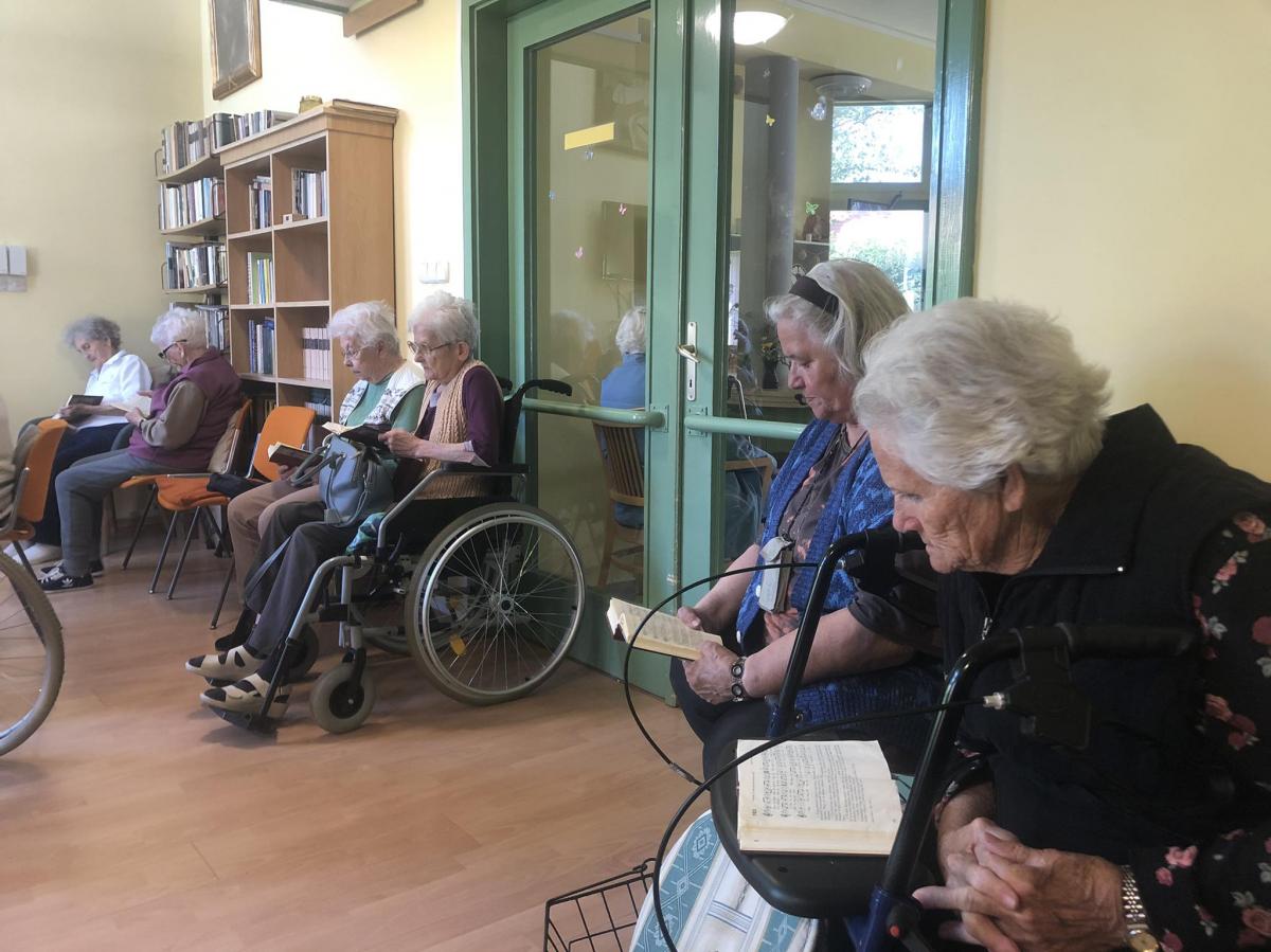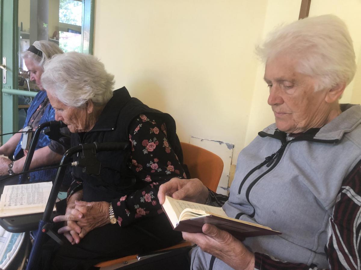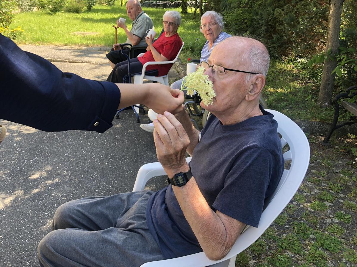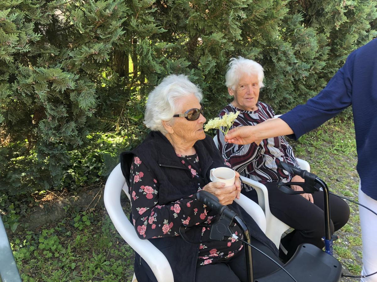 A ma reggeli áhítat után pedig az udvaron található néhány bodzabokrot is leszüreteltük. A könnyen elérhető virágokat villámgyorsan leszedték a szépkorúak, a magasabban lévőket pedig teleszkópos metszőolló segítségével sikerült elérni. A bodzaszedés igazi csapatmunka volt, a munka jutalma a virágokból készült szörp lesz. Meleg nyári napokon kiváló hűsítő készül majd belőle a Túróczy Zoltán Szeretetotthon, és a Johanneum lakói számára.