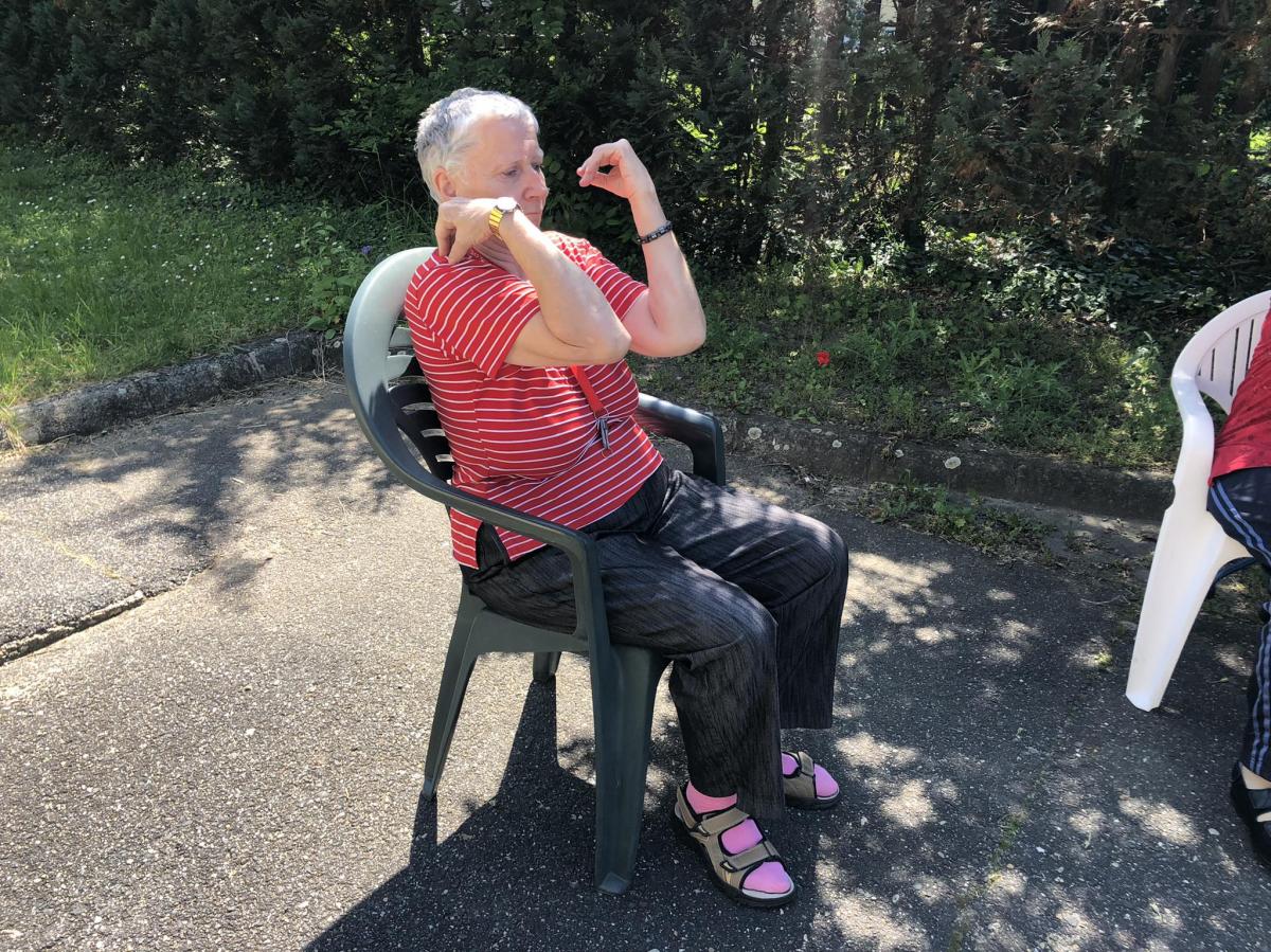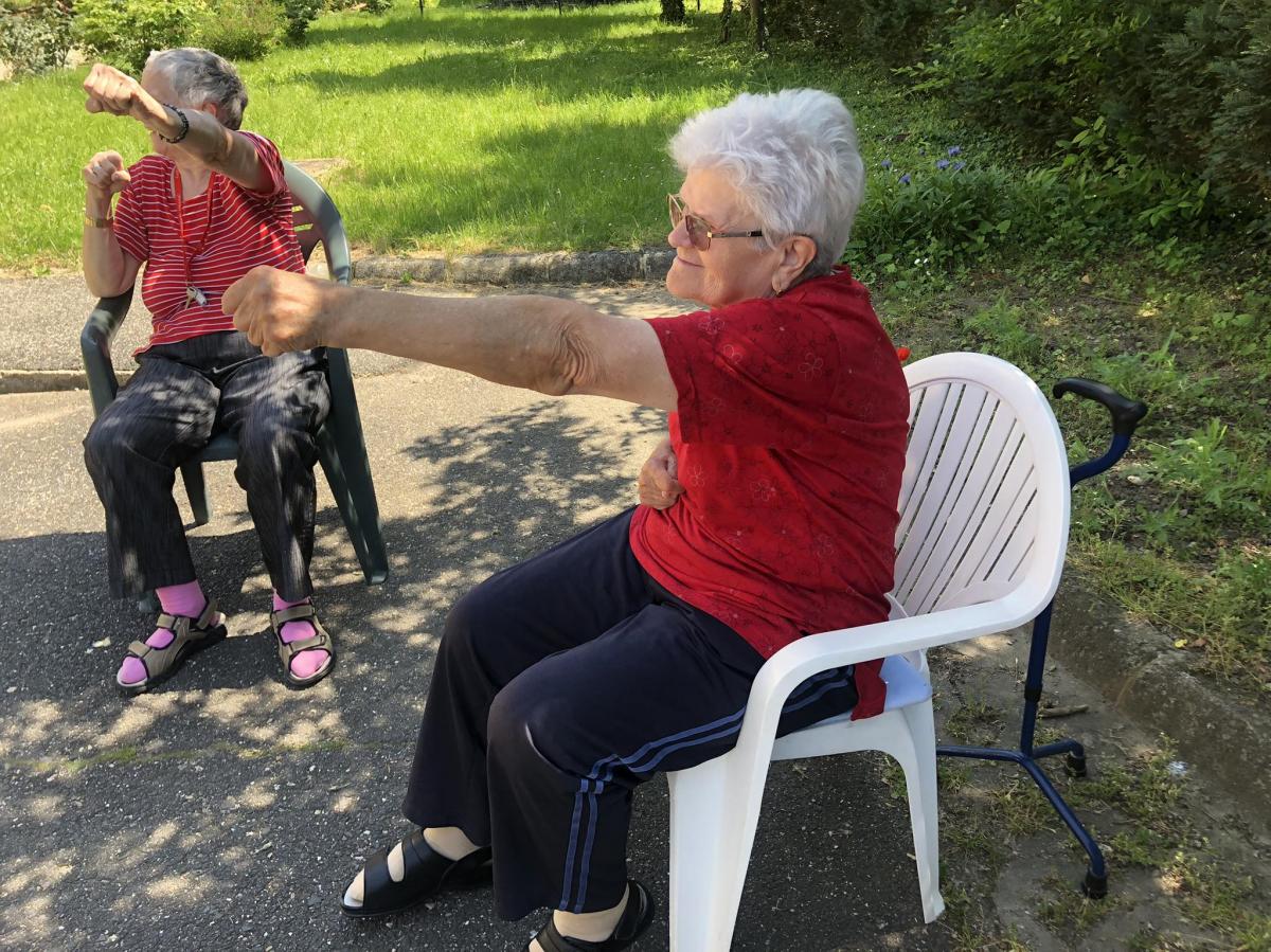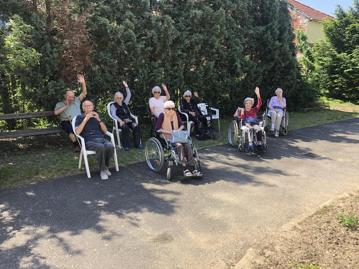A dolgos percek után Fábiánné Domján Mária mentálhigiénés munkatársunk átmozgató tornára invitálta lakóinkat, és az udvaron beszélgettek a közelgő pünkösd történetéről, üzenetéről.