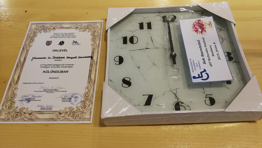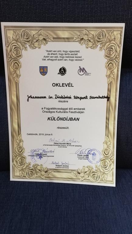 Idén mi egy csoportos tánccal vettük részt a társastánc kategóriában. Most is nagy sikerünk volt, meg is lett az eredménye, mert idén KÜLÖNDÍJASOK lettünk. Emellett az egyik lakónk, Pocok a tánc végén egy megható anyák napi verset szavalt el. Ő a bátorsága miatt Különdíjat kapott, arcán megjelent a büszkeség, hogy versét díjazták. Boldogan térhettünk haza.