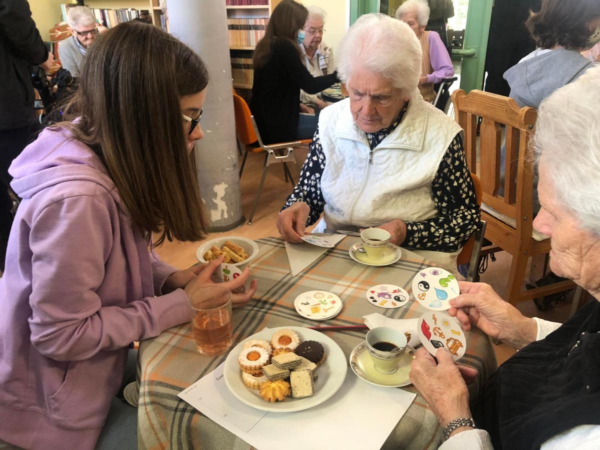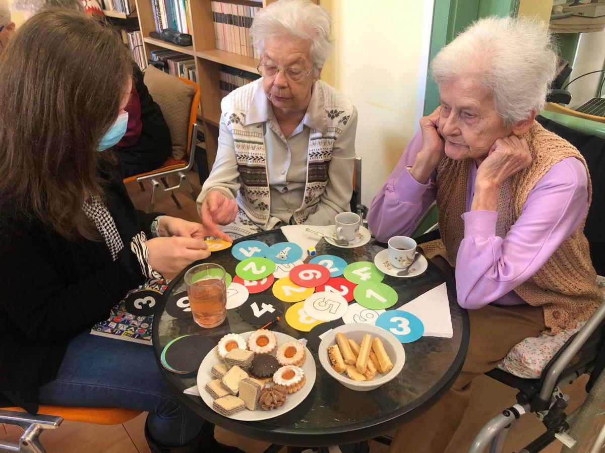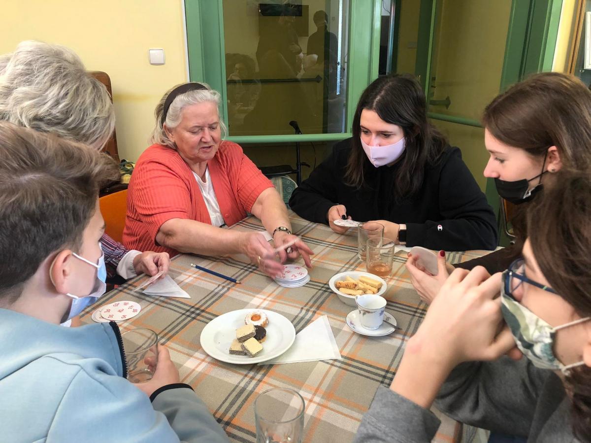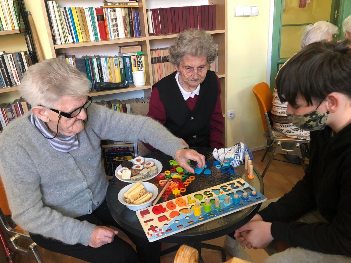 Az idősek nagyon jó házigazdáknak bizonyultak, rögtön hellyel kínálták a fiatalokat, biztatták őket, hogy vegyenek az asztalokra kitett sütikből.