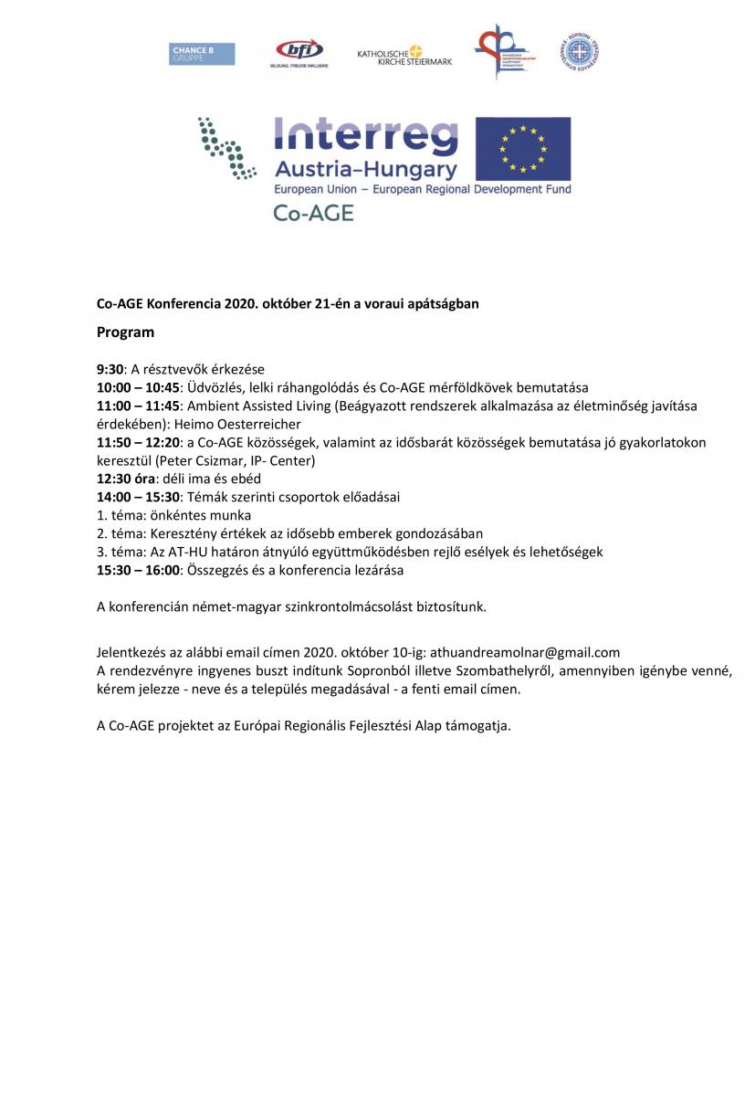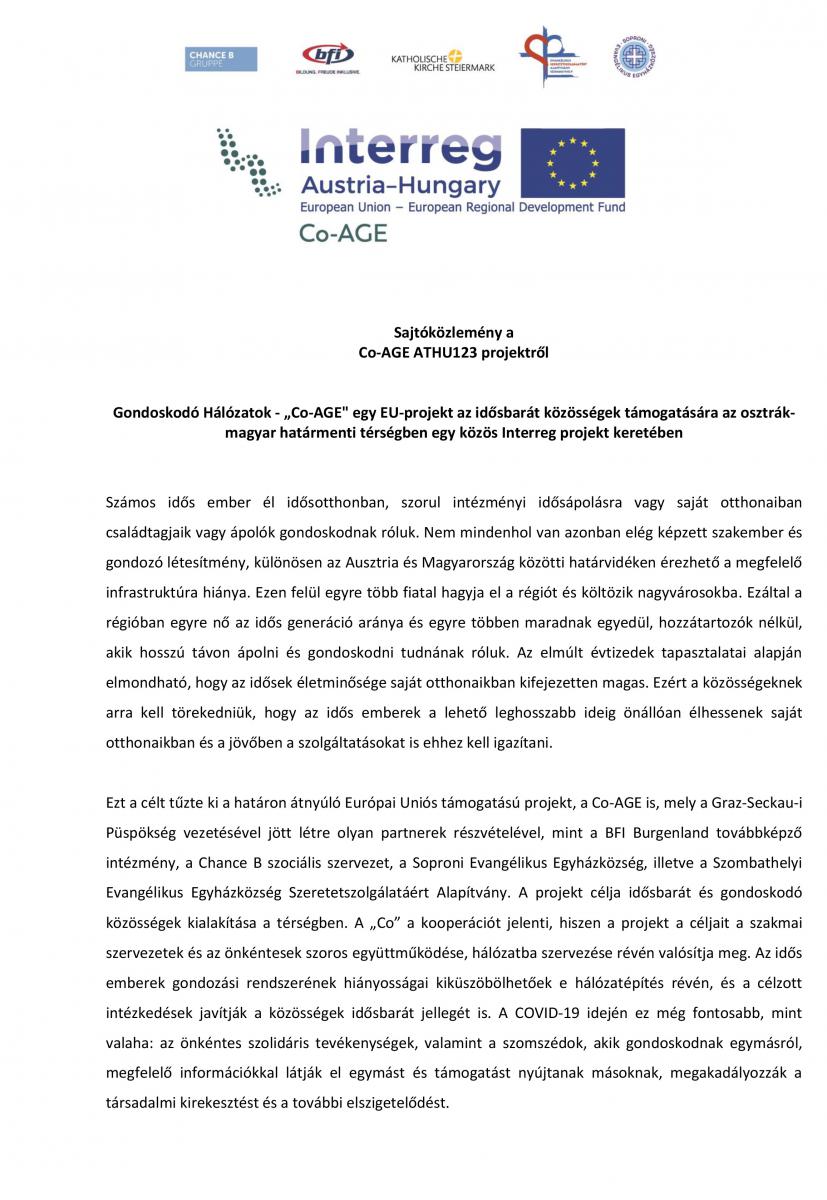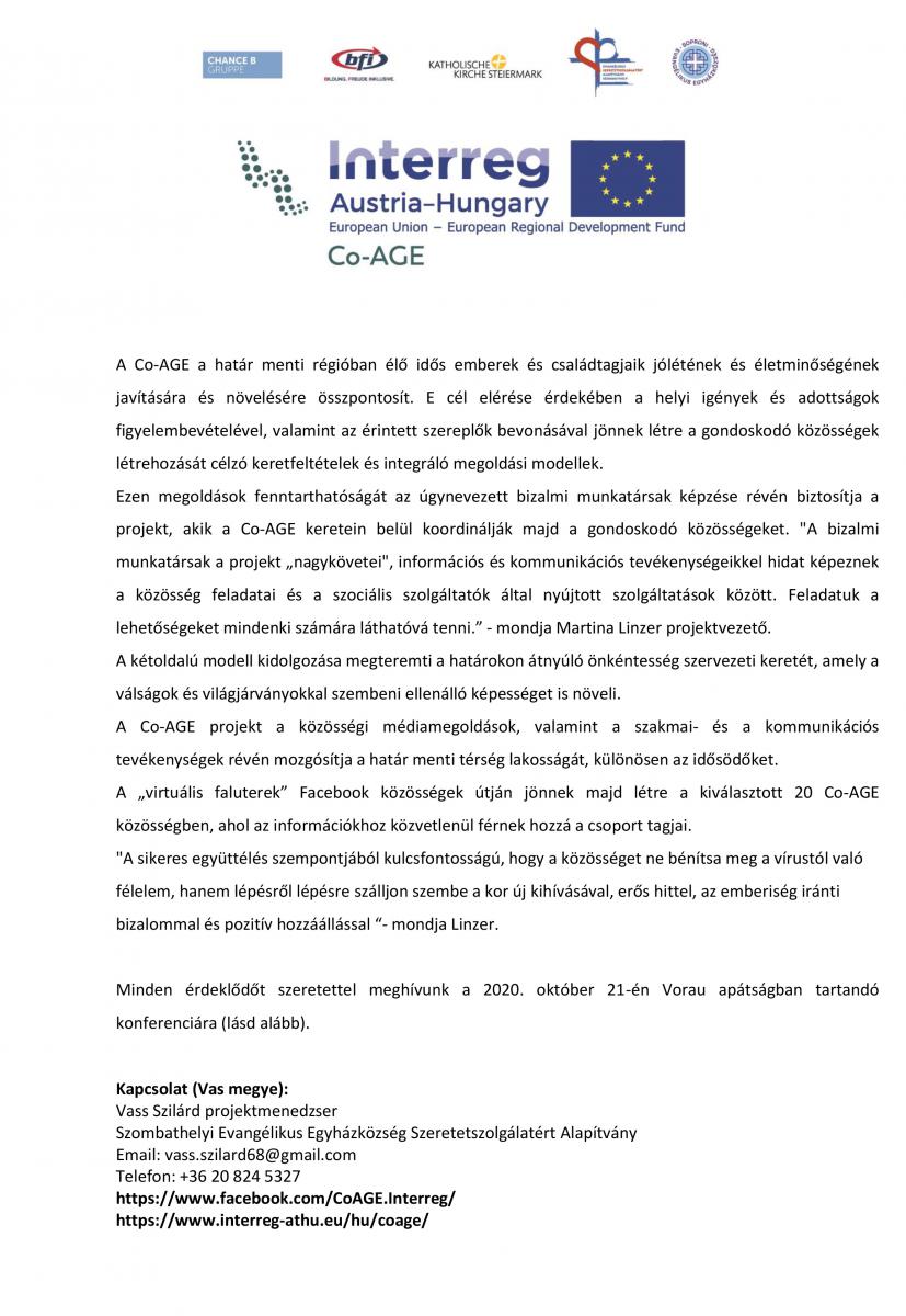 A Szombathelyi Evangélikus Egyházközség Szeretetszolgálatáért Alapítvány részt vesz a Co-AGE nevű Interreg projektben, melynek céljait és a nyitó konferencia programjait olvashatják a következő dokumentumokon: