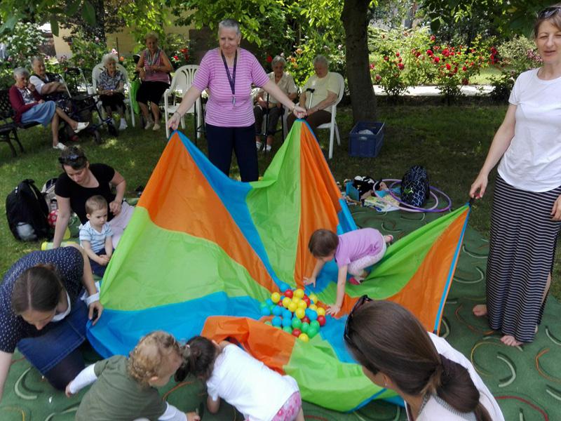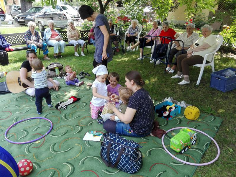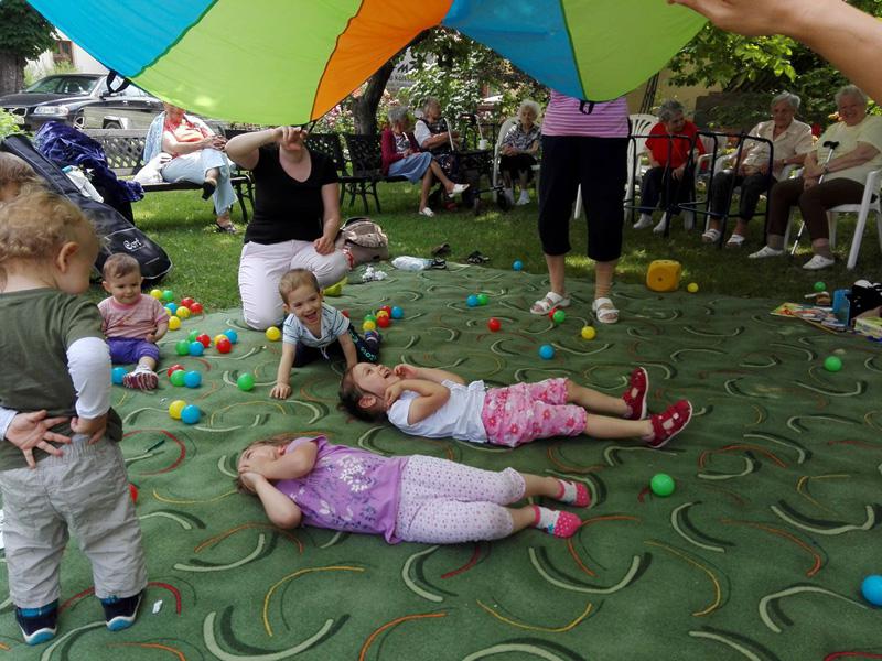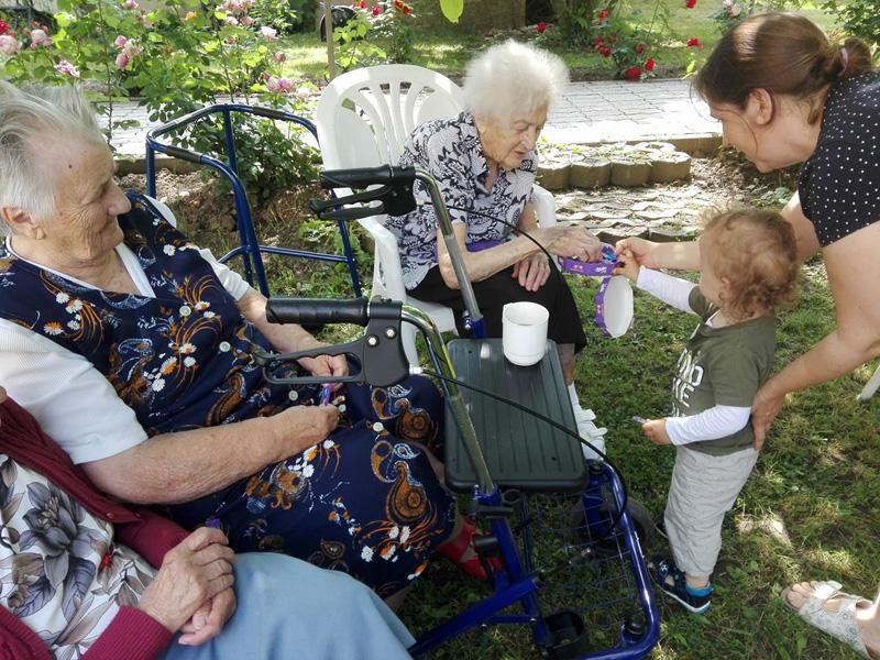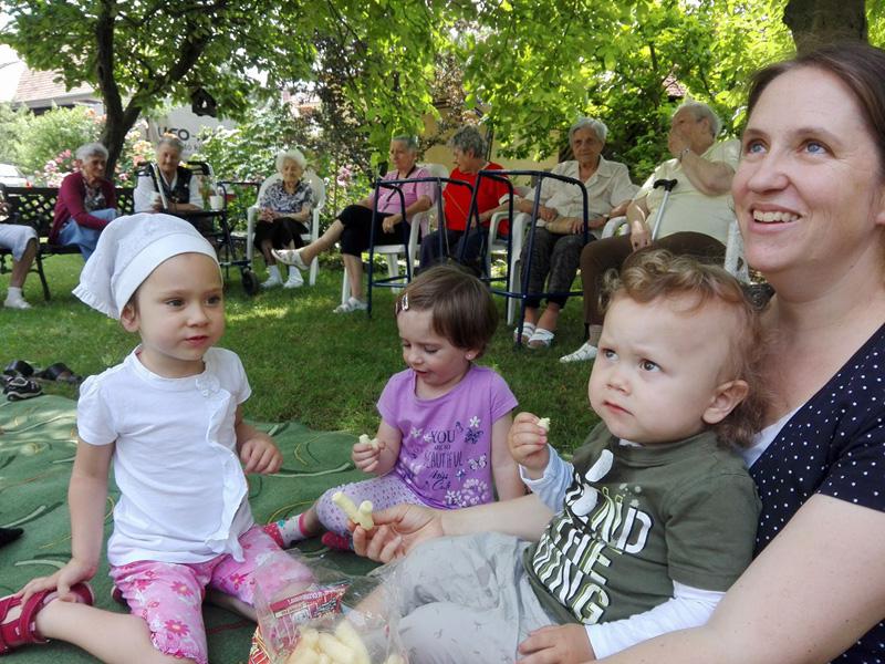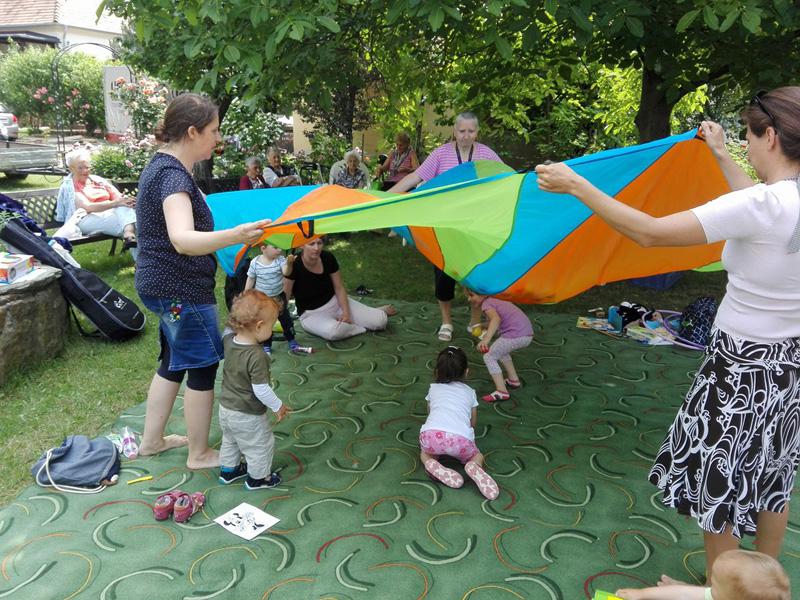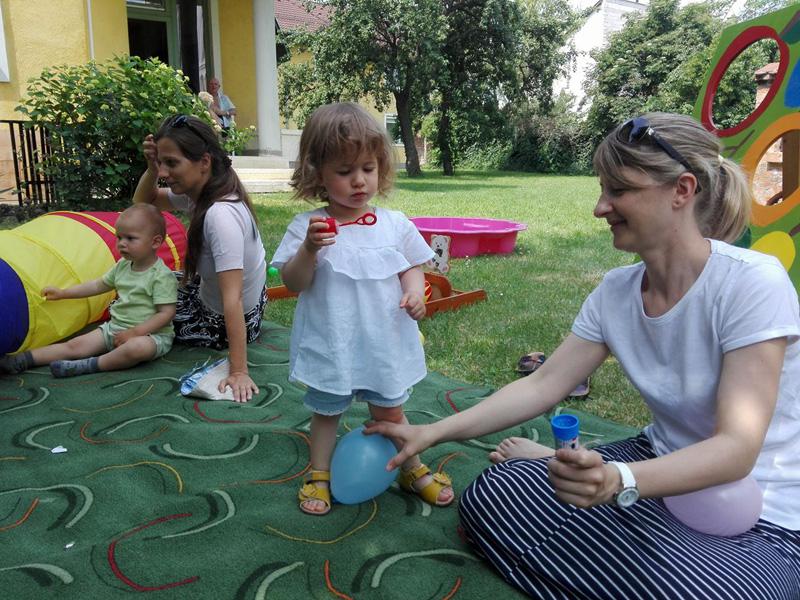 Lakóink a diófa árnyékában várták a kis vendégeket. Színes buborékok, játék, zene, közös áhitat és éneklés tette meghitté a délelőttöt.