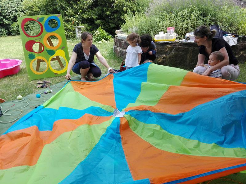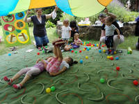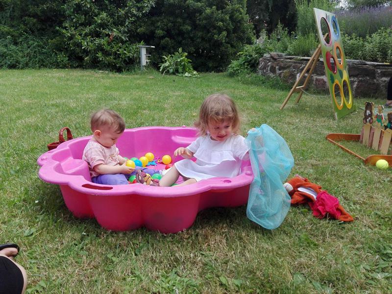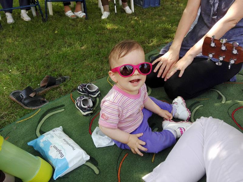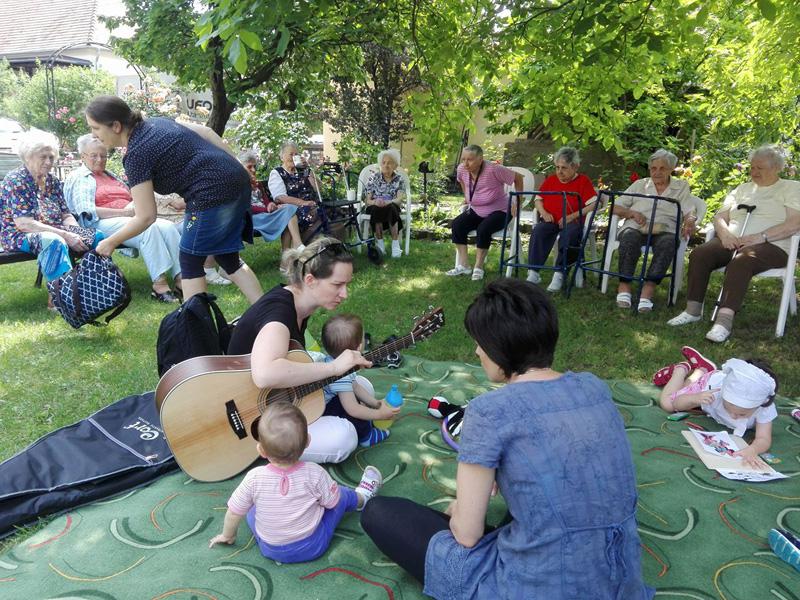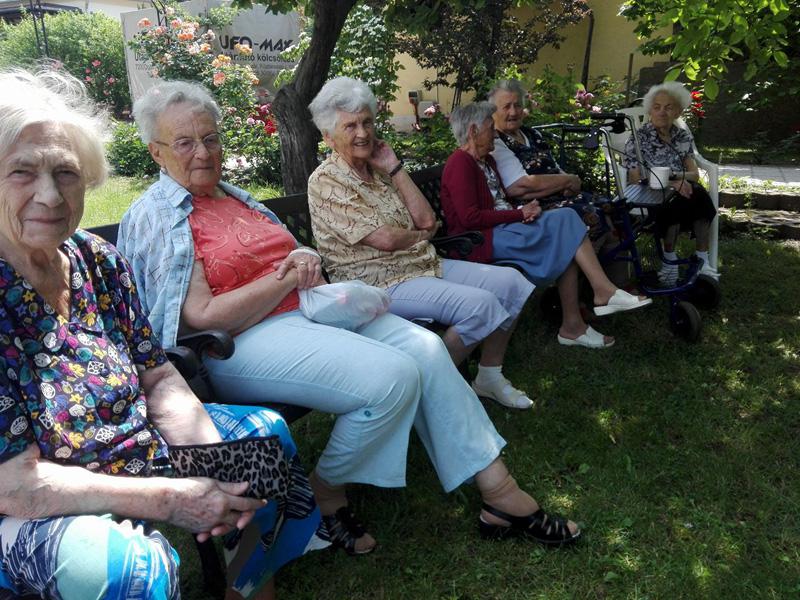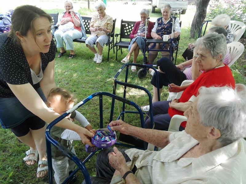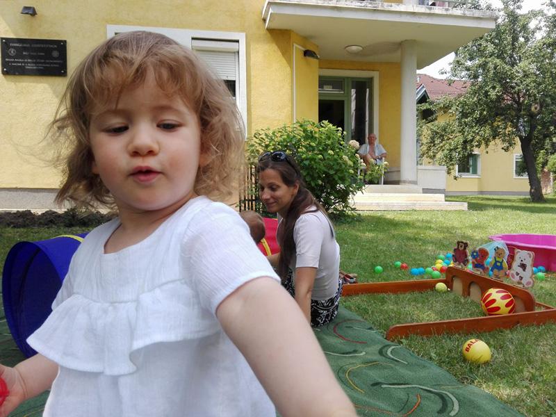 Lakóink a diófa árnyékában várták a kis vendégeket. Színes buborékok, játék, zene, közös áhitat és éneklés tette meghitté a délelőttöt.
