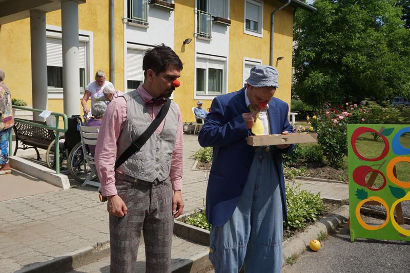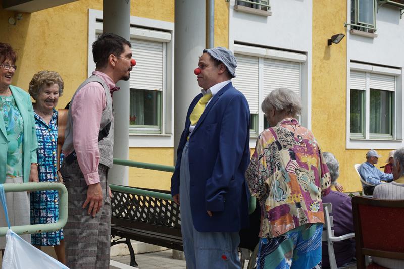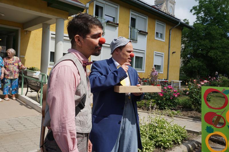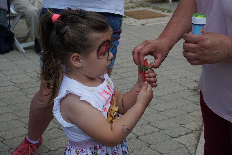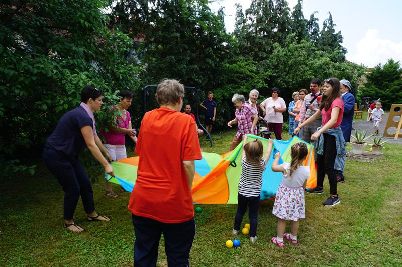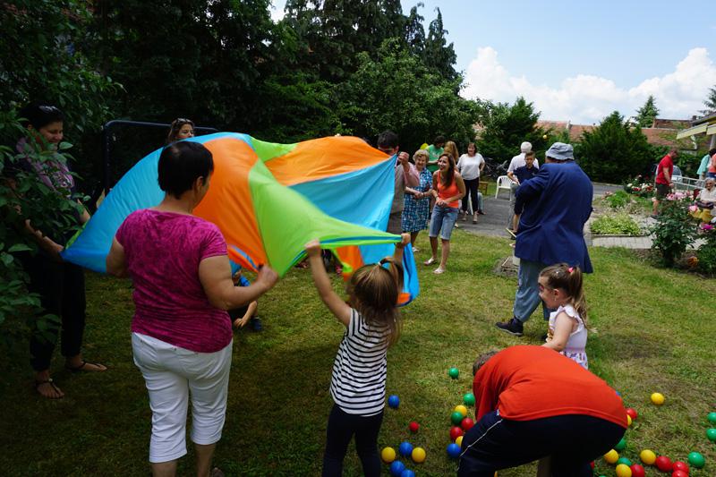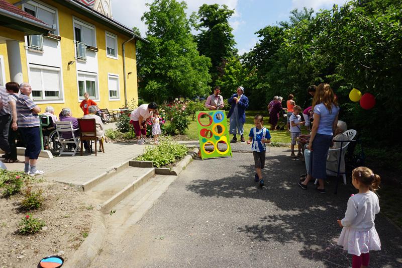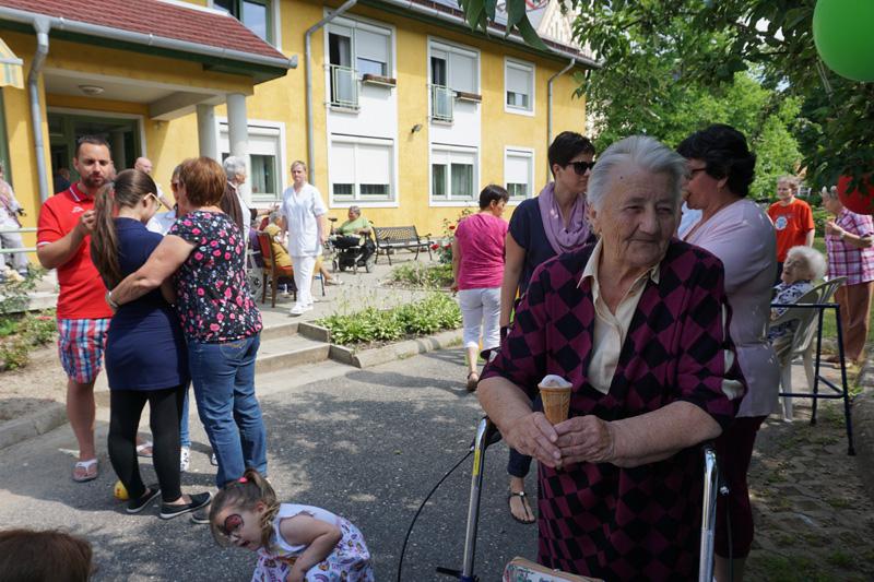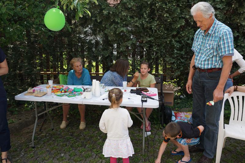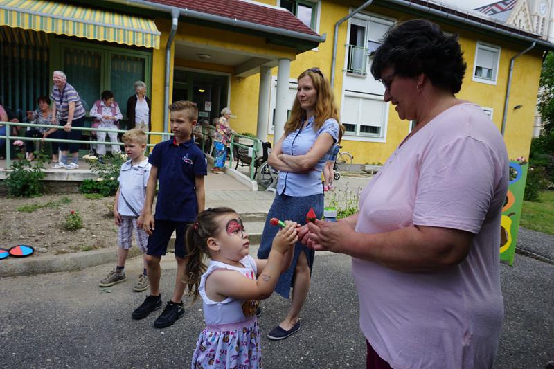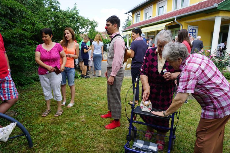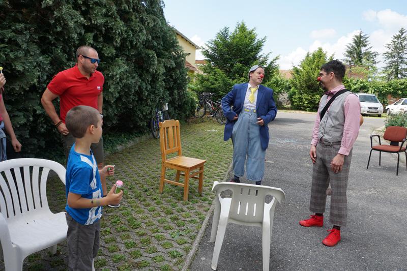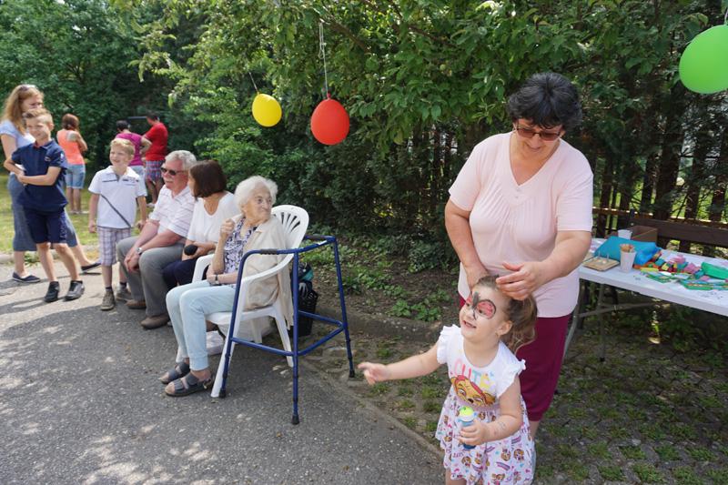 Megtelt az udvar mosolygós gyerekekkel, nagyszülőkkel, boldog dédikkel. Finom fagylalt, arcfestés, célbadobàs, és számos játék várta a vendégeinket. A Dr. Bohóc Mosolyszolgalt két bohóca is ellátogatott hozzánk, akik a legkisebbeket lufiból hajtogatott karddal, virággal ajándékozták meg.