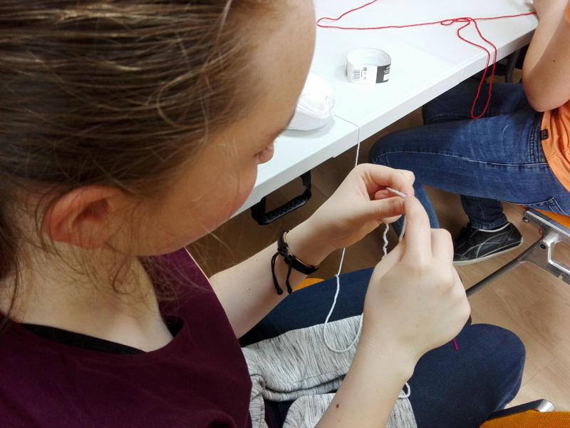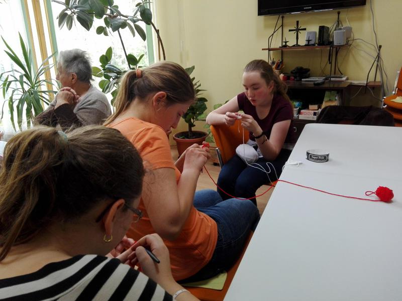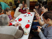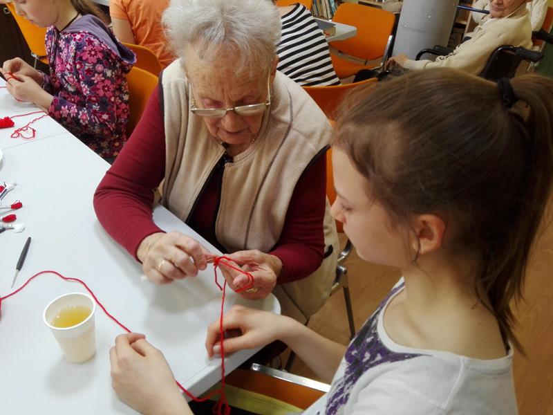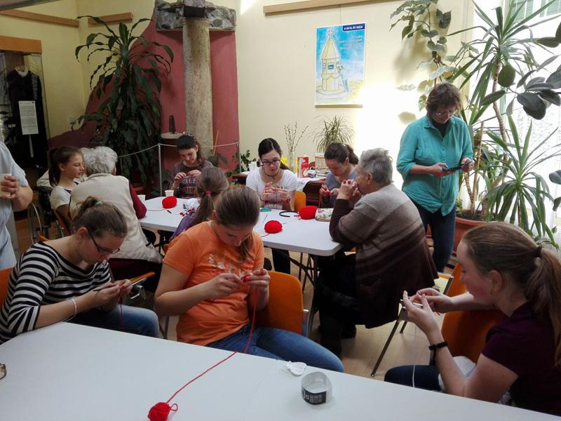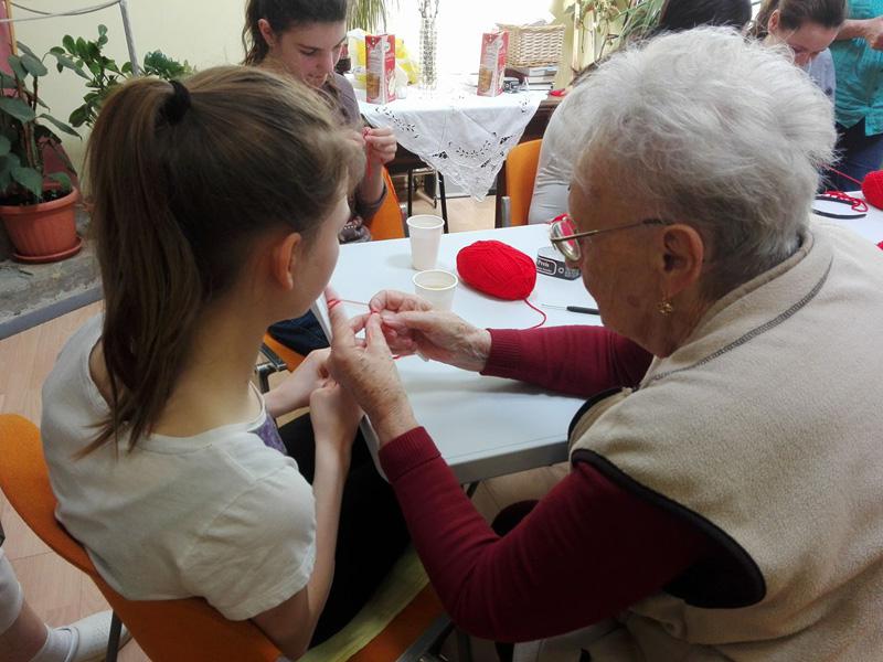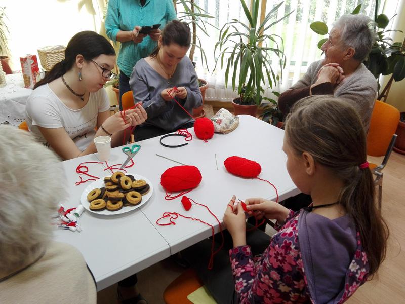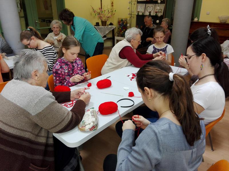 A Túróczy-ház több lakója is tud és szeret horgolni, ezt bizonyítja a sok-sok horgolt karácsonyfadísz is, melyet lakóink készítettek a ház karácsonyfájára. A legidősebb 97 éves Irénke néni is serényen horgol, nagyon precízen és pontosan dolgozik. Sári néni szebbnél-szebb díszeket készít, s teszi szebbé az otthont alkotásaival. Lakóink pedig azt a tudást, melyet szüleiktől, nagyszüleiktől szereztek április 18-án tovább adhatták a Reményik iskola diákjainak, akik Takács Ilona tanárnő vezetésével érkeztek hozzánk. Idős és fiatal kezek együtt és egymást segítve készítettek láncszemsort. A gyermekek megtanulták a rövid pálca, egy és két ráhajtásos pálca fogalmát, s szorgosan gyakoroltak. Az első találkozás a horgoló tűvel sikeresnek bizonyult, hisz a gyermekek a következő héten ismét ellátogatnak időseinkhez, s reményeink szerint egy kis horgolt szív kerül majd ki a kezeik közül.