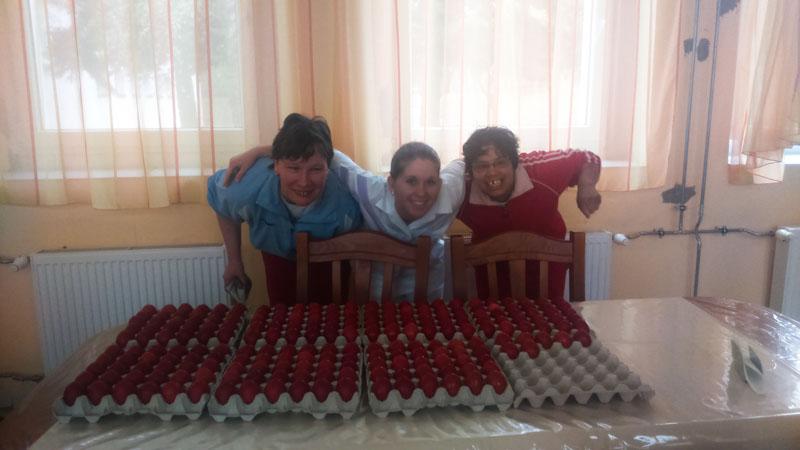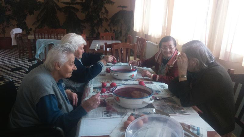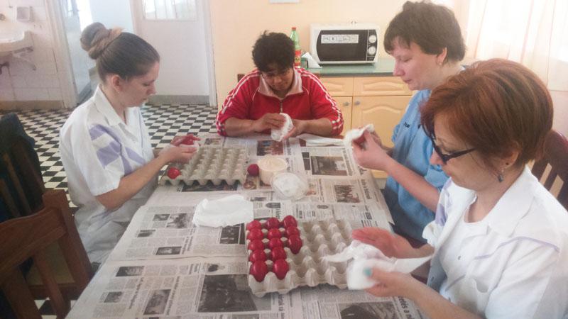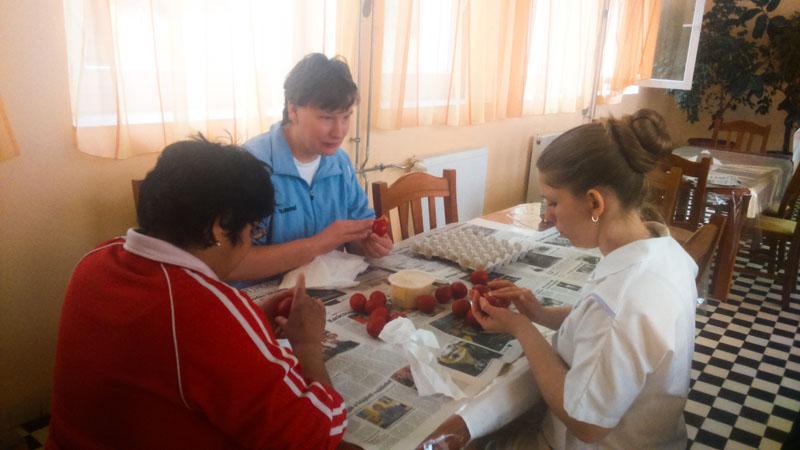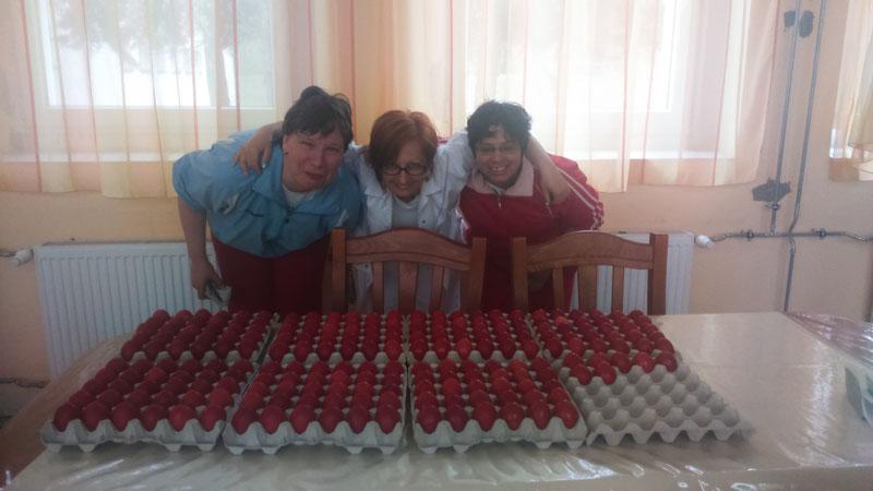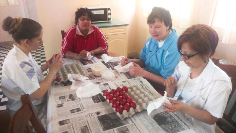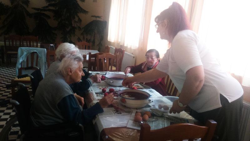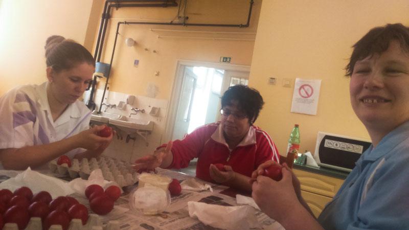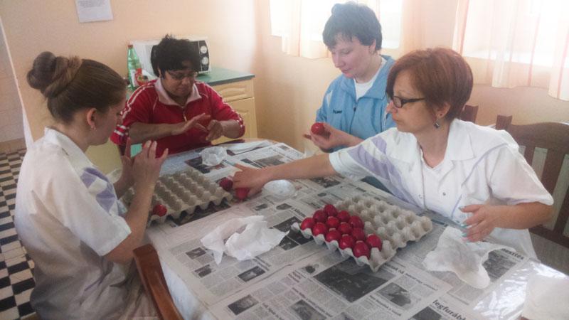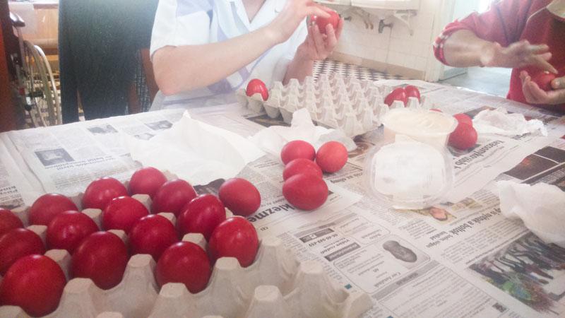 A készülődés időszaka is vidámabban telik ezáltal. Intézményünkben is elkészültek a piros tojások lakóink ügyes keze nyomán.