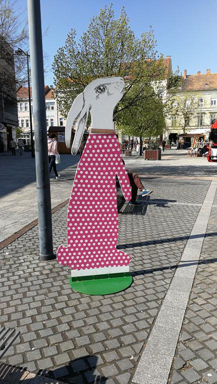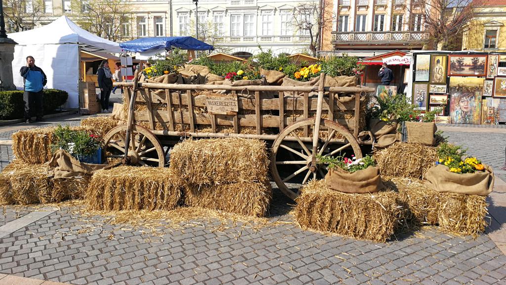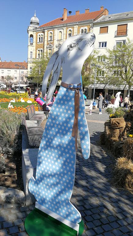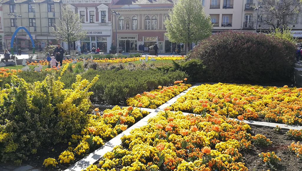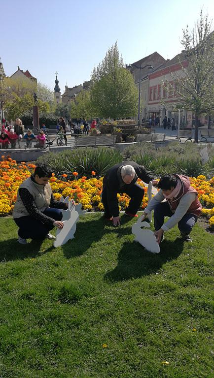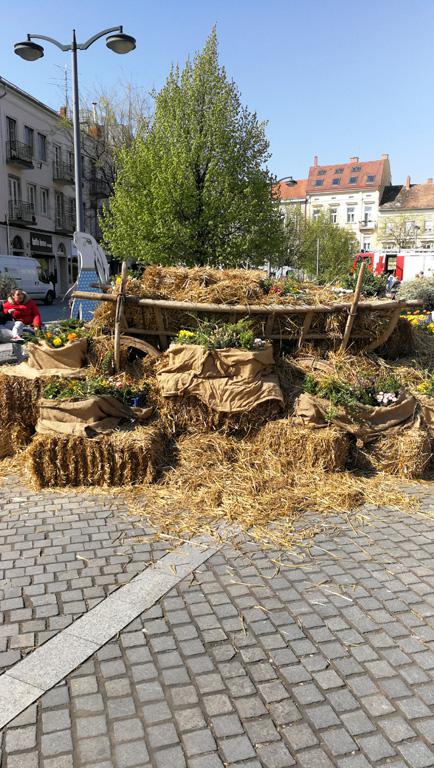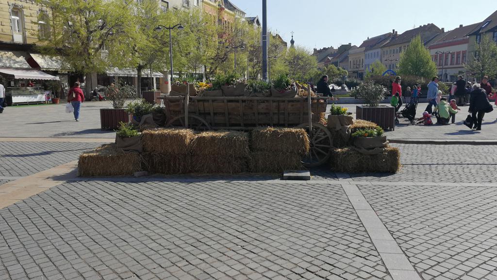 Fiataloknak nagyon tetszett a húsvéti díszítés, ámulva nézték a virágos szekeret, tojásfákat, nyuszikat a tulipánok között. Kellemesen telt a délelőtti séta a Főtéren.