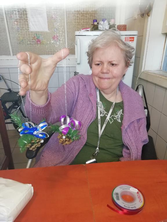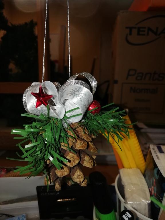 Az intézményünkben élő fiatalok séta alkalmával gyűjtötték számukra a szép tobozokat. Az Aranyalkony és Őszikék osztályon pedig mutatós, egyszerű alkotások készültek belőlük, miközben felelevenítették a régebbi, otthon készült karácsonyi dekorációkat. Hangulatosan teltek ezek az órák beszélgetve, karácsonyi zene hallgatása közben.