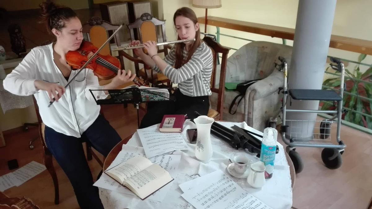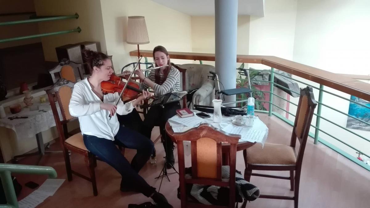 Kávéházi alkalmunk tovább folytatódott januárban is. Rác Fanni és Borsics Anna szolgáltak a délelőtti alkalmunkon hegedűvel és fuvolával.