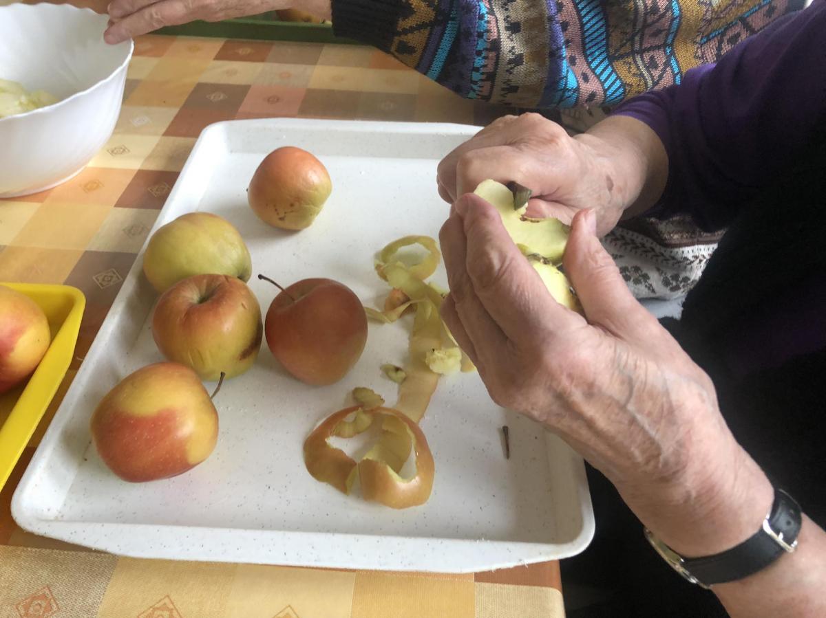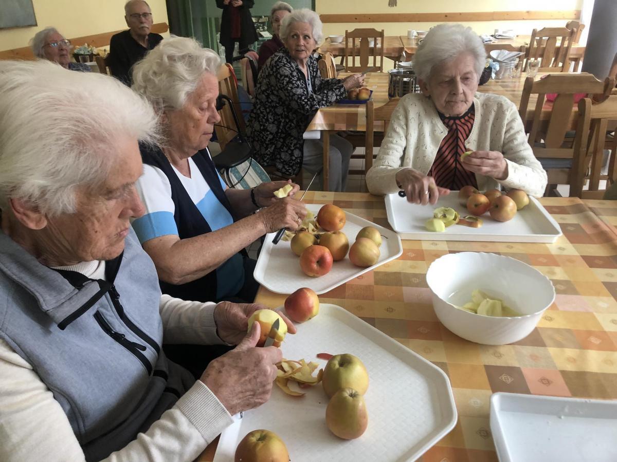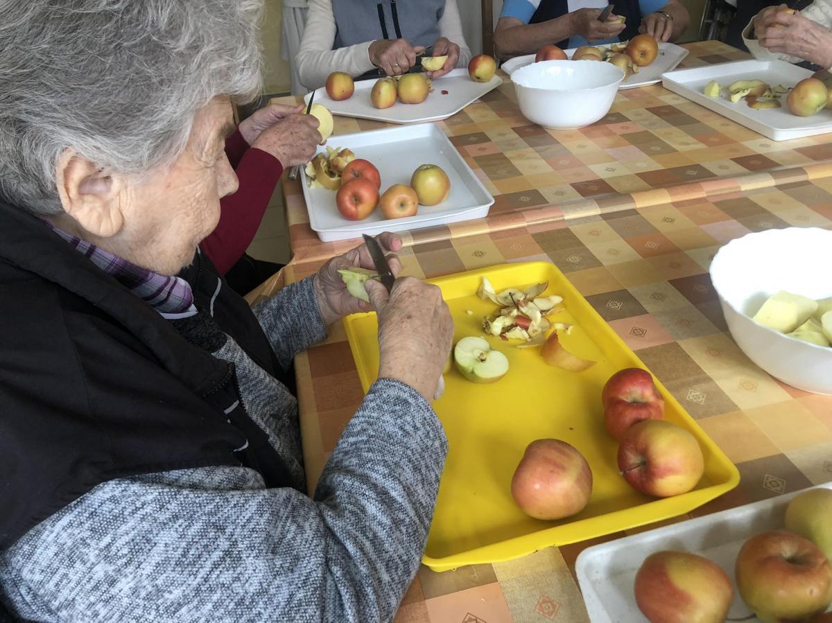 Időseink nagy szorgalommal pucolták, darabolták az almát, gyúrták, szaggatták a tésztát.