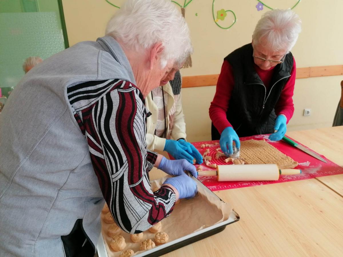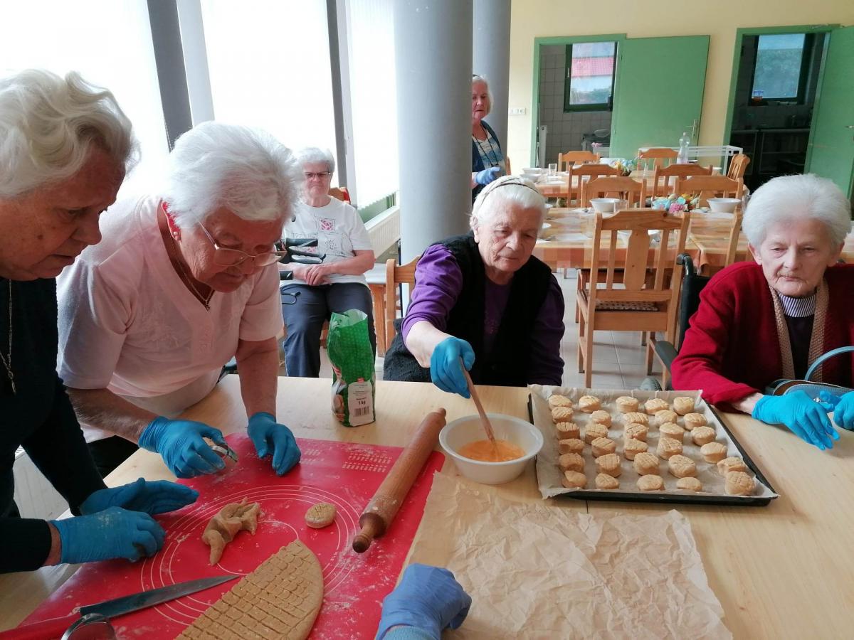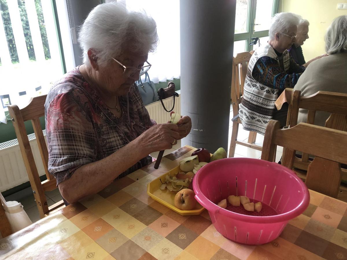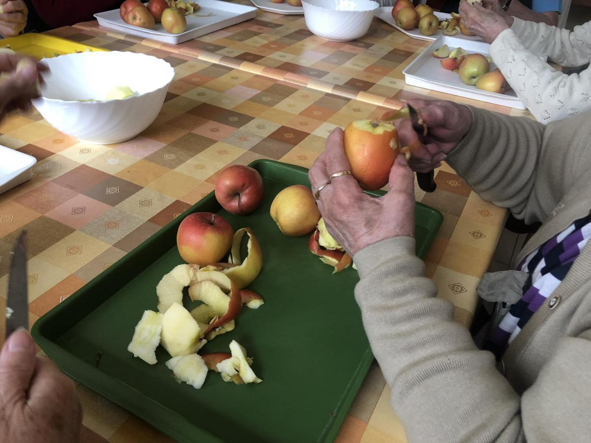 Időseink nagy szorgalommal pucolták, darabolták az almát, gyúrták, szaggatták a tésztát.