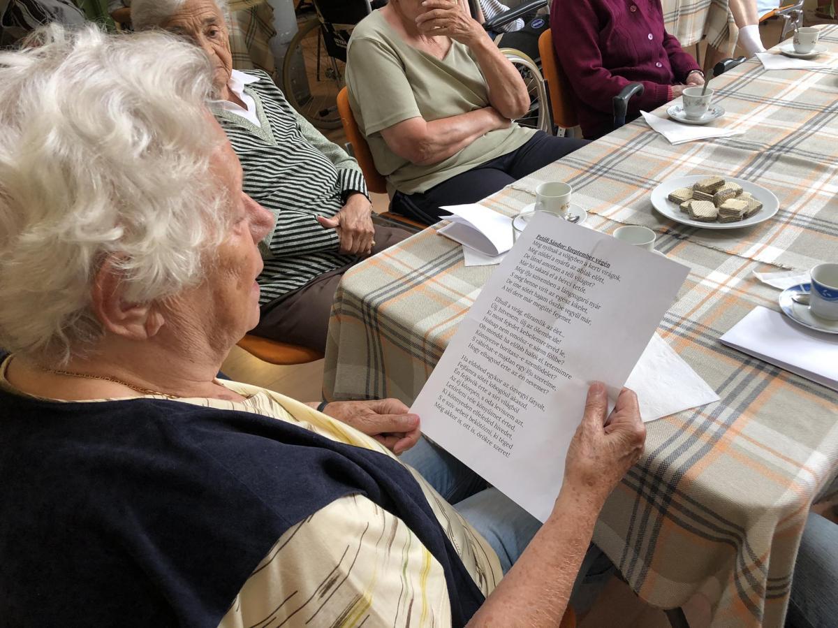 Amikor a tanár úr először felvetette az ötletet, hogy időseink is mondjanak verset, mindenki szabadkozott, ám hamar összegyűjtötték lakóink a bátorságukat, hiszen a napokban is foglalkoztak rigmusokkal. A hozzátartozóknak készül az ünnepi könyvhét keretében egy felvétel, amelyen lakóink mondanak verseket. A felvételen elhangzó alkotásokat végül tolmácsolták az irodalmi délelőttön is.