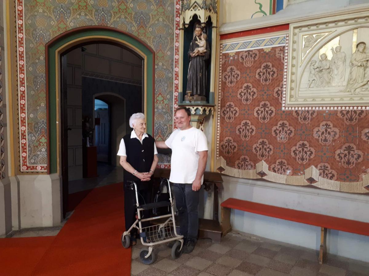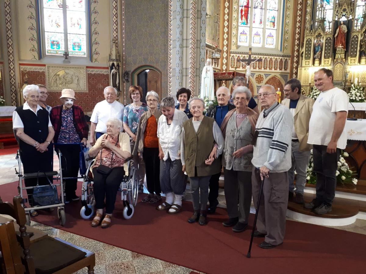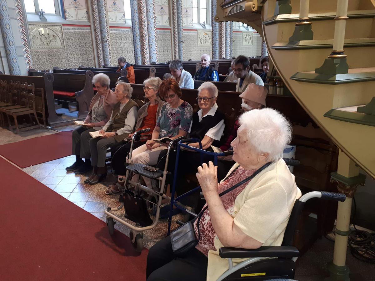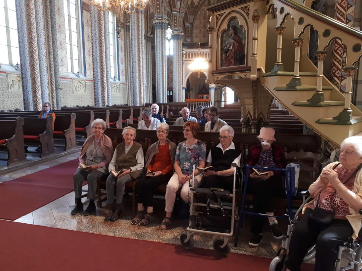 Dr. Perger Gyula atya szíves segítségével és hozzájárulásával időseink belülről is megcsodálhatták a város XIX. század végén épült, neogótikus stílusú plébániatemplomát. A történelmi belvárosban álló Jézus Szíve templom Vas megye második legnagyobb temploma a szombathelyi székesegyház után, s alkotója ugyanaz a Ludwig Schöne bécsi építész, kinek művei között a szombathelyi evangélikus templom is szerepel. A templom megtekintése után Horváth József atya misét celebrált lakóink számára. A mise után, a Fő téren járva idén is betérhettünk a város patinás cukrászdájába, a nevét az egykori Strauss vendégfogadóstól nyerő Arany Struccba, ahol kávé, üdítő és friss, helyben készített finomságok társaságában zárult a kirándulás.