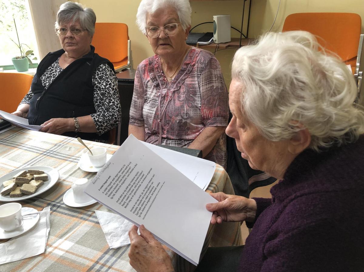 Ezúttal viszont közkívánatra időseink lepték meg egymást humoros történetekkel, versekkel, úti beszámolókkal. Az otthon nótafája, Erzsi néni pedig dalra fakadt.