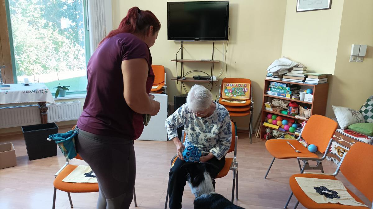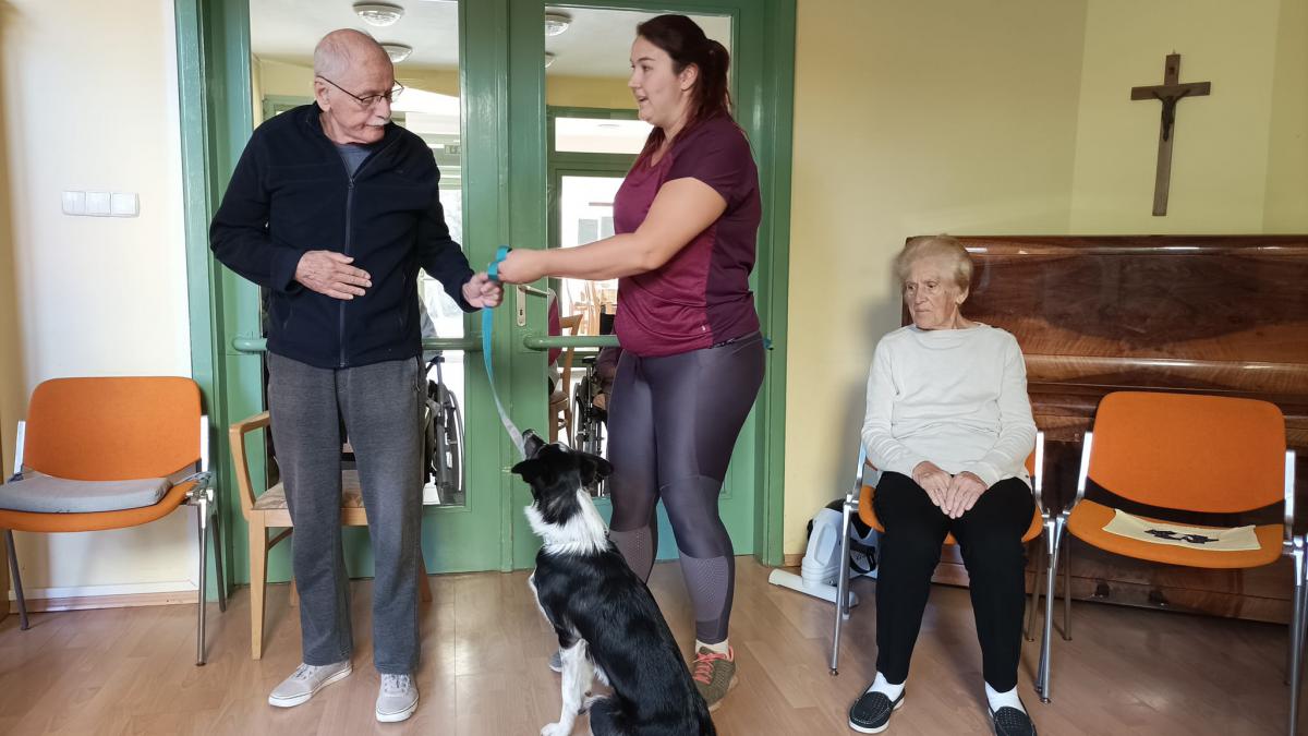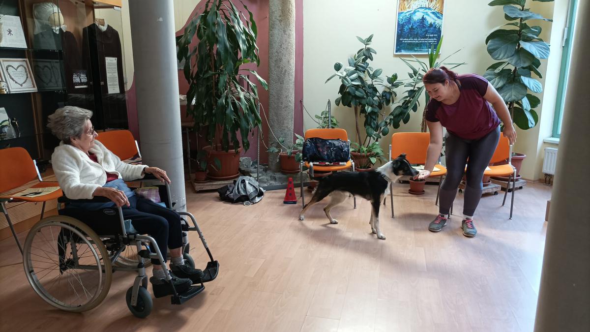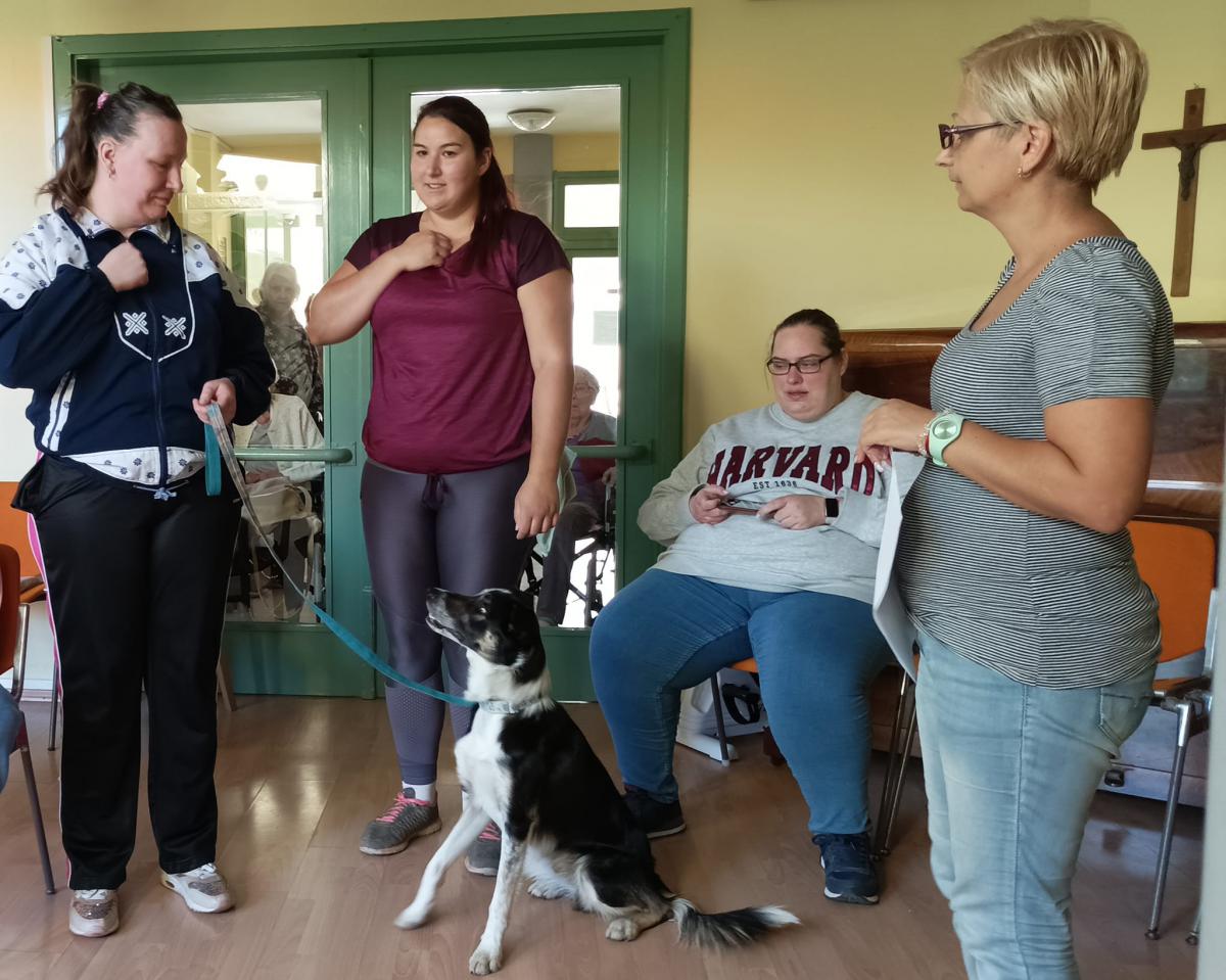 Lakóink két kis csoportban, a kutyával együtt végeztek el a kijelölt mozgásos, testtudat erősítő, szókincs aktivizáló feladatokat. Kutyát sétáltattak, s a sikeres feladatmegoldásokat követően idős és fogyatékkal élő bátran osztotta a jutalomfalatokat.