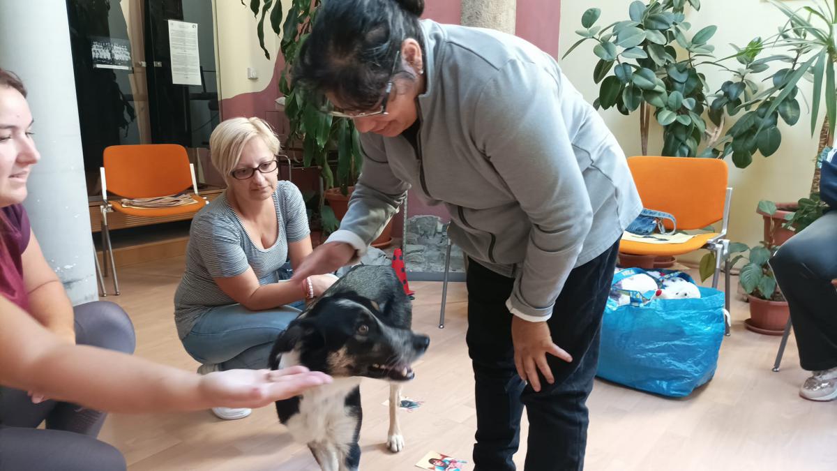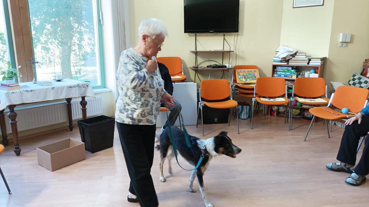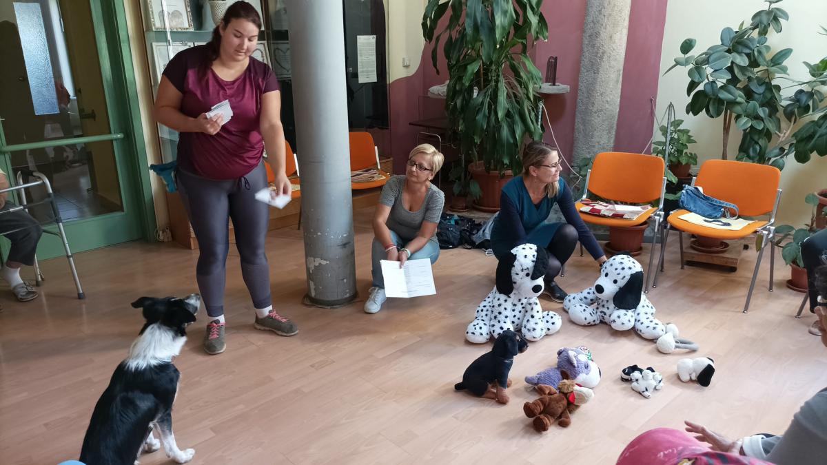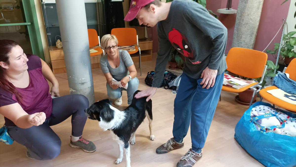 Lakóink két kis csoportban, a kutyával együtt végeztek el a kijelölt mozgásos, testtudat erősítő, szókincs aktivizáló feladatokat. Kutyát sétáltattak, s a sikeres feladatmegoldásokat követően idős és fogyatékkal élő bátran osztotta a jutalomfalatokat.