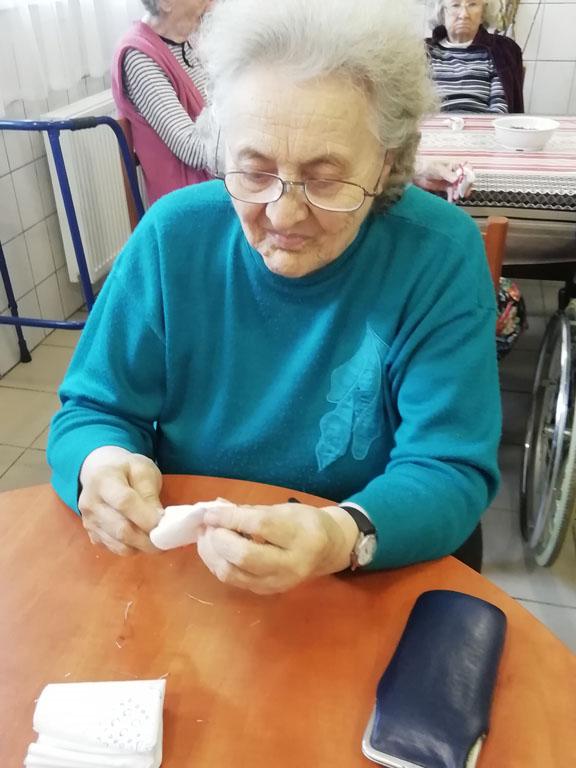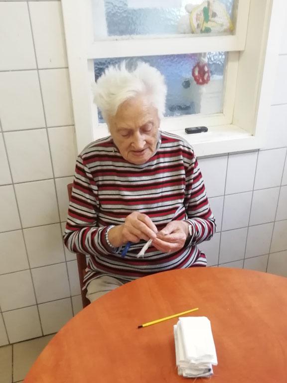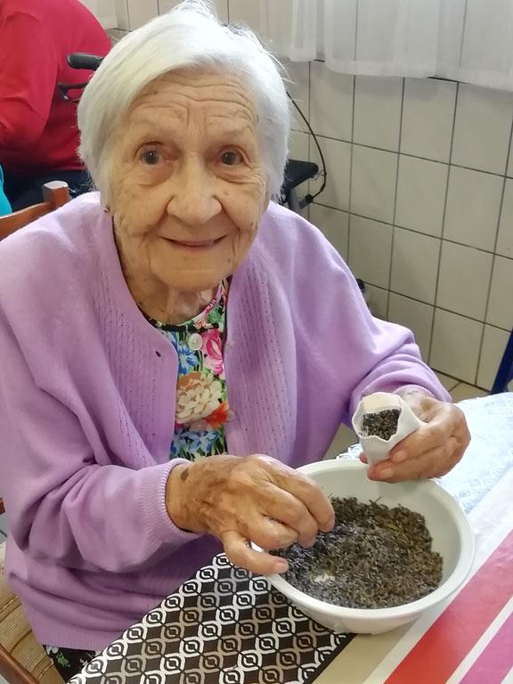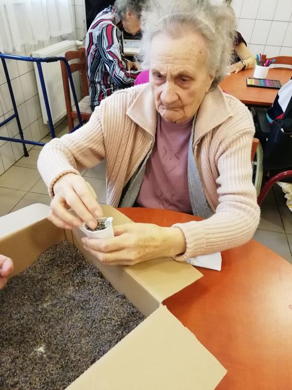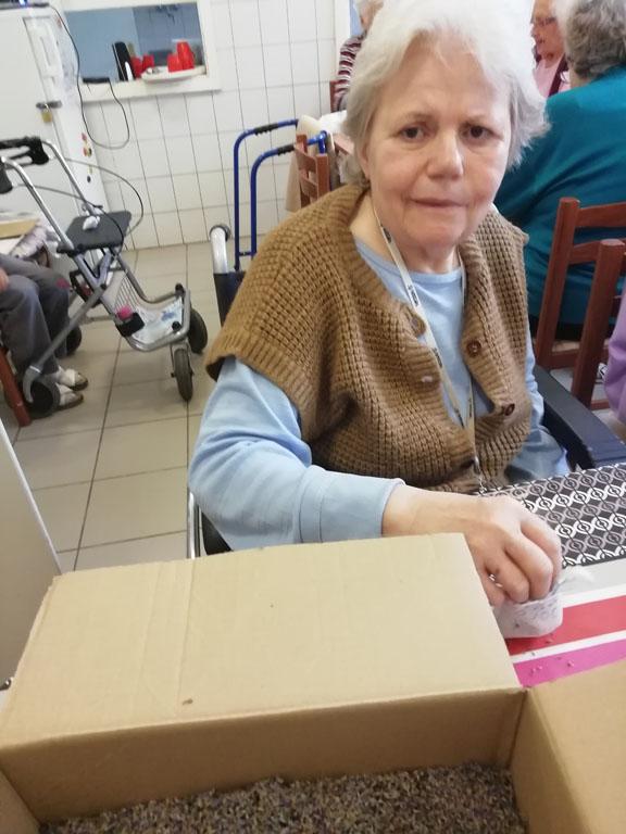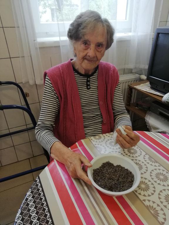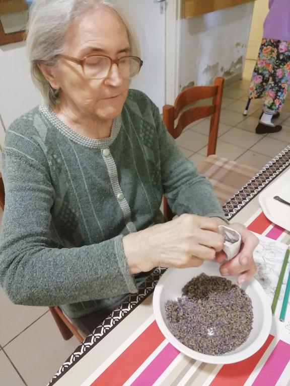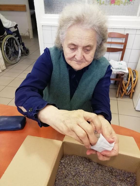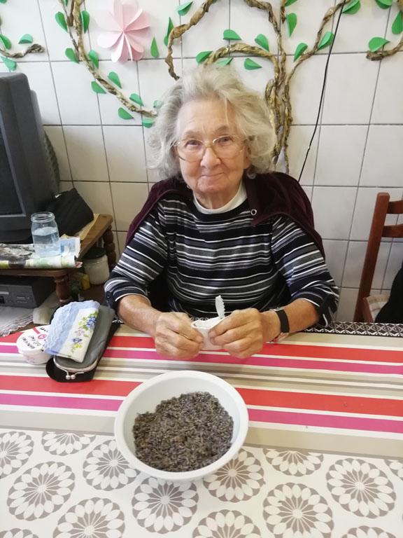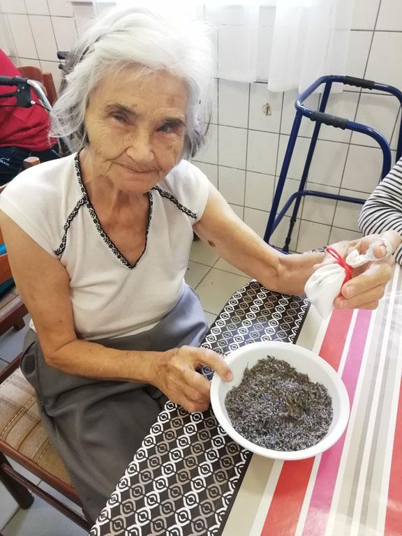 Első alkalommal még jó időben az udvaron kezdték el a szorgoskodást lakóink, de az eső elől behúzódva végül az osztályokon fejezték be a munkát. Saját szekrényeikbe készítették a kis tasakokat. Mindenki saját maga töltötte meg a zsákot az osztály udvarán termett, majd gondosan elrendezett levendulával. Az illatozó zsákocskák sok emléket elevenítettek fel, amiről egymásnak szívesen meséltek.