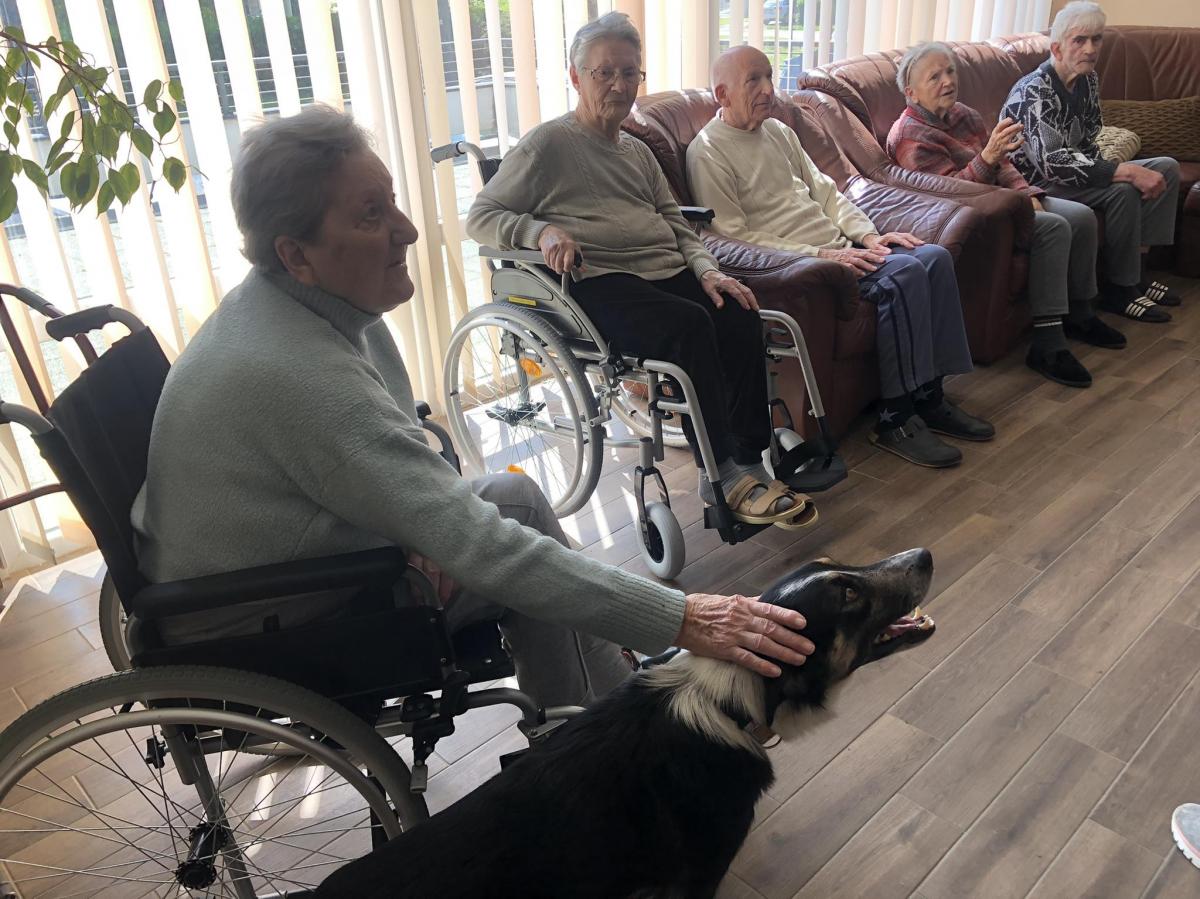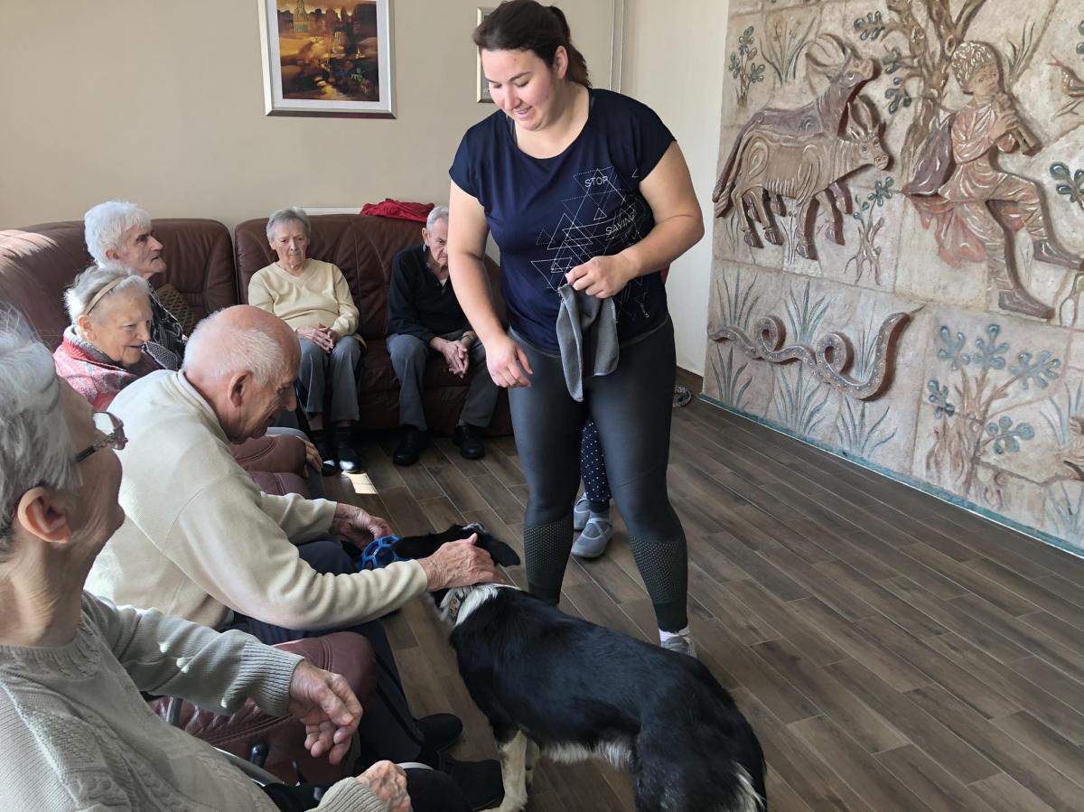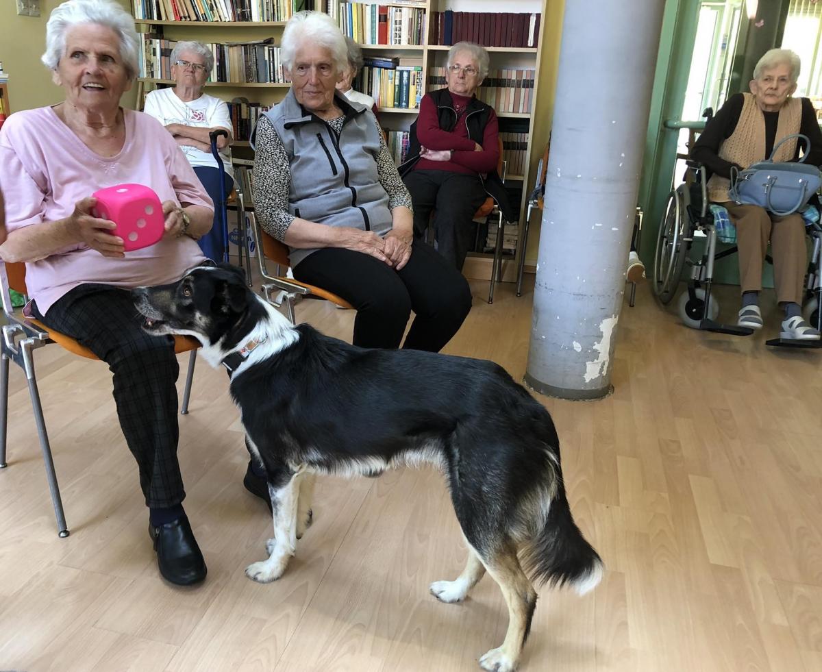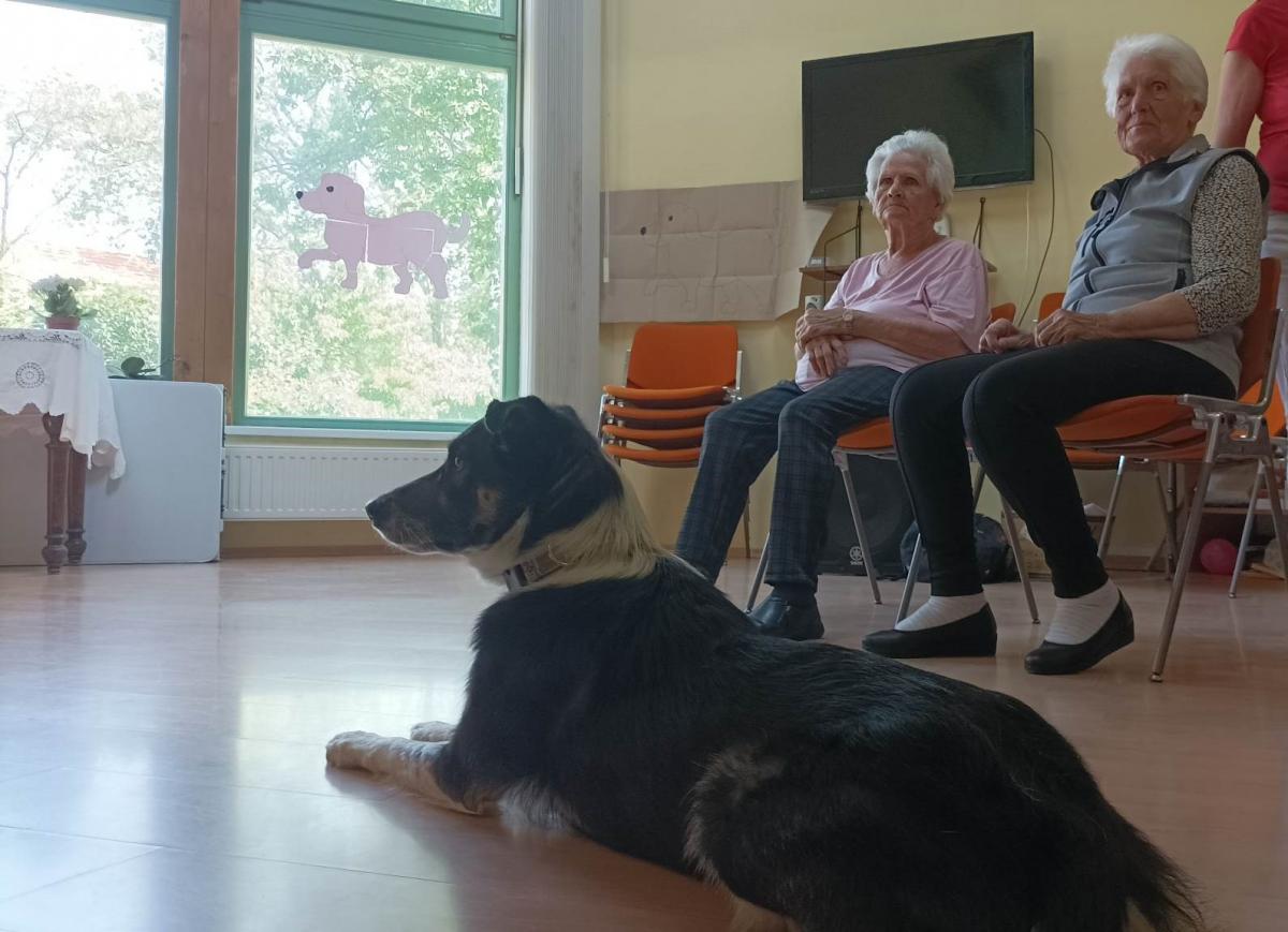 Továbbra is nagy népszerűségnek örvendenek központunkban a kutyaterápiás foglalkozások, amelyeken Bartalis Viktória és terápiás kutyusa Jamie számtalanszor csal mosolyt lakóink arcára. Nem mellesleg nagyon hasznosak is ezek a programok, hiszen a terápia pozitív hatással bír az idős, akár demenciával élő emberekre, az értelmi sérültek esetében fejlődés érhető el.