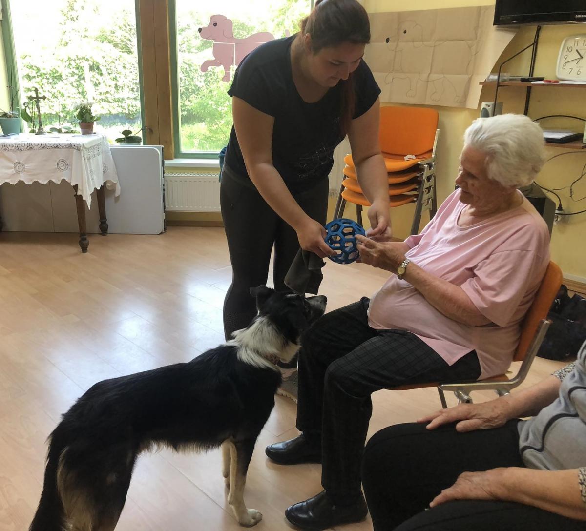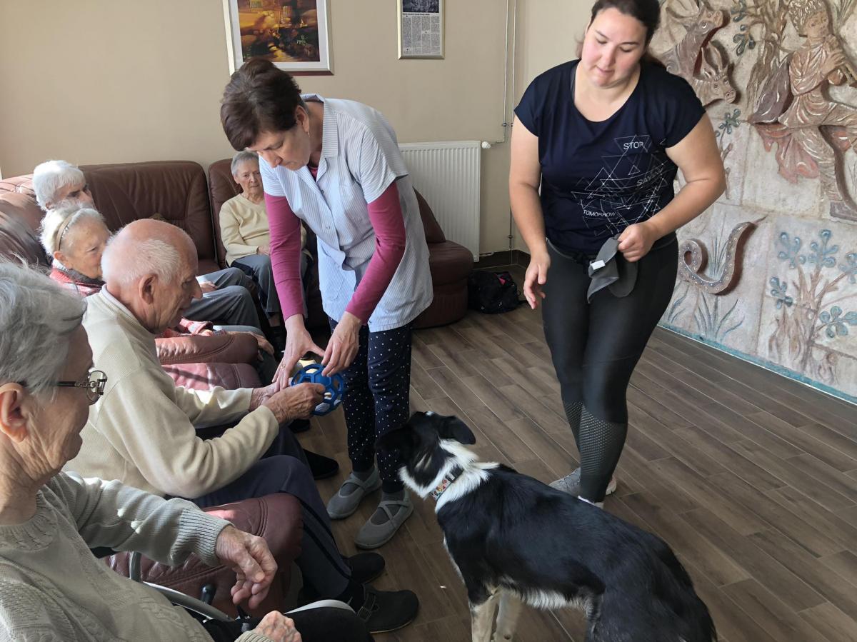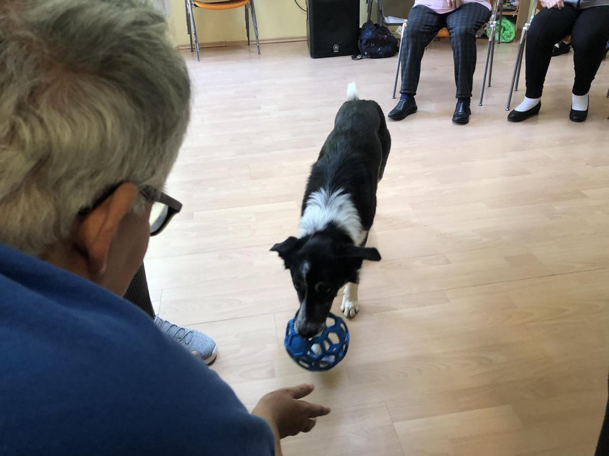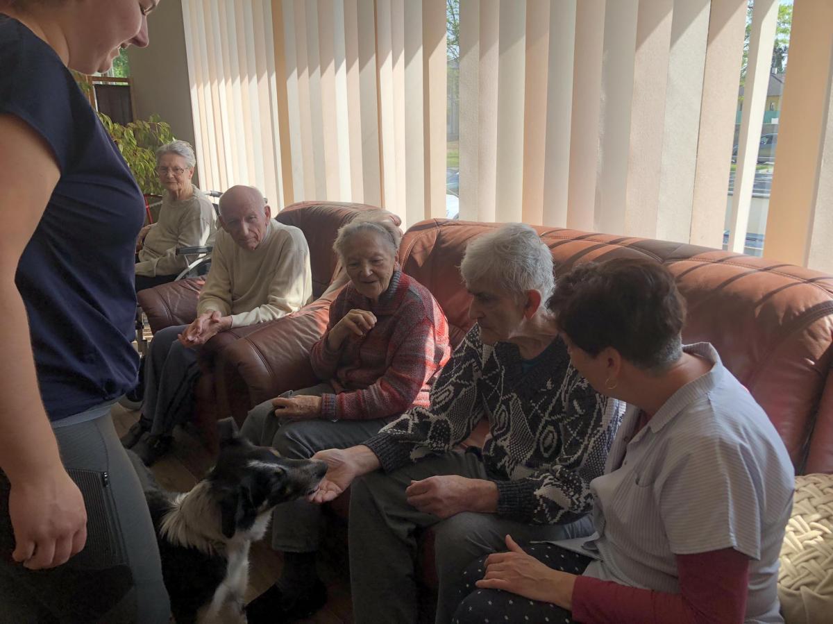 Továbbra is nagy népszerűségnek örvendenek központunkban a kutyaterápiás foglalkozások, amelyeken Bartalis Viktória és terápiás kutyusa Jamie számtalanszor csal mosolyt lakóink arcára. Nem mellesleg nagyon hasznosak is ezek a programok, hiszen a terápia pozitív hatással bír az idős, akár demenciával élő emberekre, az értelmi sérültek esetében fejlődés érhető el.