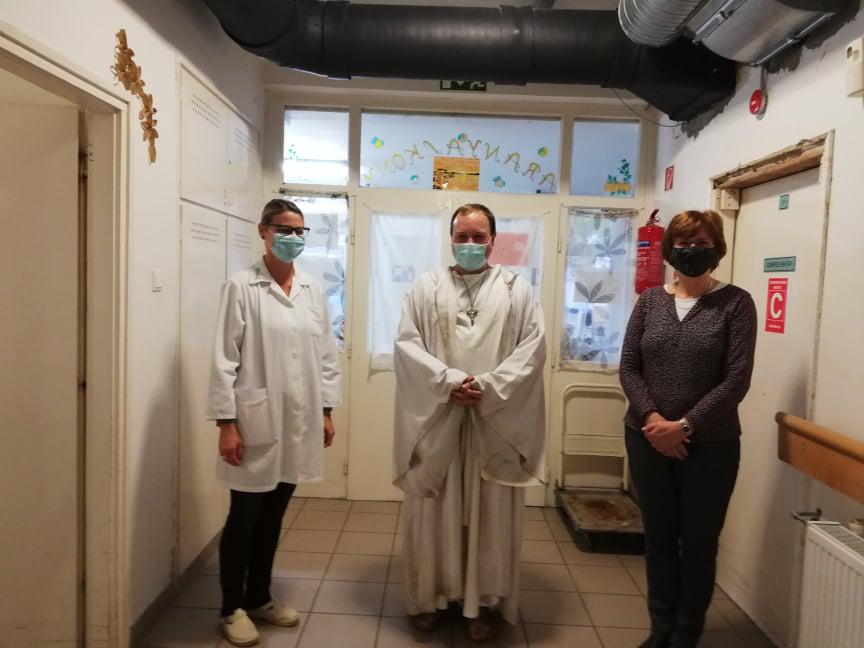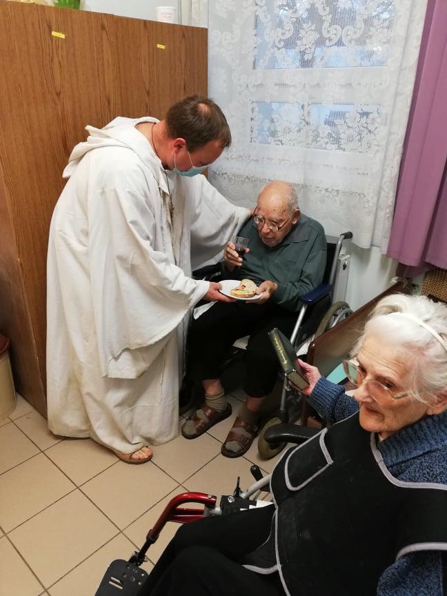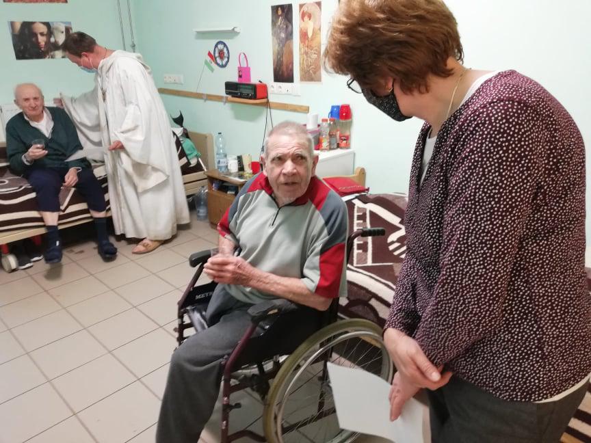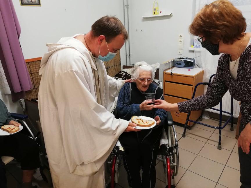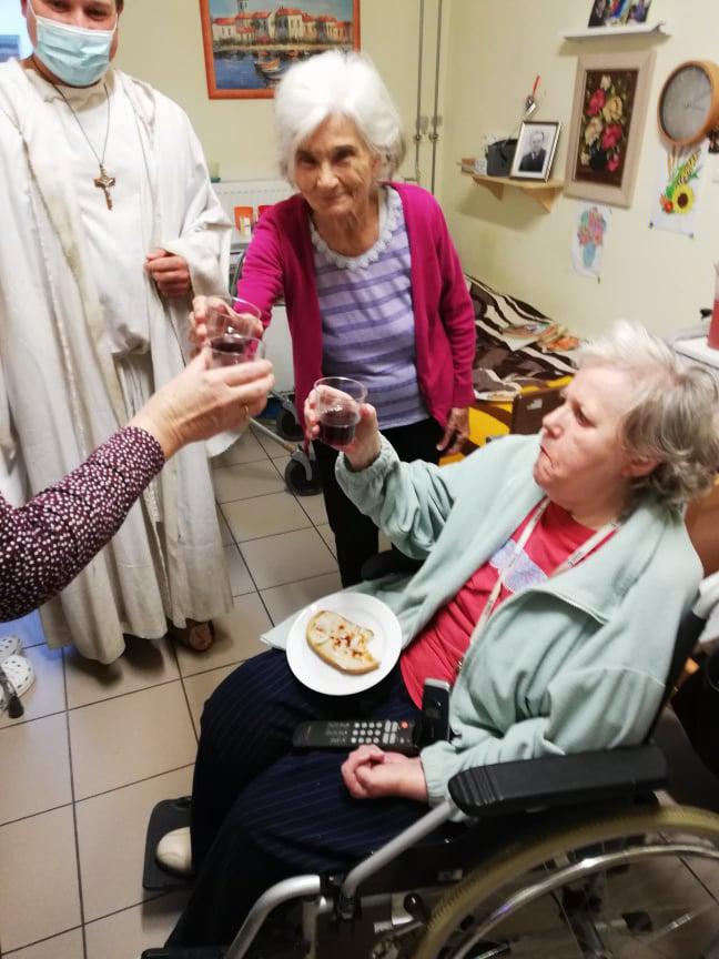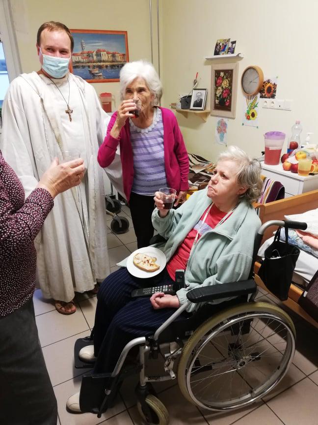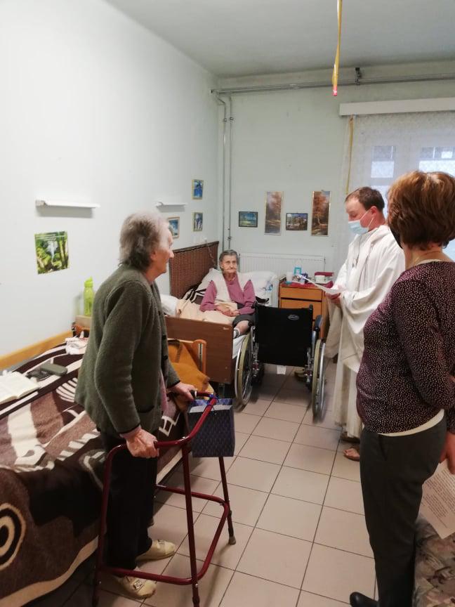 Lakóink számára is folytatódhatott a szokás: miközben a diakóniában dolgozó segítő munkatársak libazsíros-hagymás kenyérrel vendégelték meg az idős osztály lakóit, Menyes Gyula parókus lelkész és neje, Menyesné Uram Zsuzsanna diakóniai lelkész felajánlásaként újbort is kóstolhattak.