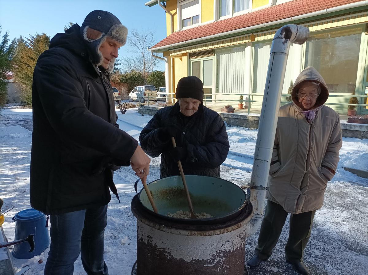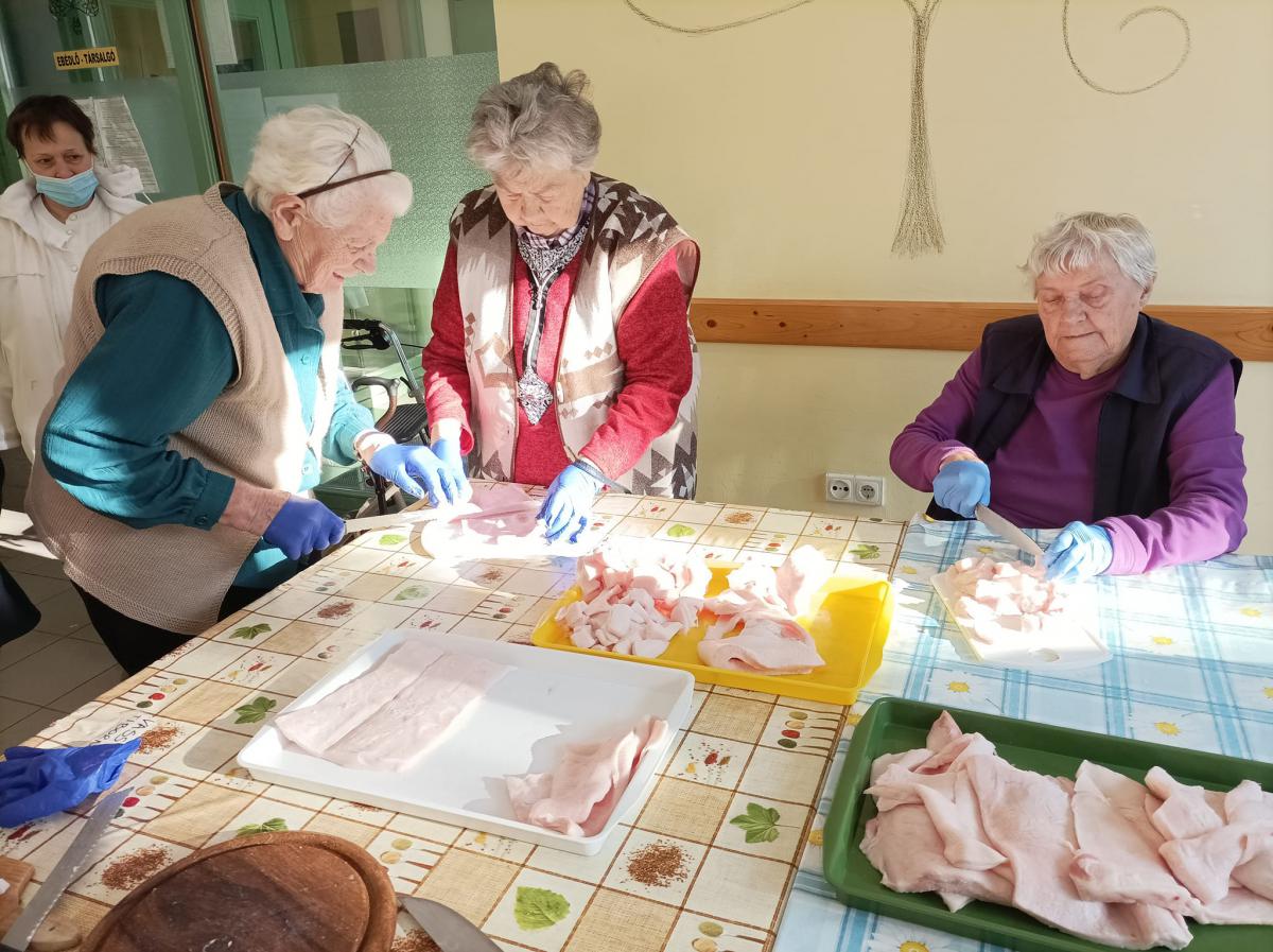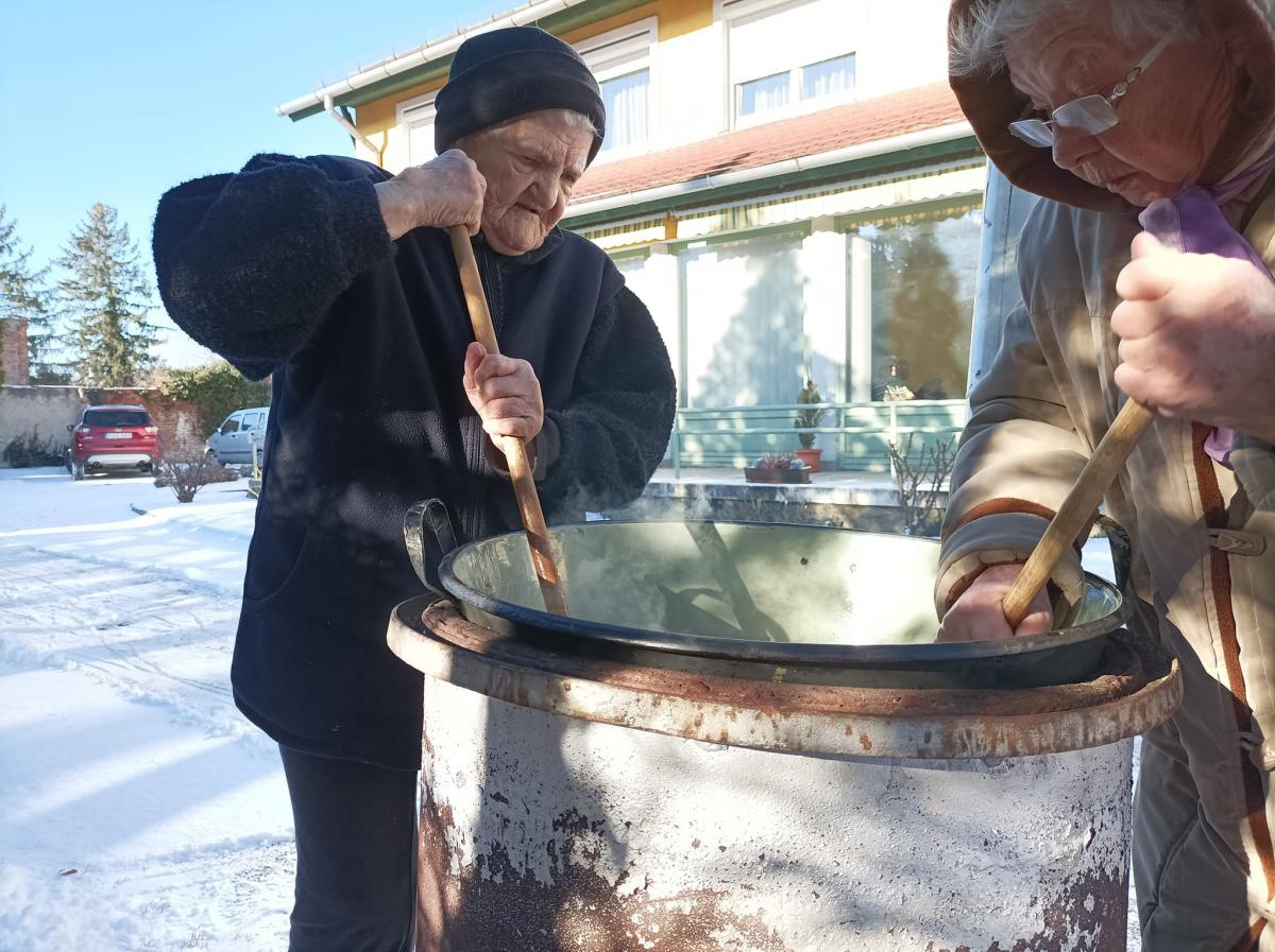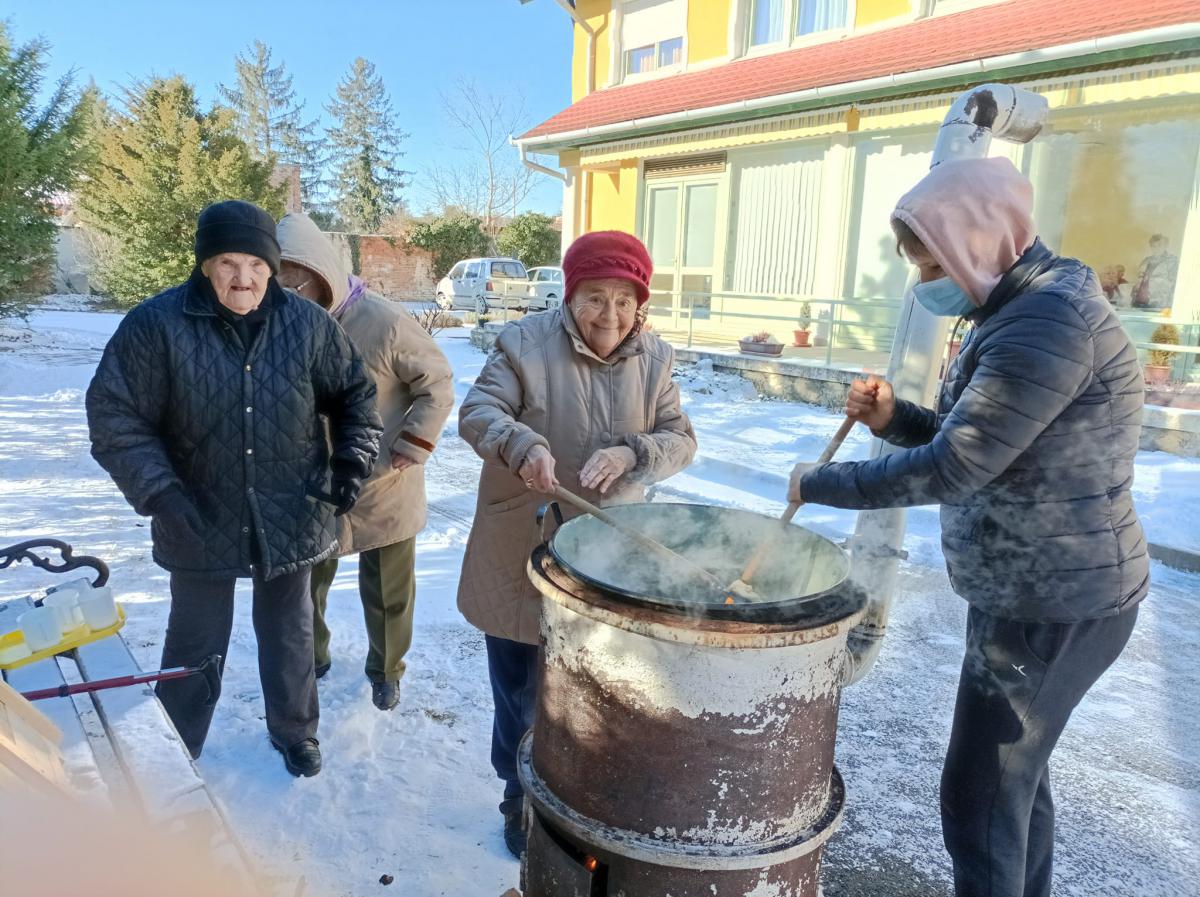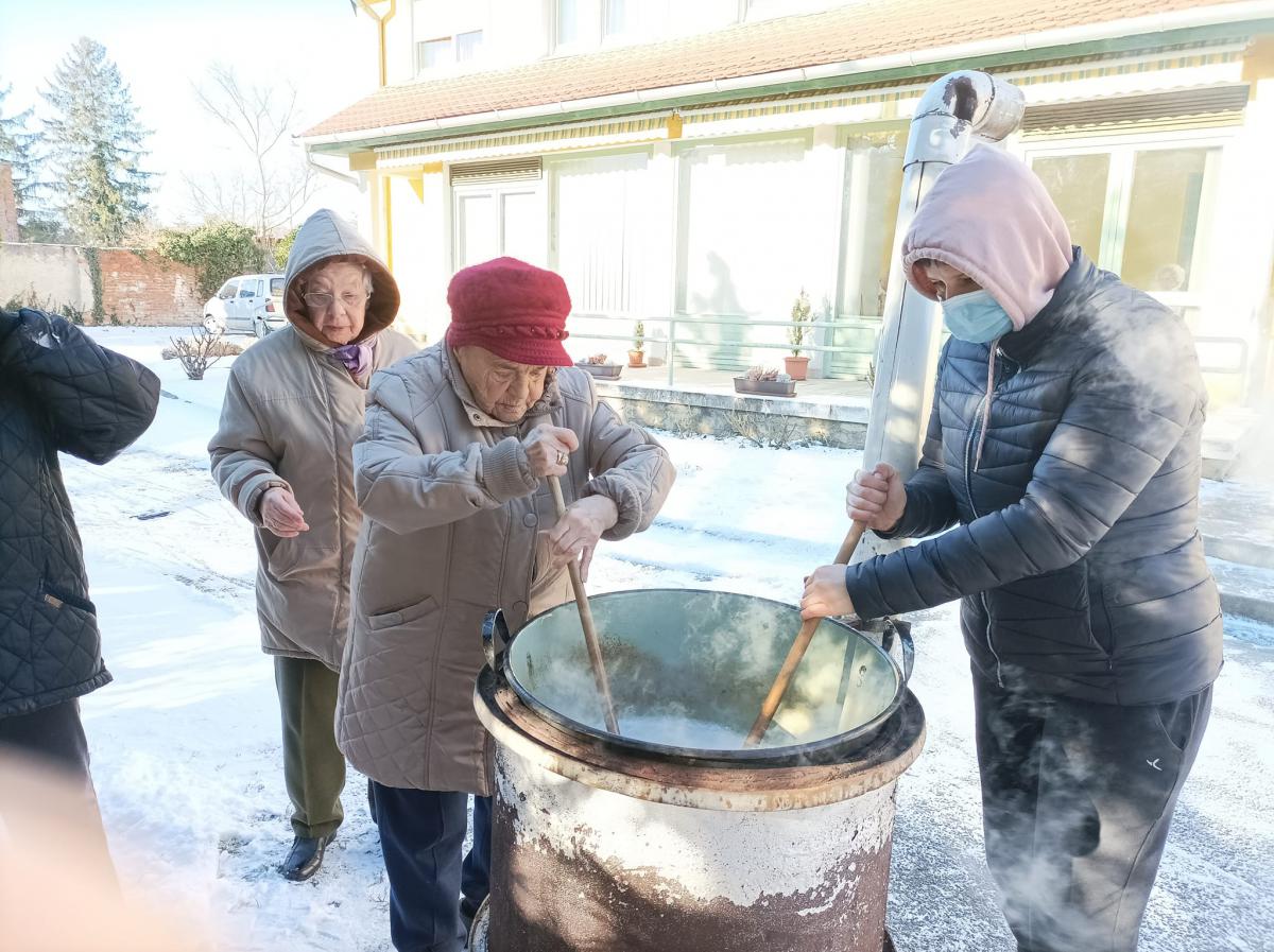 A zsír vágása, katlanban sütése, illata, a sütés mozdulatai emlékeket idézték fel szinte mindenkiben. Az idősek saját történeteiket, sütési fortélyaikat mesélték. A hideg miatt az ebédlőben maradt időseink népdalokat énekeltek. A friss töpörtyű vacsorára került lakóink asztalára.