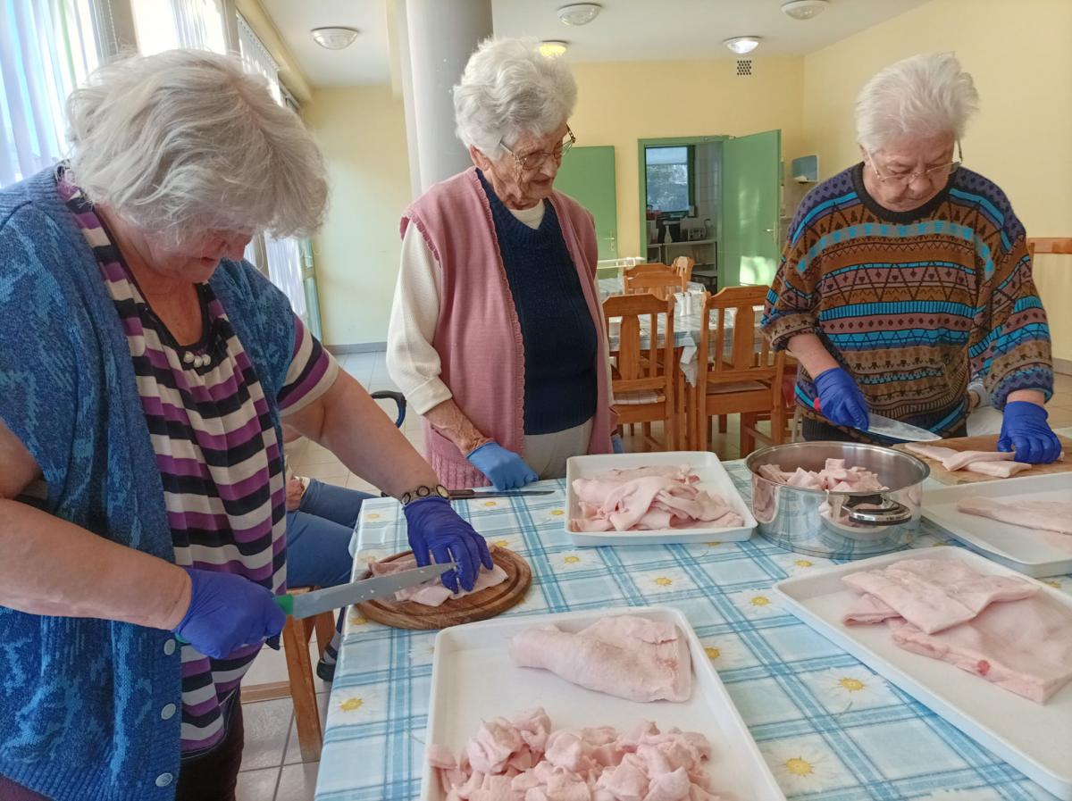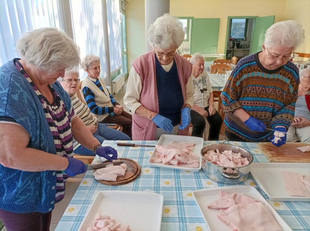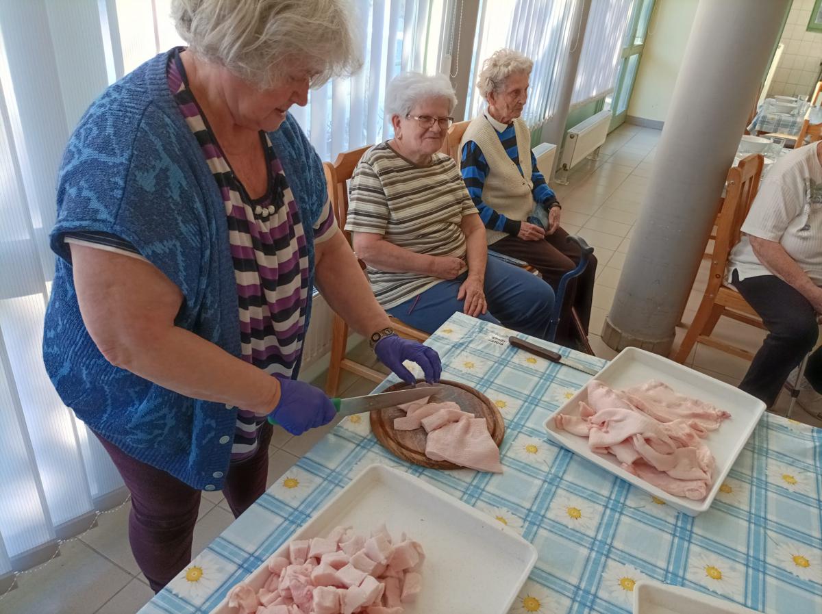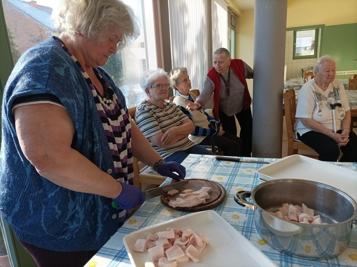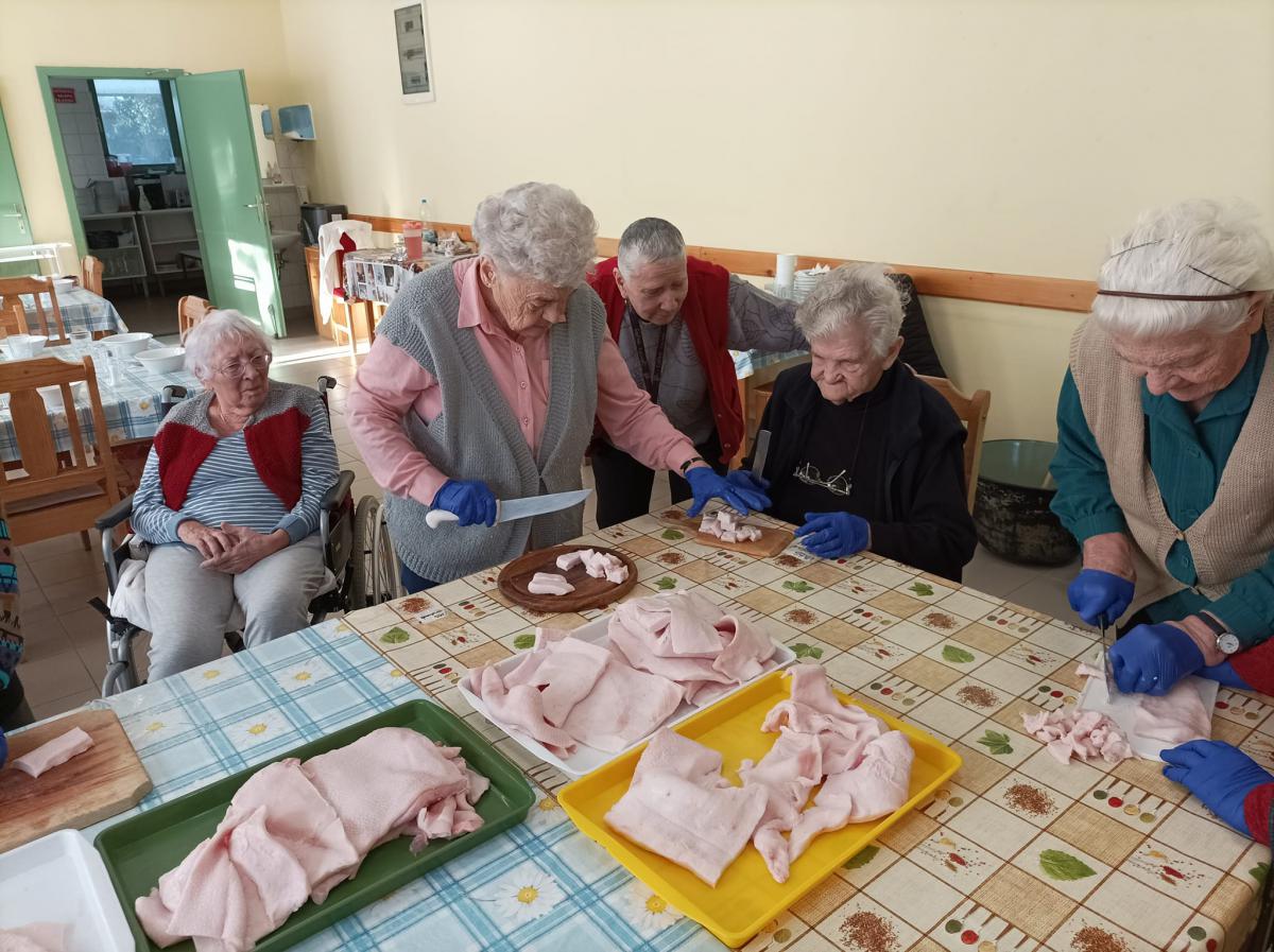 A zsír vágása, katlanban sütése, illata, a sütés mozdulatai emlékeket idézték fel szinte mindenkiben. Az idősek saját történeteiket, sütési fortélyaikat mesélték. A hideg miatt az ebédlőben maradt időseink népdalokat énekeltek. A friss töpörtyű vacsorára került lakóink asztalára.