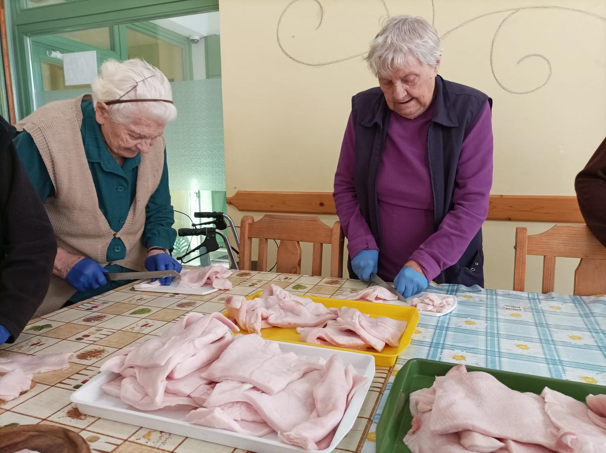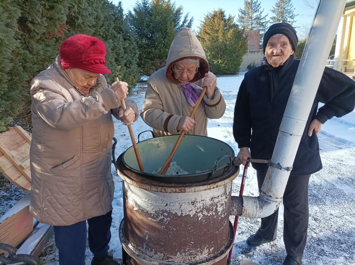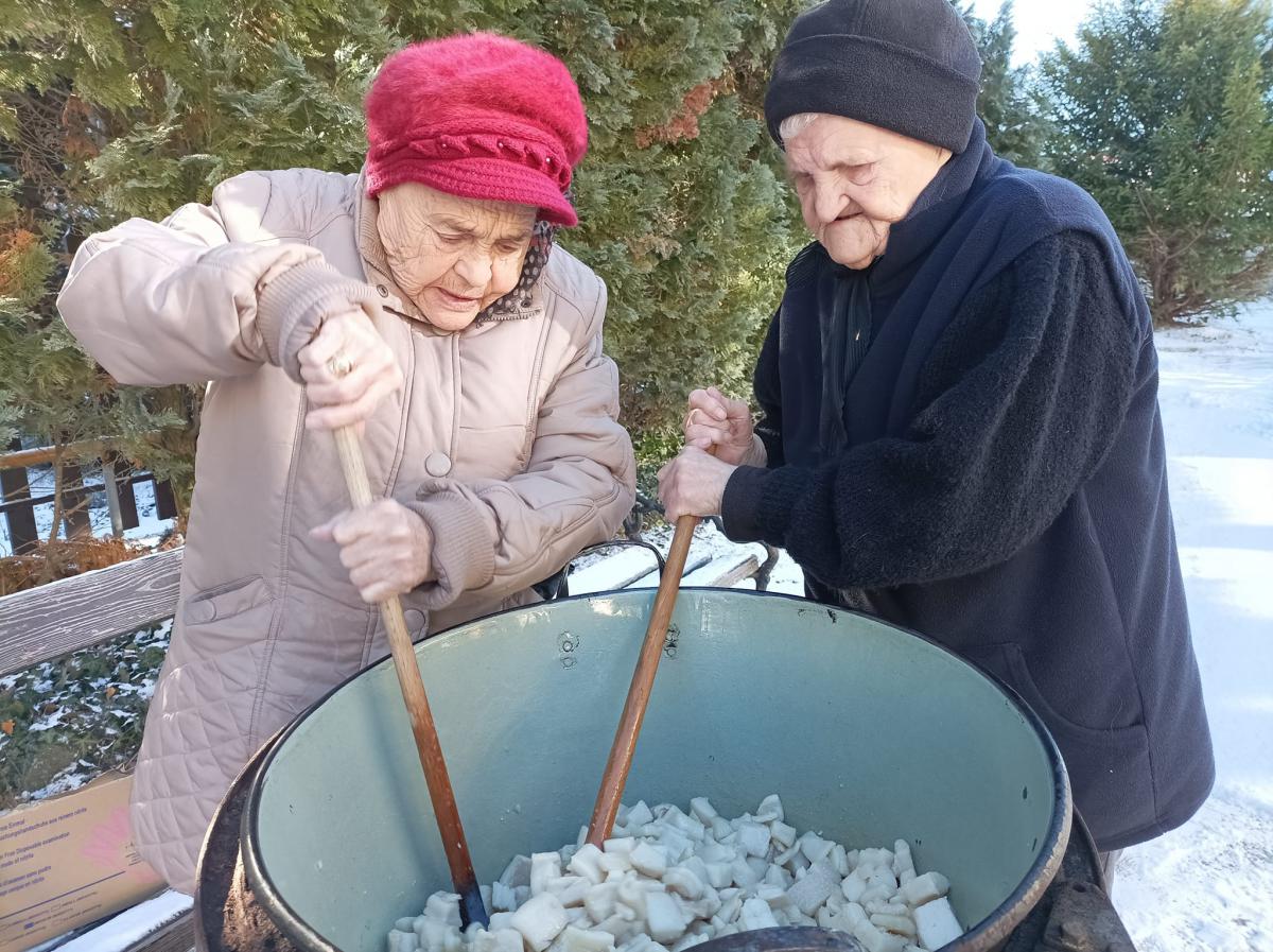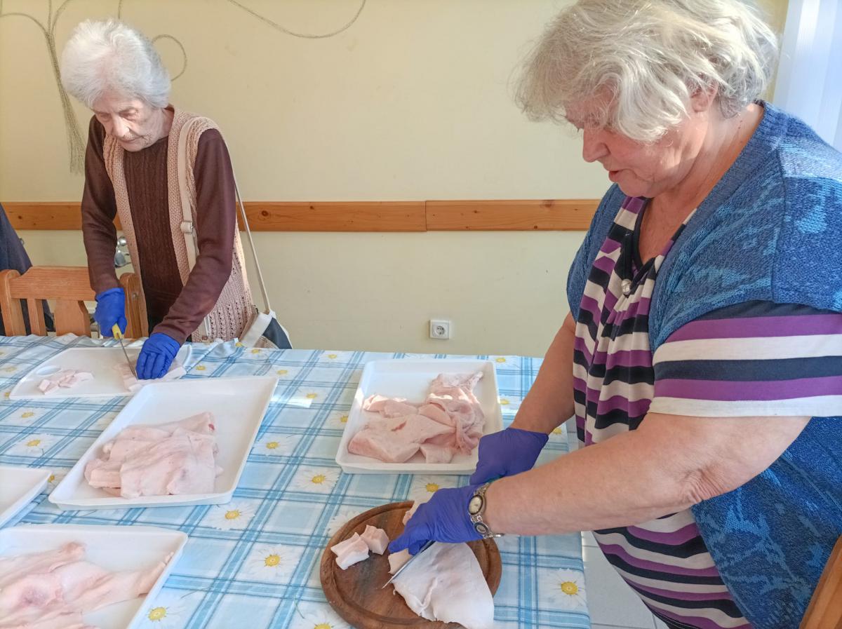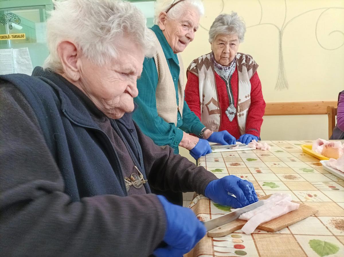 A zsír vágása, katlanban sütése, illata, a sütés mozdulatai emlékeket idézték fel szinte mindenkiben. Az idősek saját történeteiket, sütési fortélyaikat mesélték. A hideg miatt az ebédlőben maradt időseink népdalokat énekeltek. A friss töpörtyű vacsorára került lakóink asztalára.