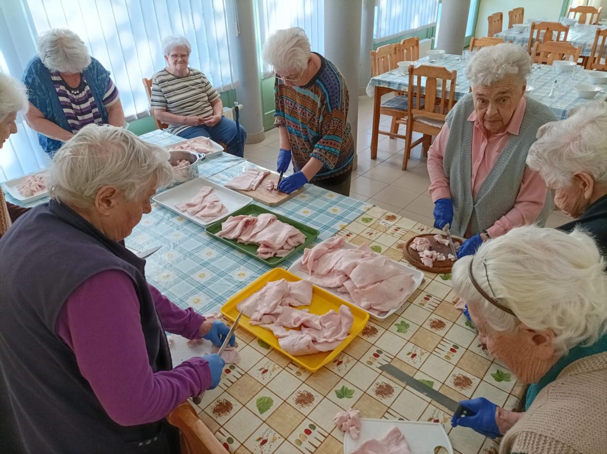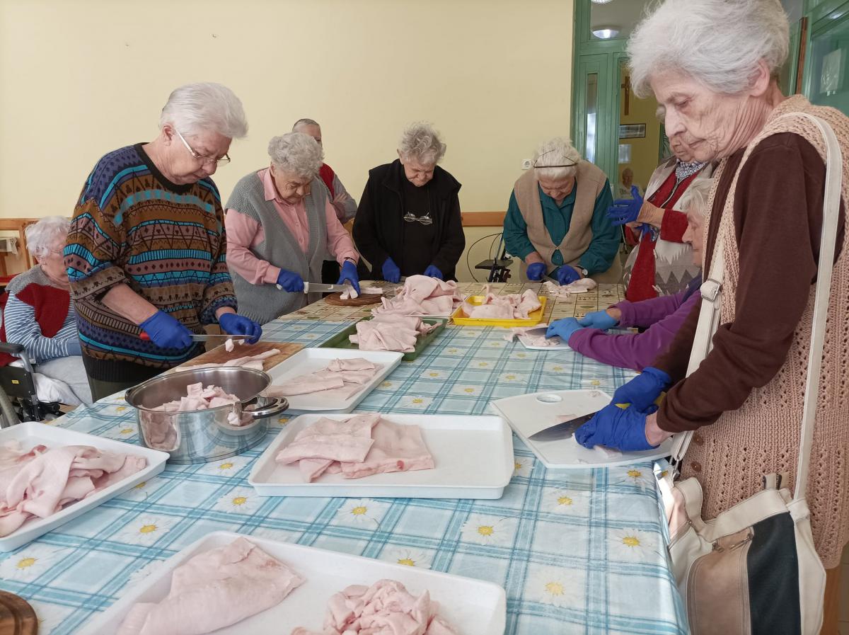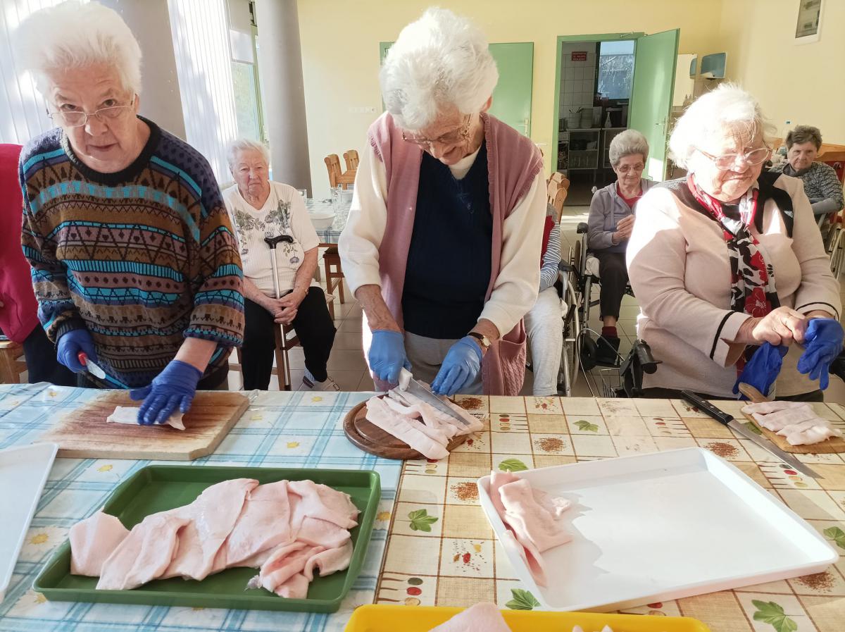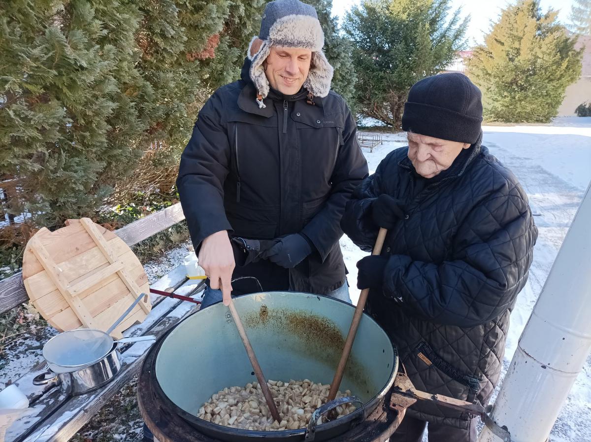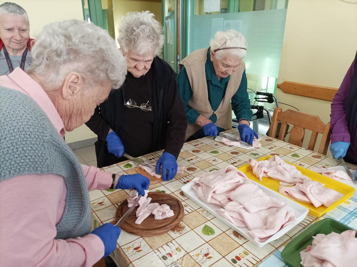 A zsír vágása, katlanban sütése, illata, a sütés mozdulatai emlékeket idézték fel szinte mindenkiben. Az idősek saját történeteiket, sütési fortélyaikat mesélték. A hideg miatt az ebédlőben maradt időseink népdalokat énekeltek. A friss töpörtyű vacsorára került lakóink asztalára.