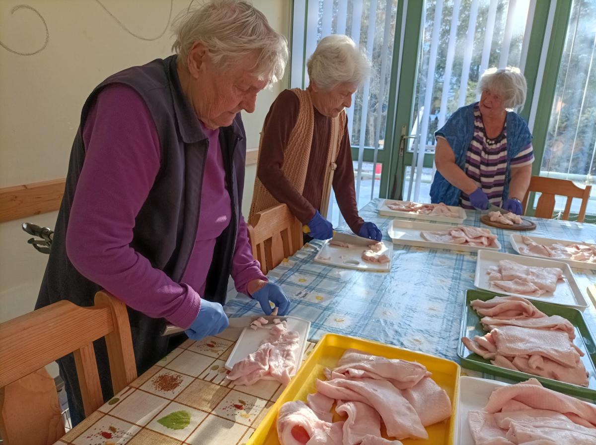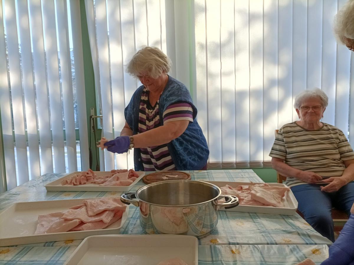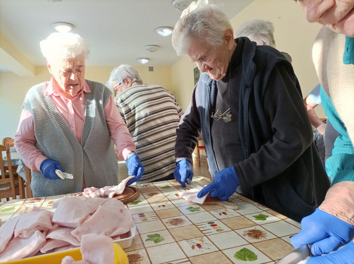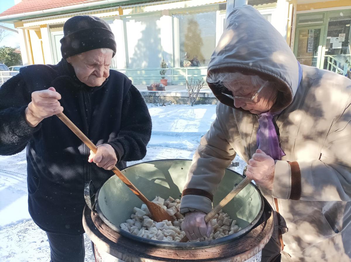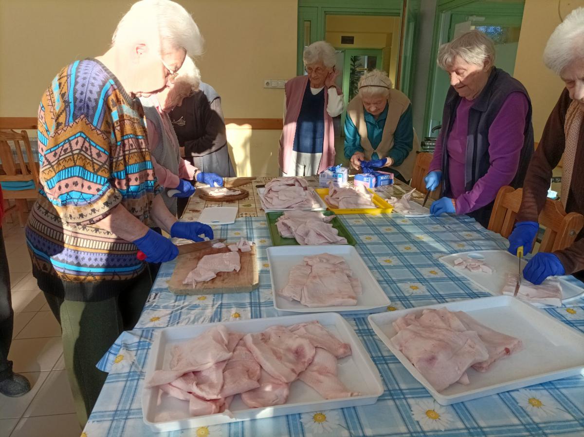 A zsír vágása, katlanban sütése, illata, a sütés mozdulatai emlékeket idézték fel szinte mindenkiben. Az idősek saját történeteiket, sütési fortélyaikat mesélték. A hideg miatt az ebédlőben maradt időseink népdalokat énekeltek. A friss töpörtyű vacsorára került lakóink asztalára.