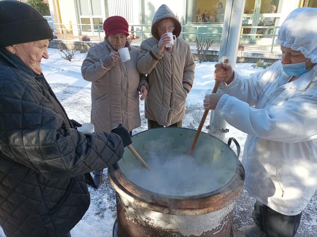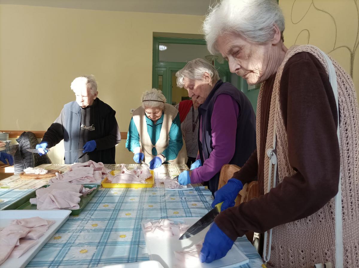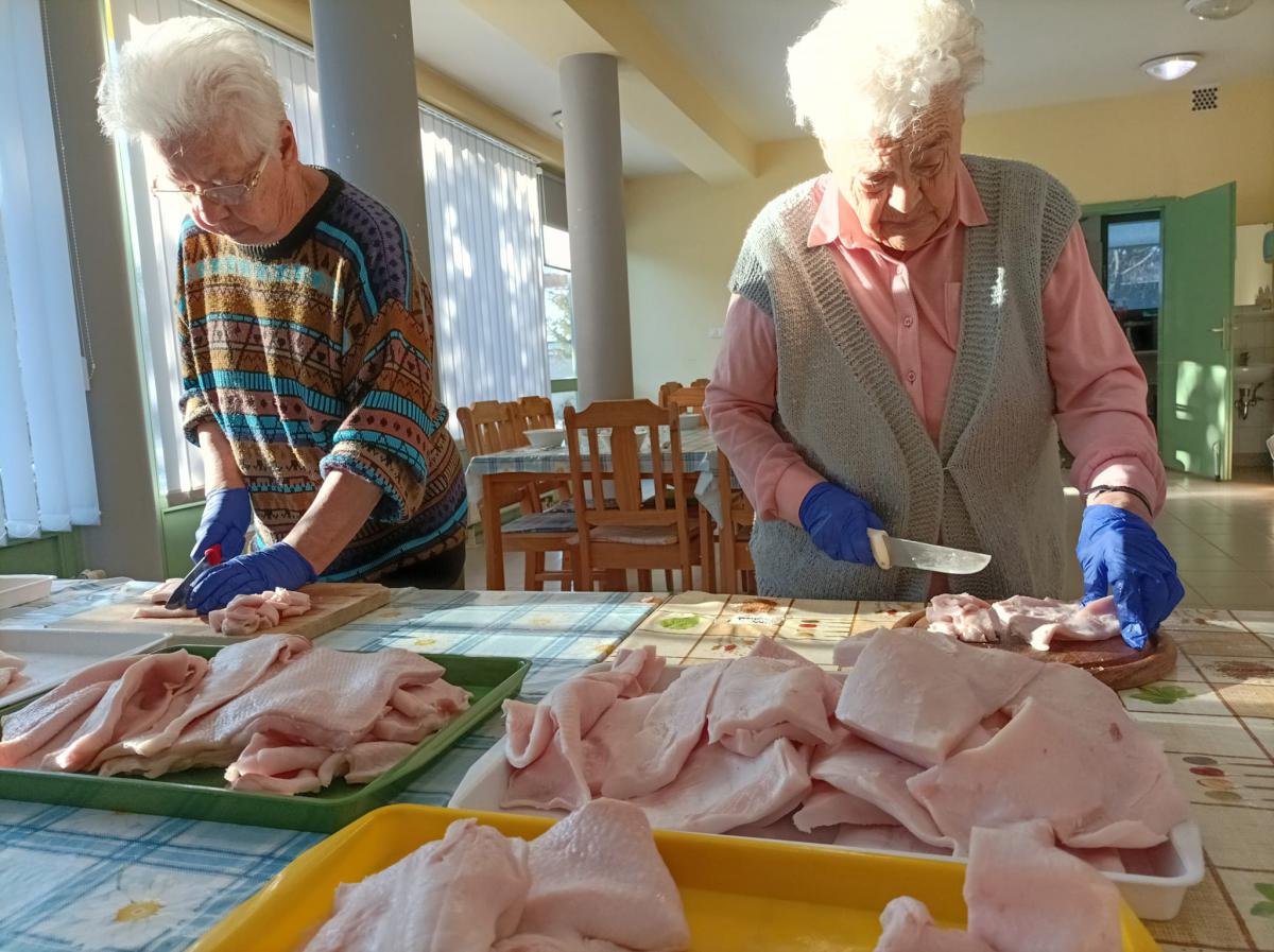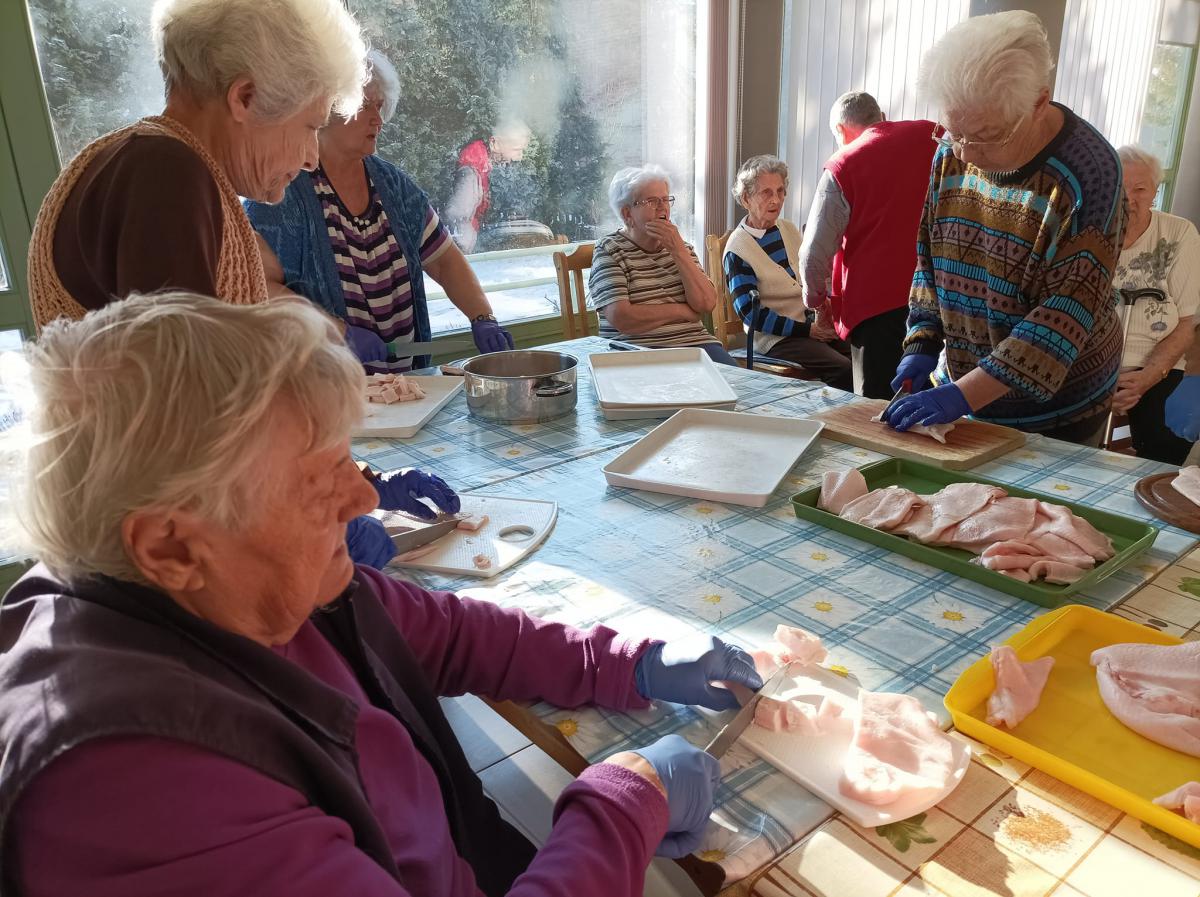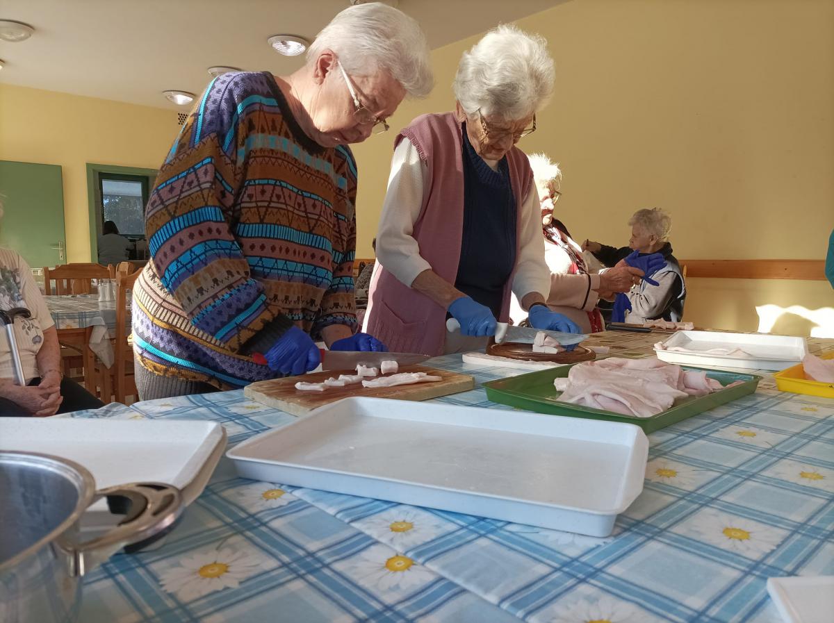 A zsír vágása, katlanban sütése, illata, a sütés mozdulatai emlékeket idézték fel szinte mindenkiben. Az idősek saját történeteiket, sütési fortélyaikat mesélték. A hideg miatt az ebédlőben maradt időseink népdalokat énekeltek. A friss töpörtyű vacsorára került lakóink asztalára.