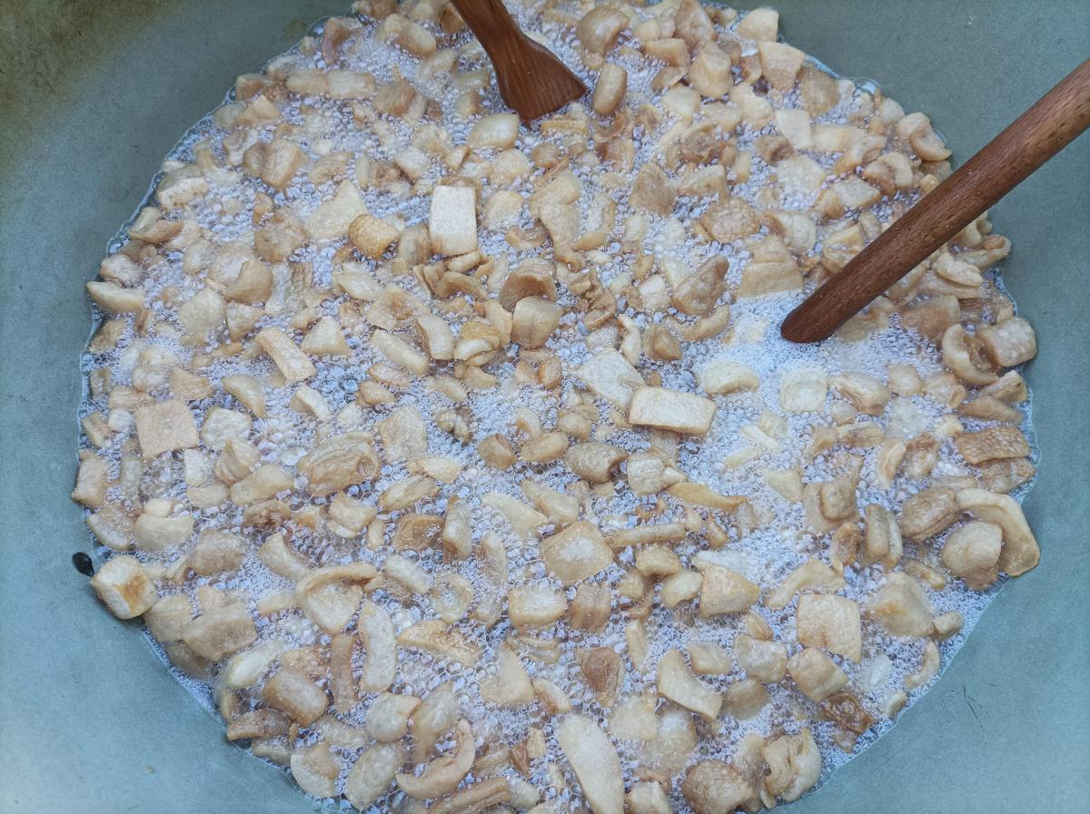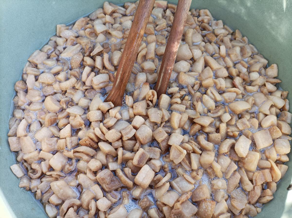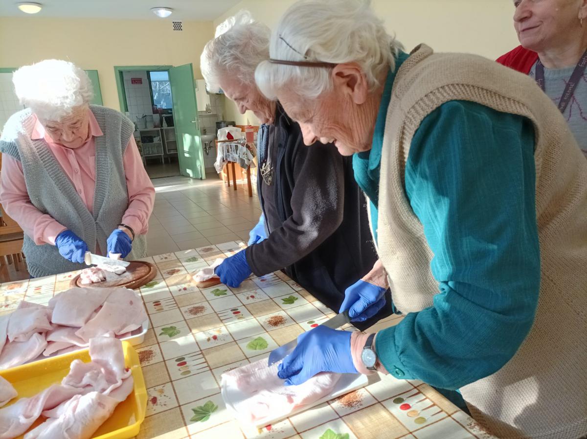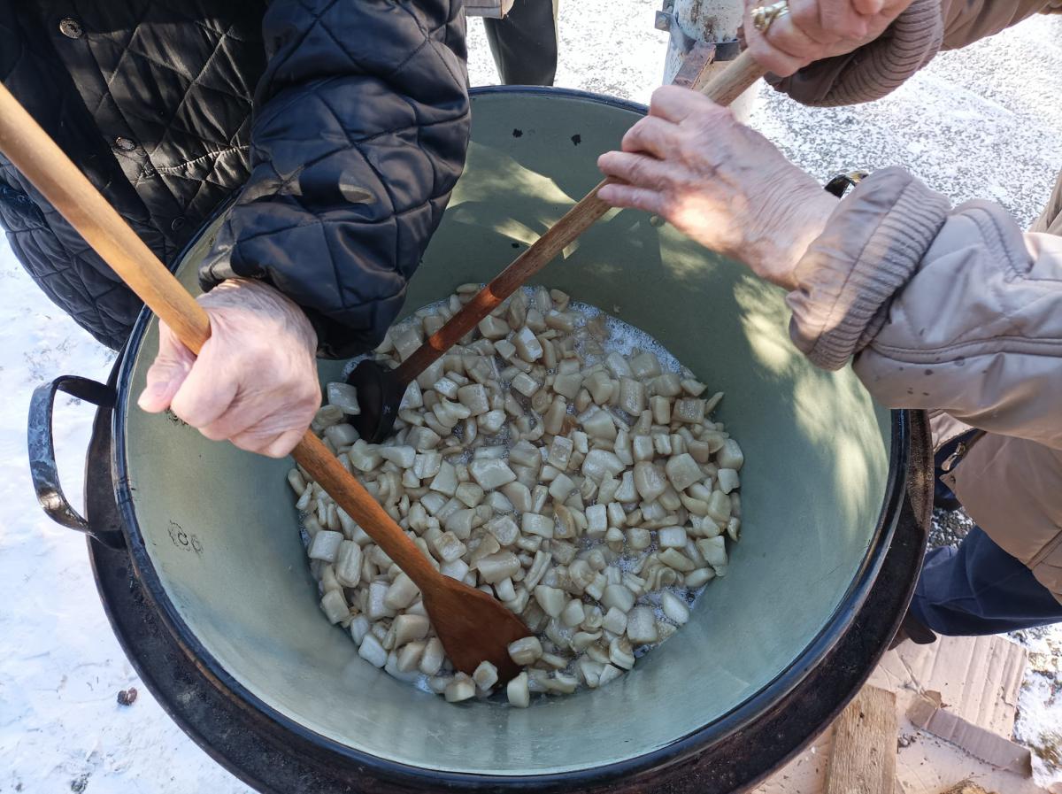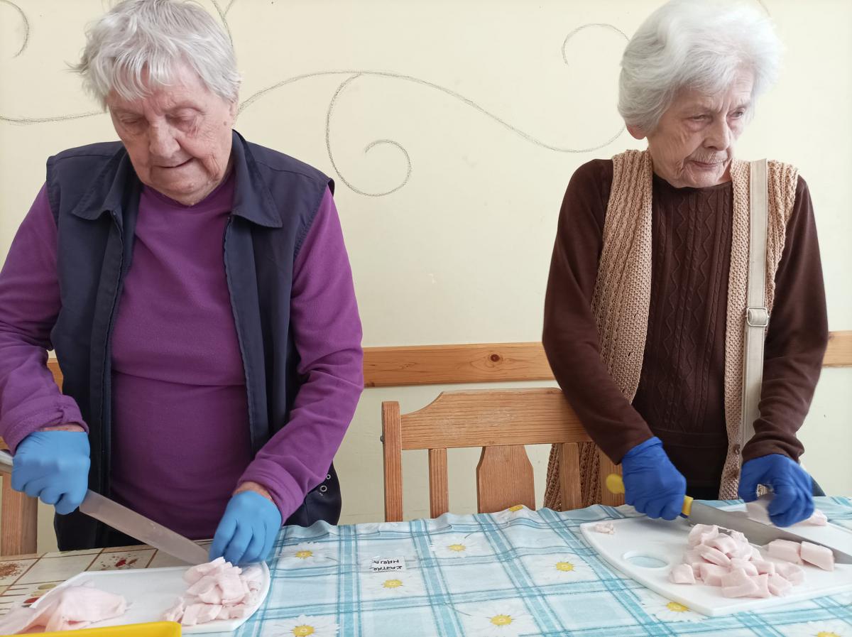 A zsír vágása, katlanban sütése, illata, a sütés mozdulatai emlékeket idézték fel szinte mindenkiben. Az idősek saját történeteiket, sütési fortélyaikat mesélték. A hideg miatt az ebédlőben maradt időseink népdalokat énekeltek. A friss töpörtyű vacsorára került lakóink asztalára.