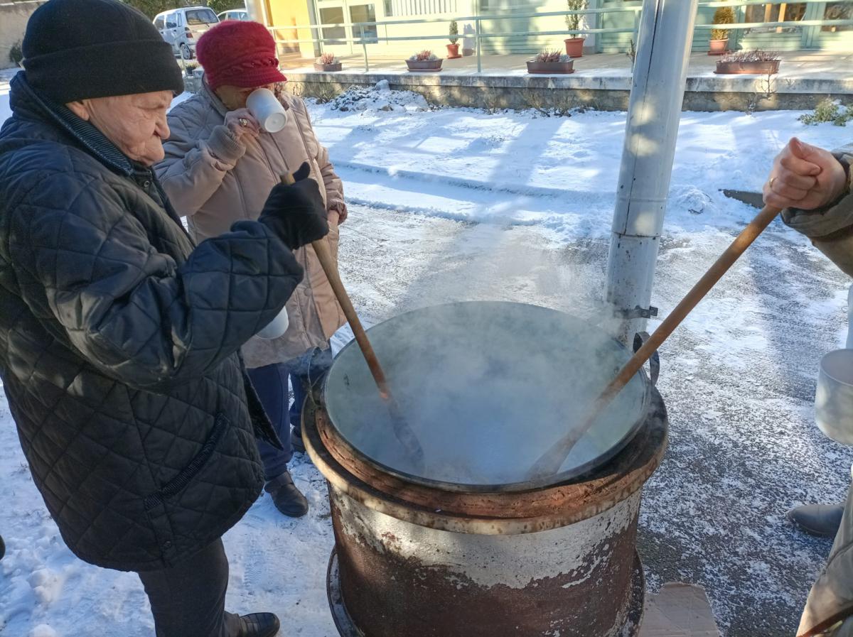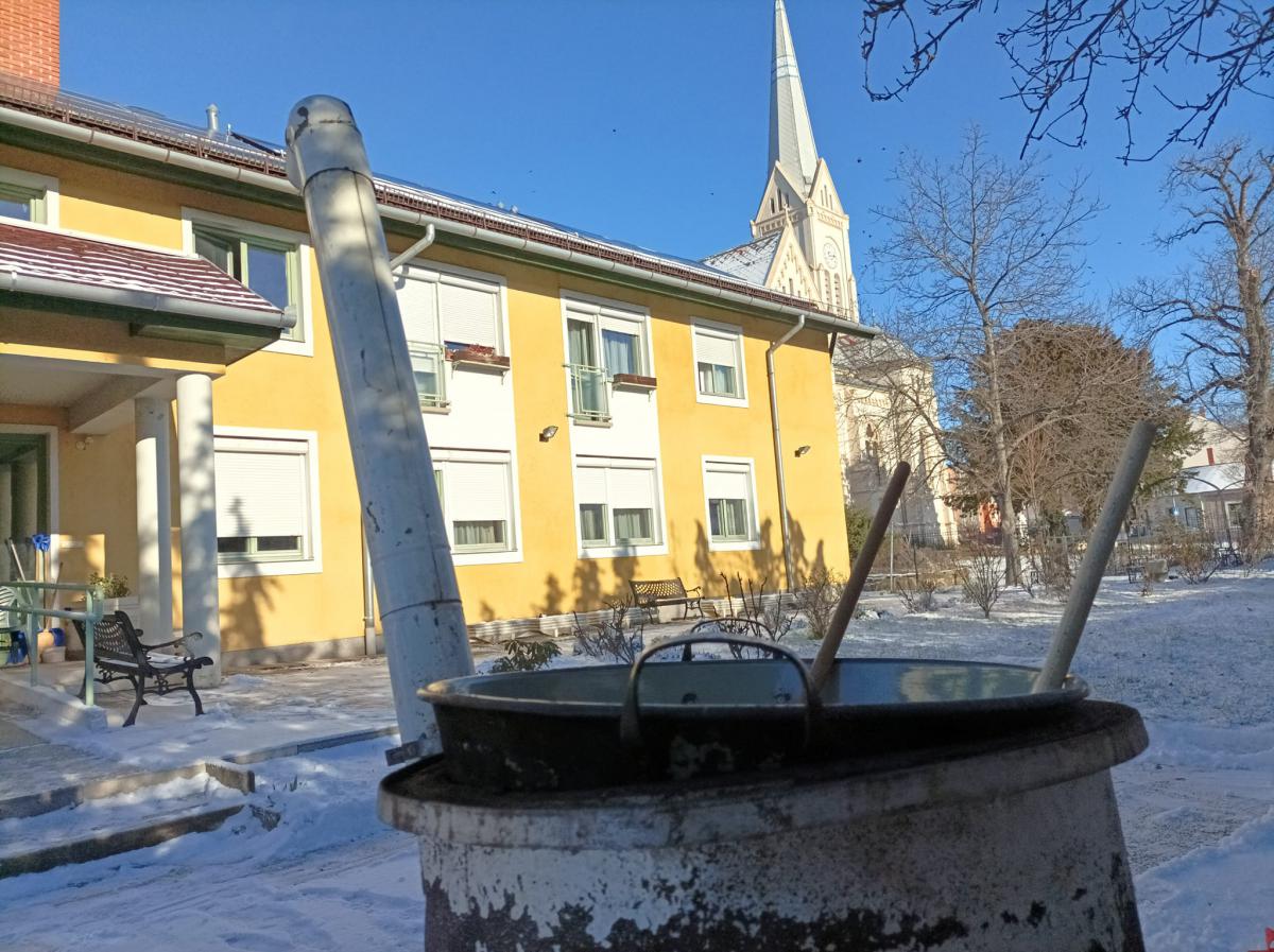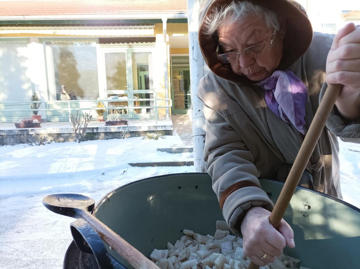 A Túróczy otthon idős lakói zsírt sütöttek. A hideg, havas délelőtt segített megteremteni a régi disznóölés hangulatát.