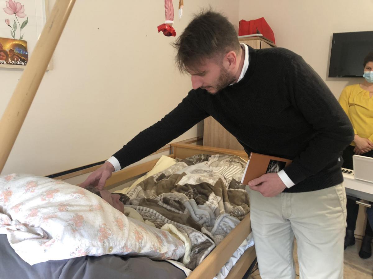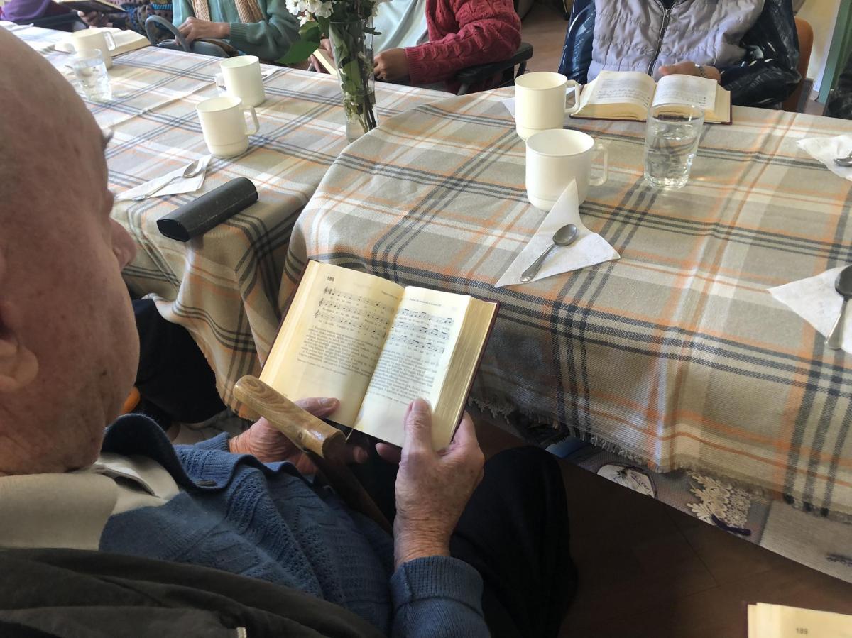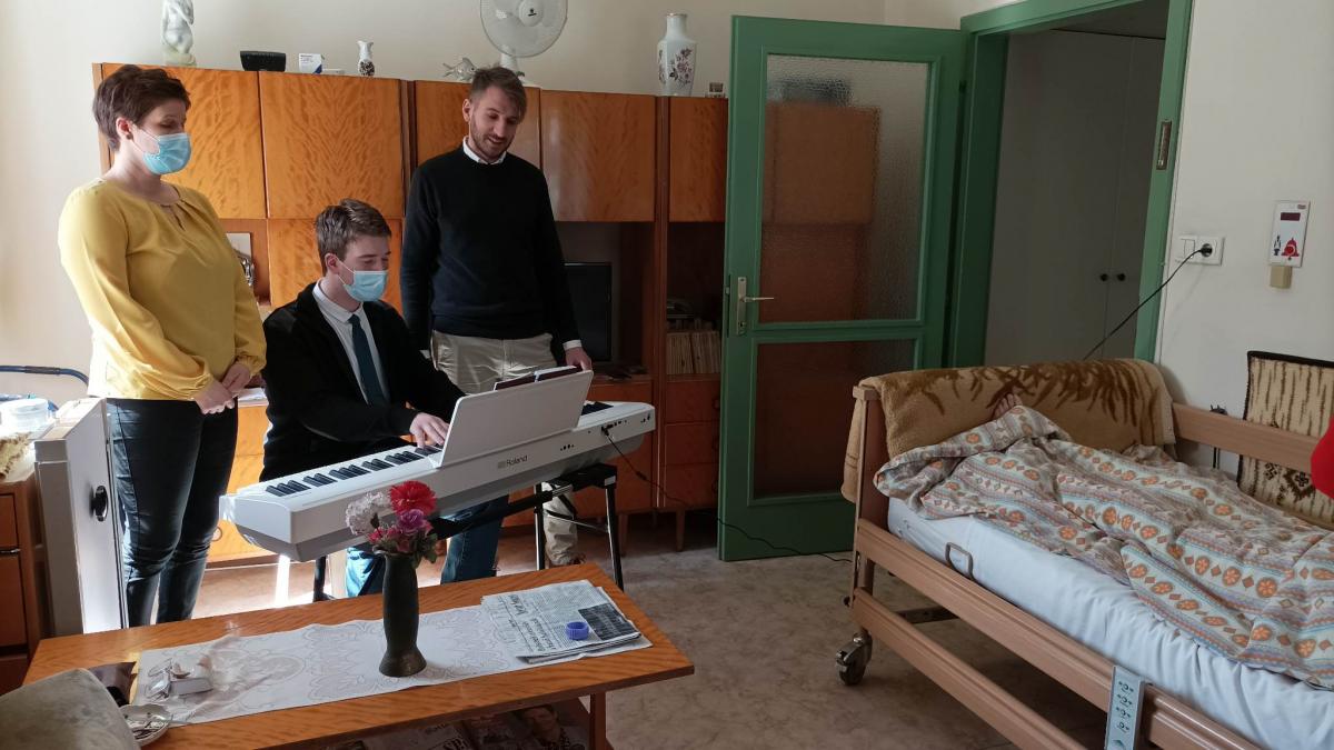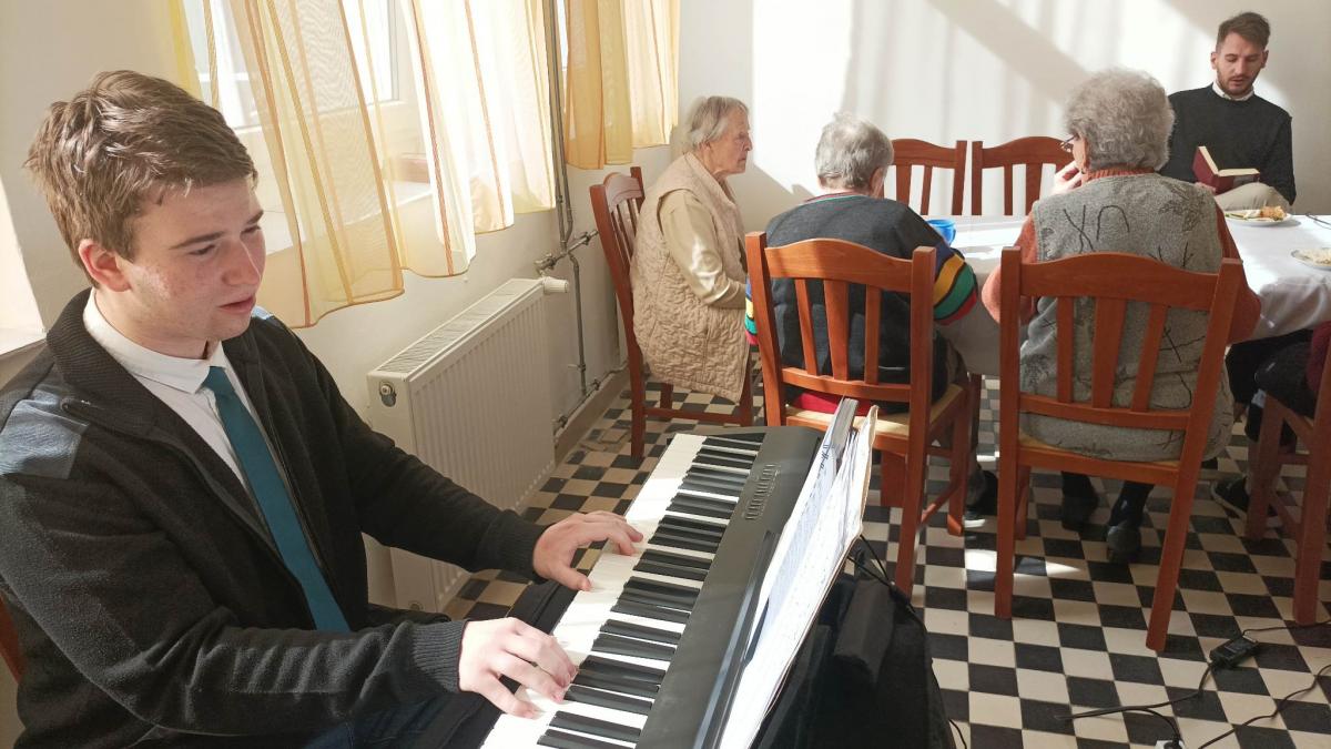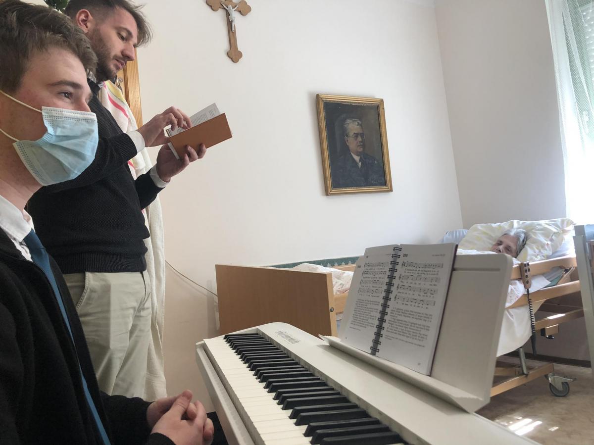 Fekvőbetegeinknek, akik szobáikat nem tudják elhagyni pedig énekszóval kedveskedtek vendégeink, Tamástól áldást is kaptak.