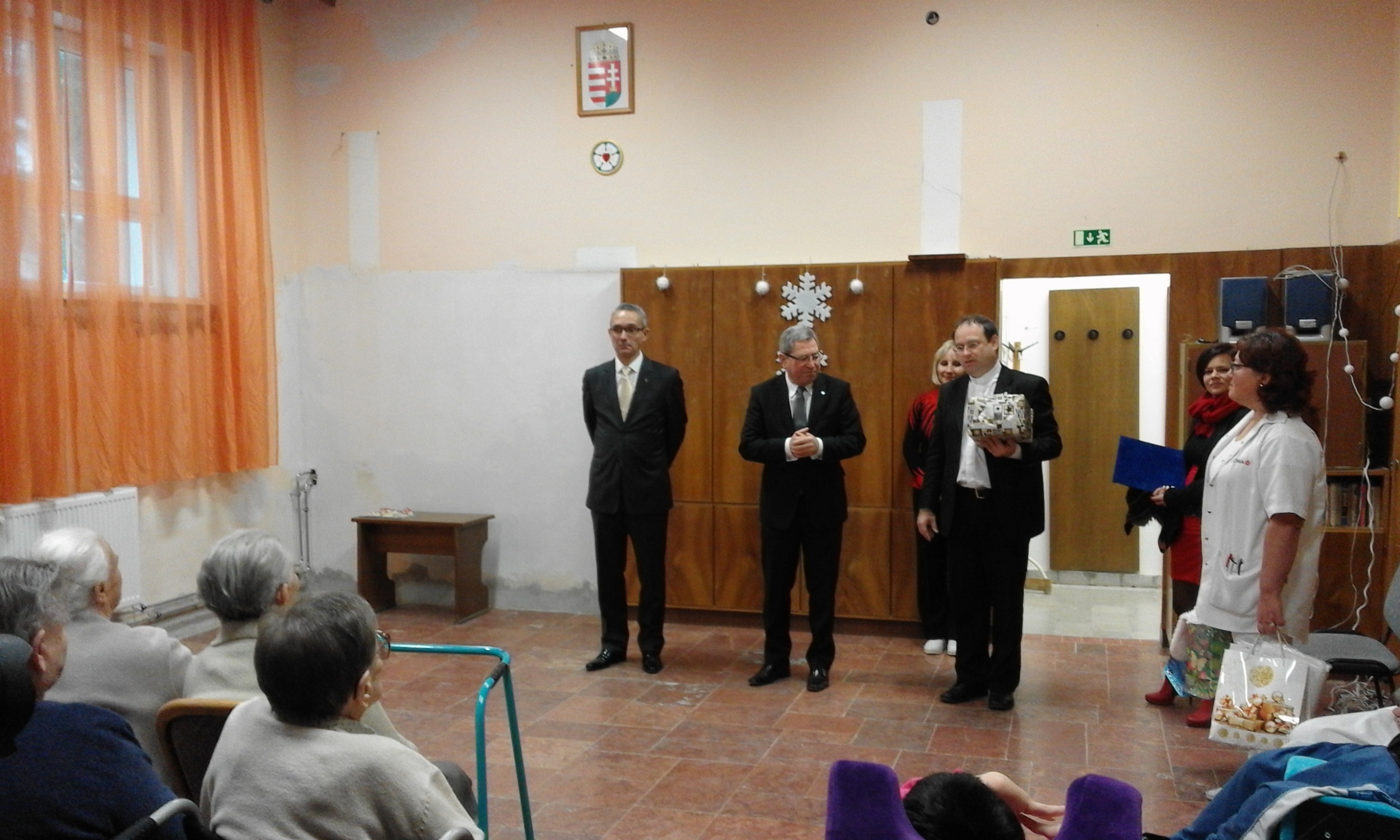 Kellemes karácsonyi ünnepeket kívánt a lakóknak és a ott dolgozóknak, majd átadta ajándékait Gregersen-Labossa György lelkész úrnak, aki hálás szívvel köszönte meg.