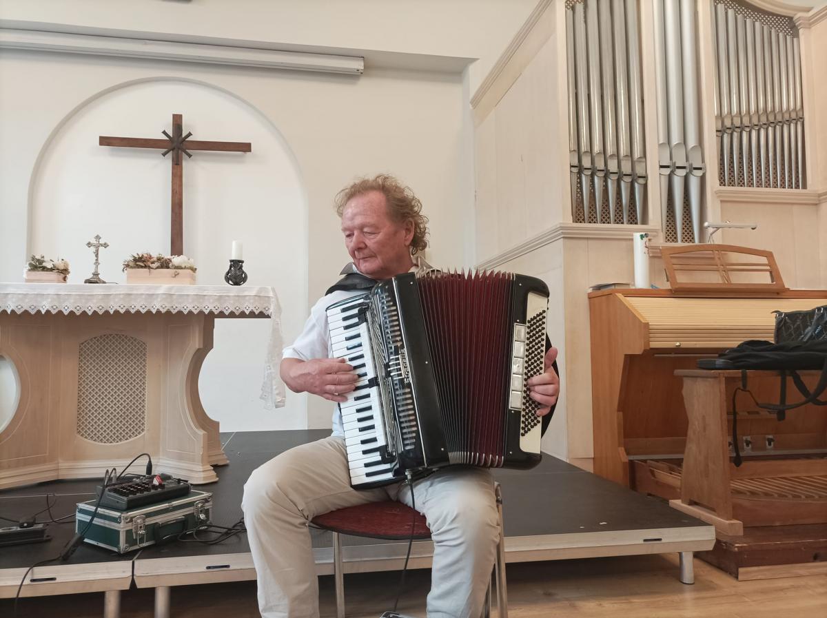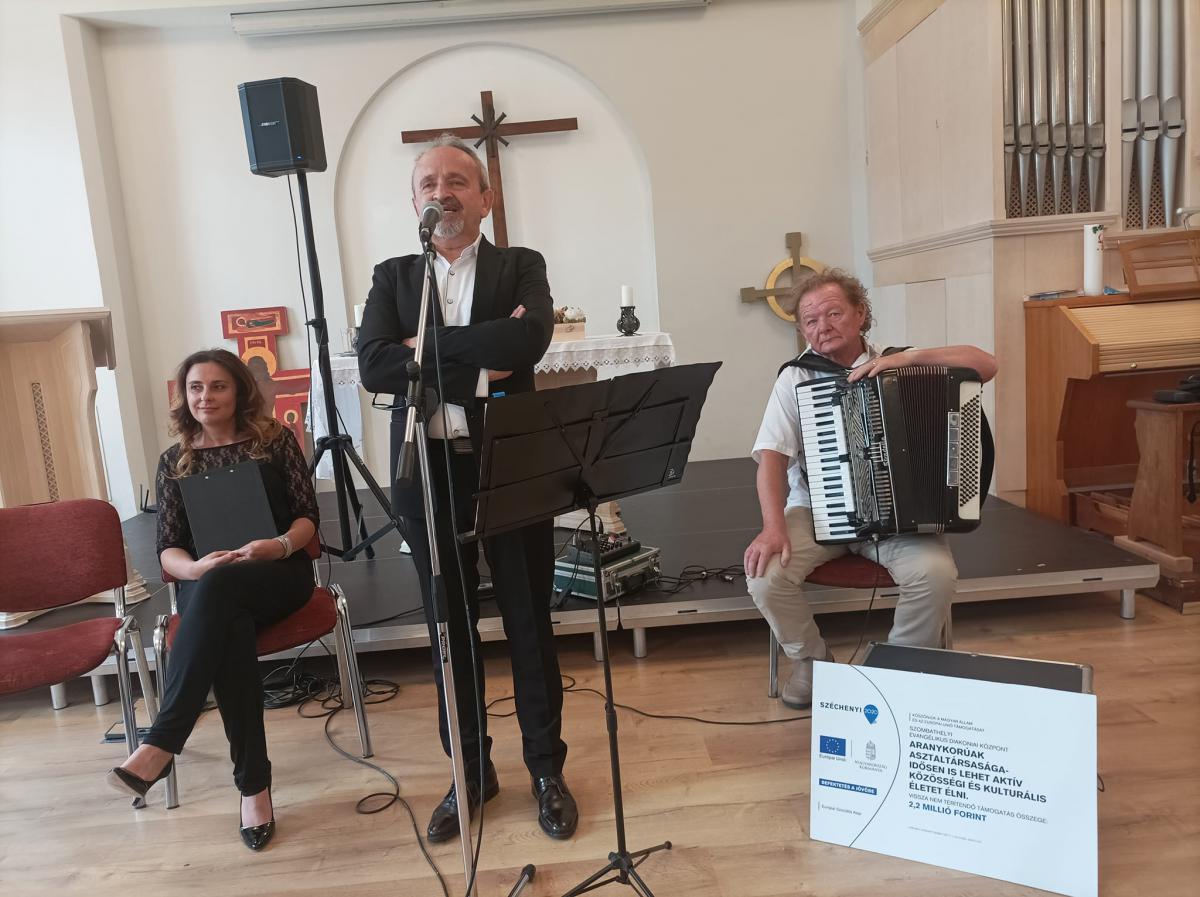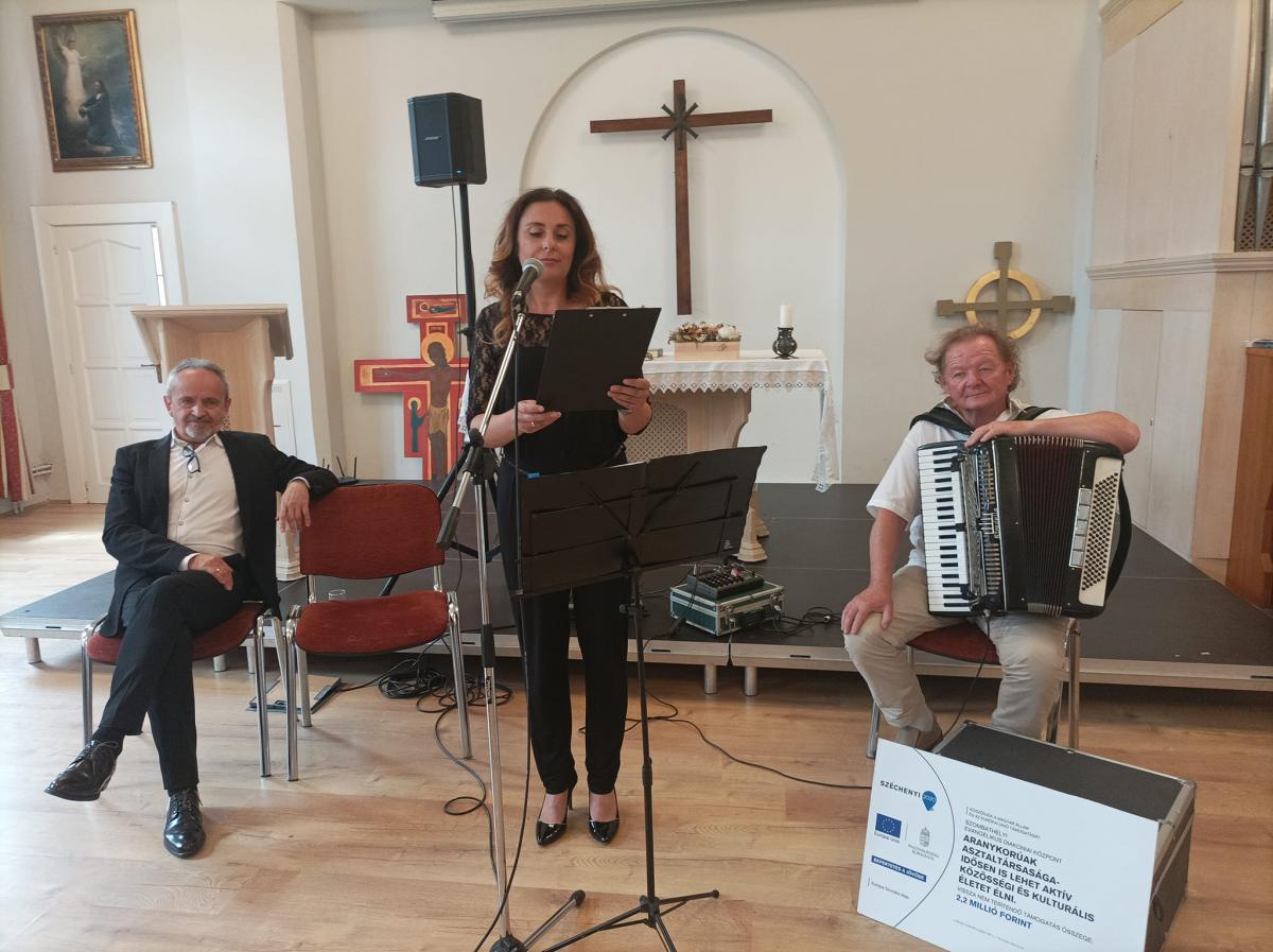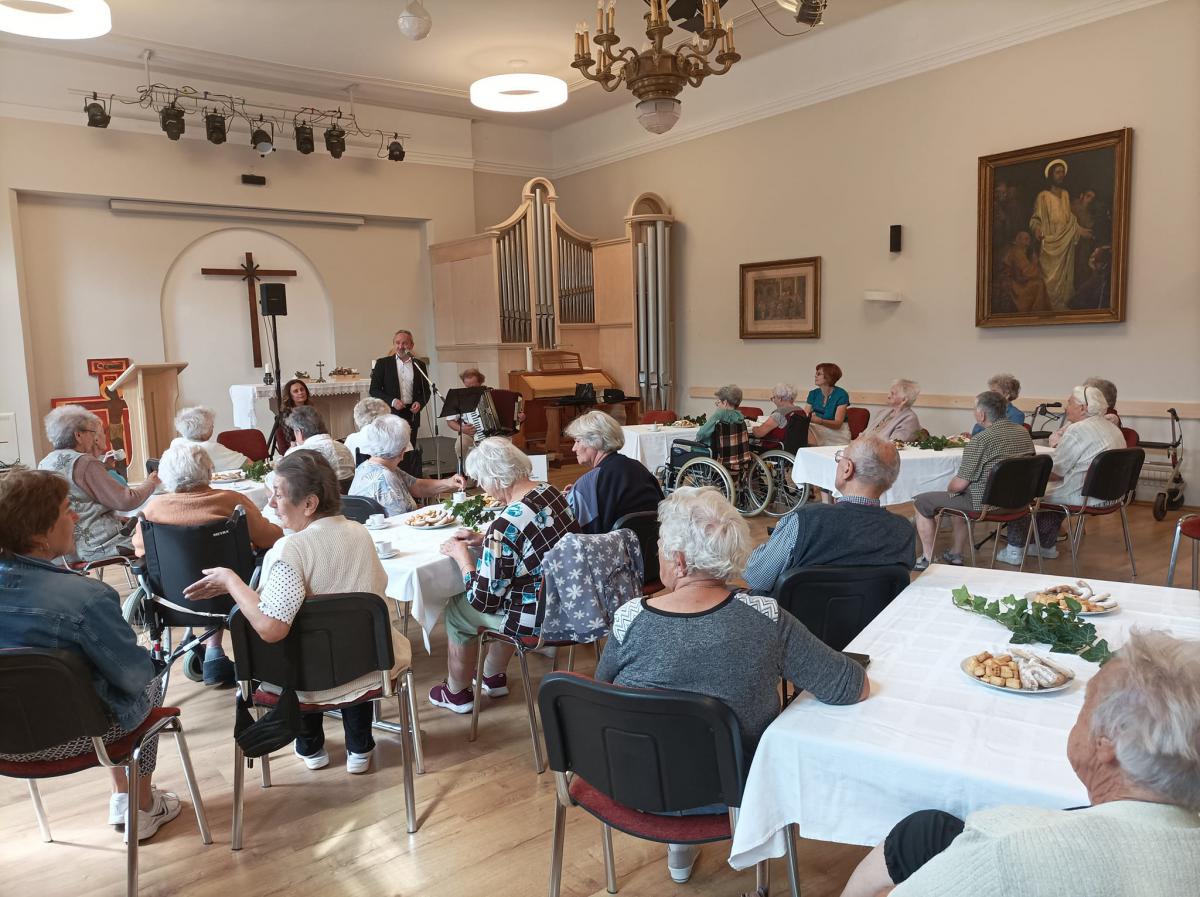 Az intézményünk idős lakói az evangélikus Kápolnában jöttek össze, ahol Szabó Tibor, a Weöres Sándor Színház igazgatója, felesége Bálint Éva színésznő előadásukkal és Peltzer Géza harmonikájával tette mindannyiunk számára érezhetővé és tapinthatóvá, hogy a színház összeköt minket. Lehet nélküle élni, de nem érdemes. Vendégeink zenével, verssel, történetekkel varázsoltak felejthetetlen élményt lakóink számára. A középpontban a szerelem állt. A hálás közönség többek között hallhatta a Meseautót, az O Sole Mio-t, s még nagy sok slágert. Ez az utolsó záró alkalom is bizonyította, hogy idősen is lehet aktív közösségi és kultúrális életet élni.