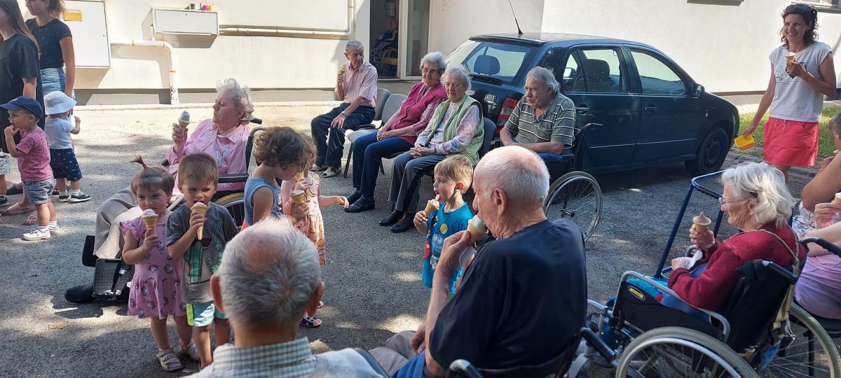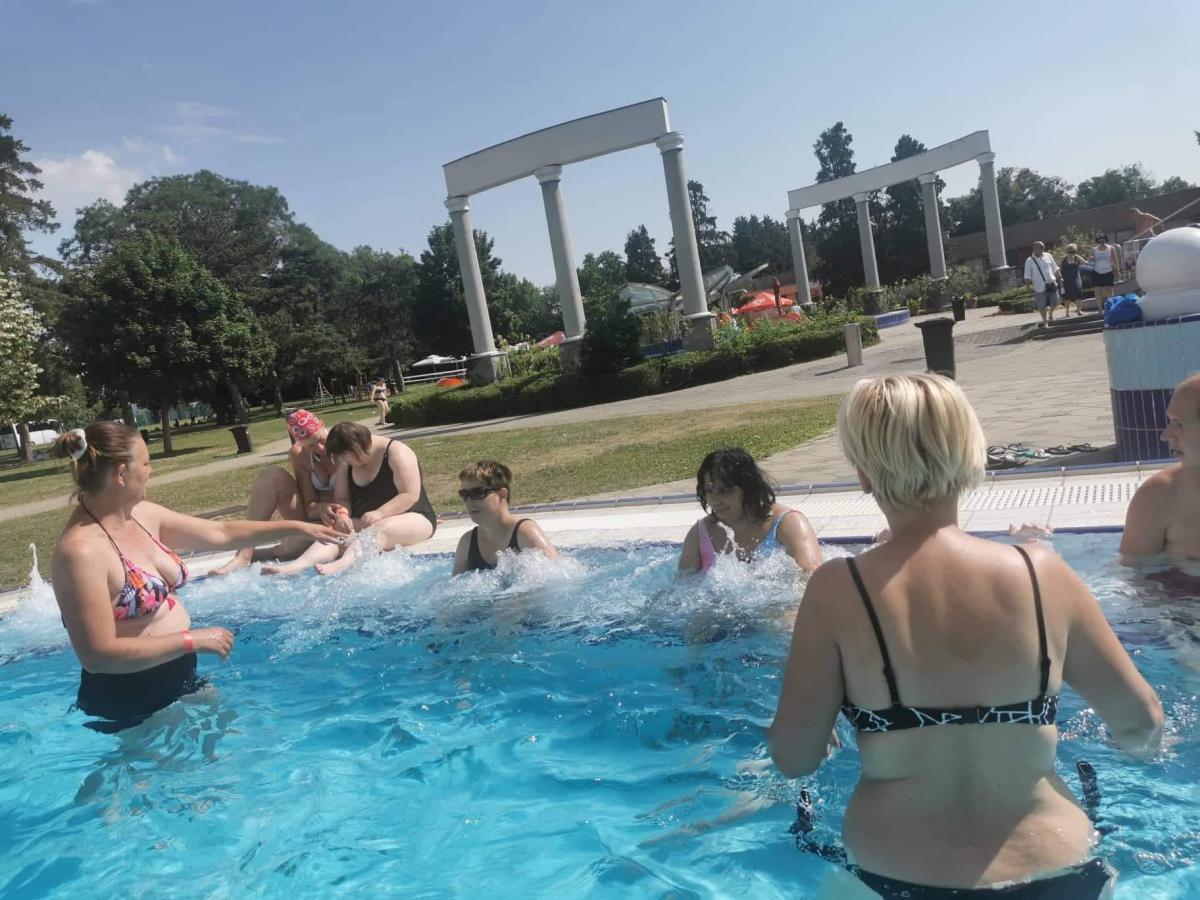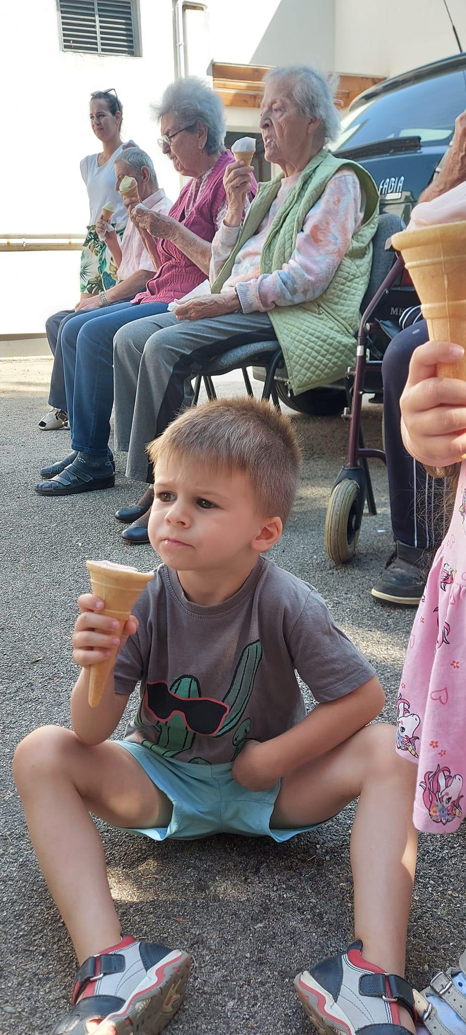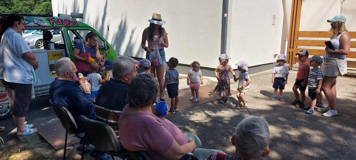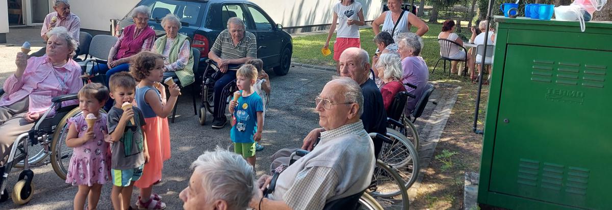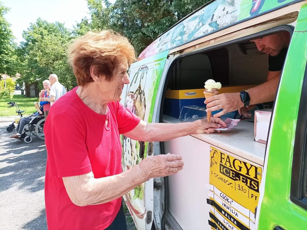 Míg idén először strandoltunk a fogyatékkal élő lakóinkkal a Termálfürdőben, addig az idős lakóink és kis bölcsiseink fagyiztak a forró nyári délelőttön.
