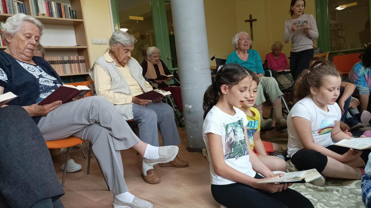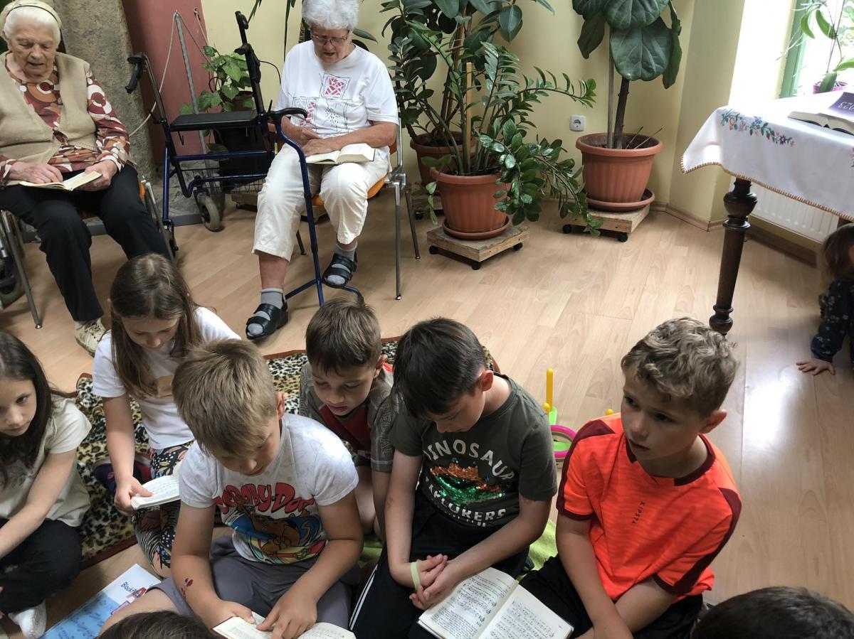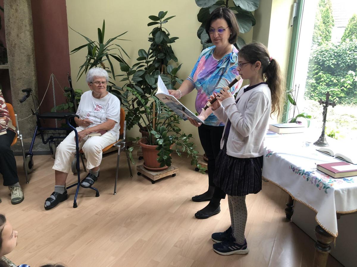 A közös lelki alkalom után mesével, zenével, tánccal kedveskedtek a szépkorúaknak a gyerekek. Tinicsné Berta Brigitta tanító néni pedig Grecsó Krisztián novelláskötetéből olvasott fel lakóinknak, sőt a kötetet oda is ajándékozta, hogy időseink olvasgathassák a szívet melengető, és olykor szívbe markoló történeteket.